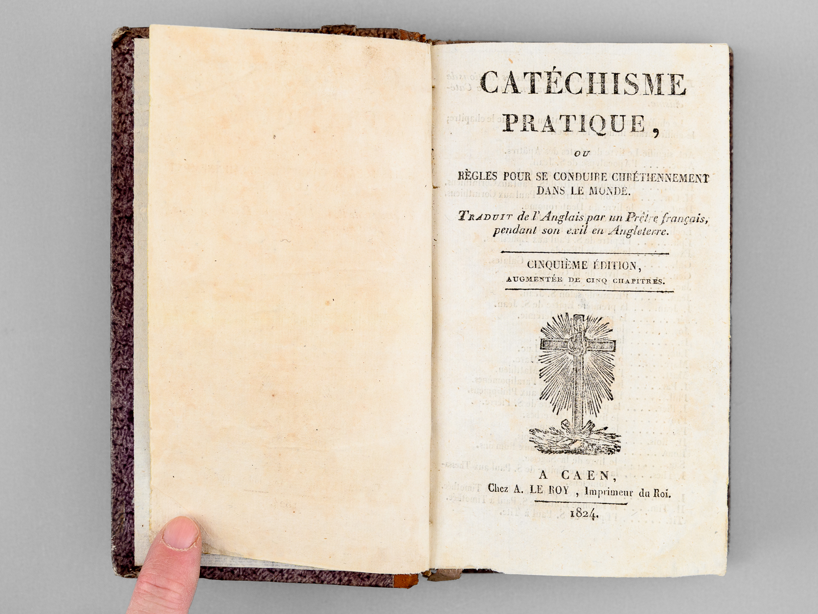 Traduit de l'Anglais par un Prêtre français, pendant son exil en Angleterre, Cinquième édition, augmentée de cinq chapitres, 1 vol. in12 rel. demi-basane brune, dos lisse orné, Chez A. Le Roy, Caen, 1824, 463 pp. Commentaire : Etat très satisfaisant (couv. lég. frottée sur bords, bon état par ailleurs).
