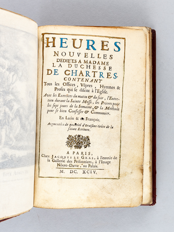 Heures Nouvelles dédiées à Madame la Duchesse de Chartres. Contenant Tous les Offices, Vêpres, Hymnes & Proses qui se disent à l'Eglise. - Auteur: Collectif - Année d'édition: 1694 |