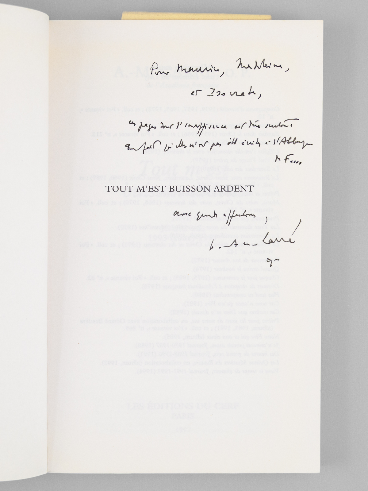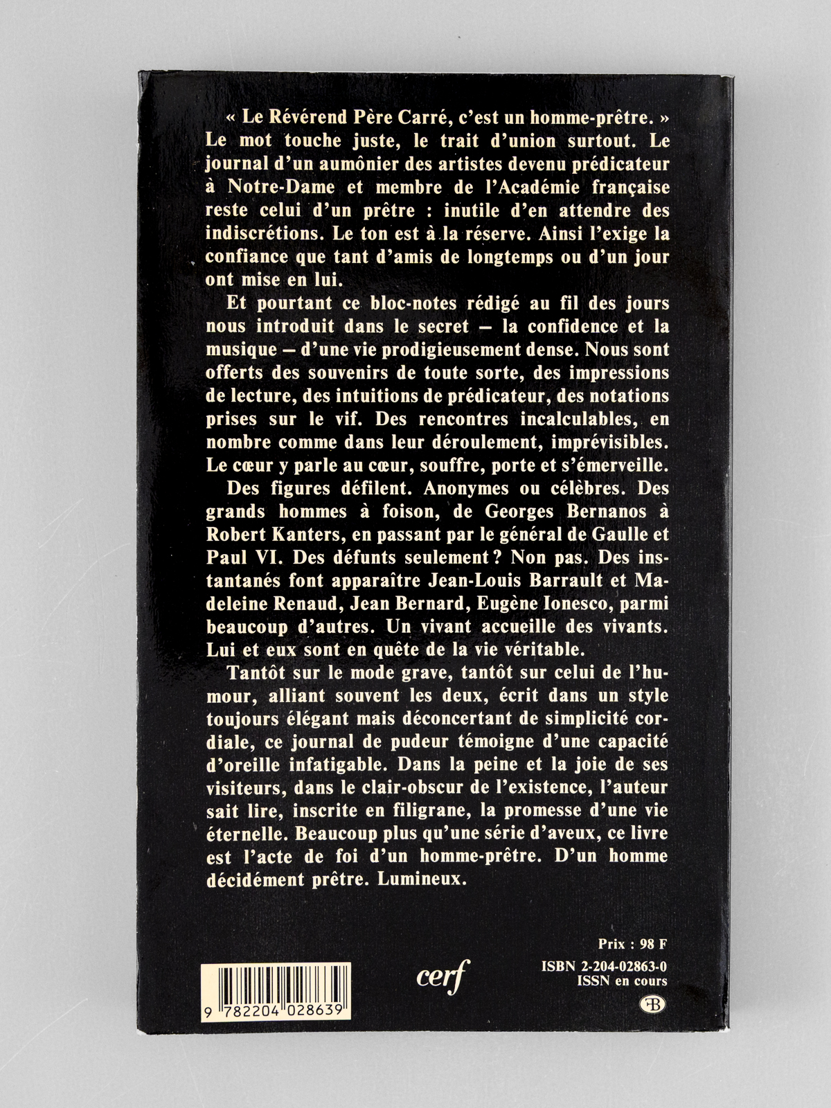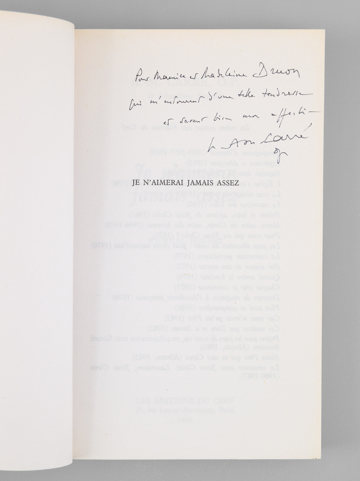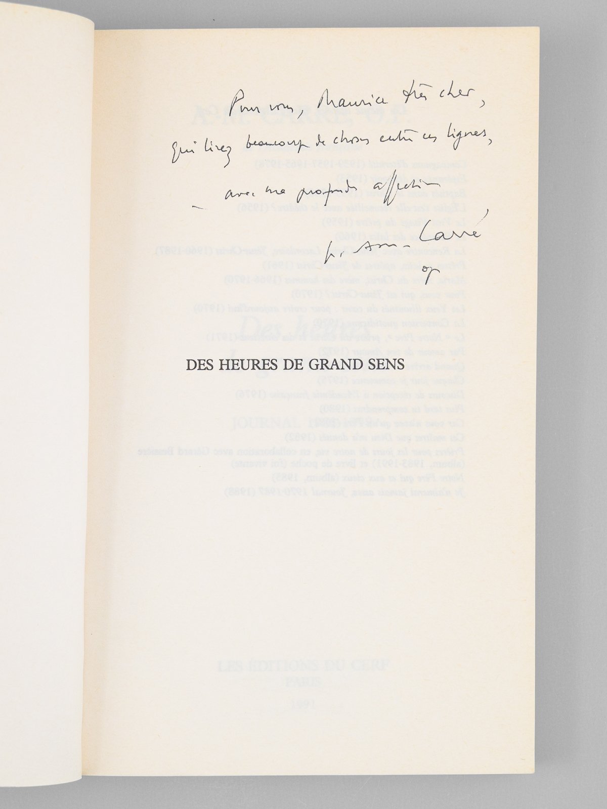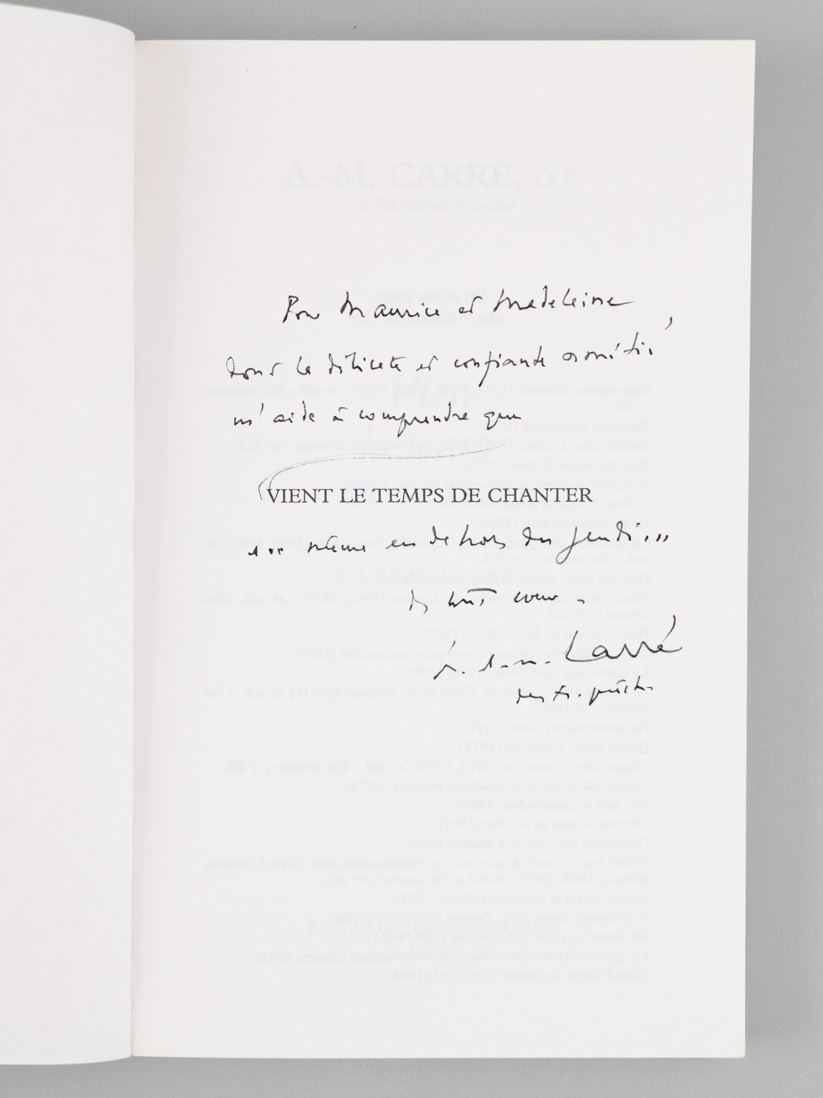 Commentaire : Ensemble des 4 tomes couvrant 28 ans de mémoires (1970-1997) du père Carré. Envois de l'auteur à Maurice Druon : 'Pour Maurice et Madeleine Druon, qui m'entourent d'une telle tendresse, et savent bien mon affection' ; 'Pour vous, Maurice très cher, qui lisez beaucoup de choses entre ces lignes Avec ma profonde affection' ; 'Pour Maurice et Madeleine, dont la délicate et confiante amitié, m'aide à comprendre que vient le temps de chanter, même en dehors du Jeudi'; 'Pour Maurice, Madeleine et Isocrate, ces pages dont l'insuffisance est due surtout au fait qu'elles n'ont pas été écrites à l'Abbaye de F...'. Le Jeudi mentionné dans la troisième dédicace fait certainement référence aux Jeudis de l'Académie Française. Quant à 'l'Abbaye de F...', il s'agit naturellement de l'ancienne abbaye cistercienne de Faize, en Gironde, où Maurice Druon s'était retiré. Bon état (pages d'intérêt volontairement écornées par aurice Druon). Maurice Druon (1918-2009), neveu de Joseph Kessel, fut résistant, écrivain auteur notamment de la saga des Rois maudits, homme politique. Elu à l'Académie Française en 1968, il en devint le Secrétaire Perpétuel en 1985. Le père Carré, quant à lui, fut élu en 1975, au fauteuil du Cardinal Daniélou, qui sera occupé ensuite par René Girard. Avec la dernière dédicace, on comprend qui est l'académicien évoqué à la dernière page du livre...