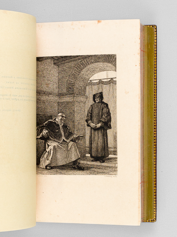 Compositions par J.-P. Laurens, gravés à l'eau-forte par Léopold Flameng, tirage à petit nombre sur papier Turkey Mill, 1 vol. in-8 reliure de l'époque plein maroquin bordeaux sous étui bordé, dos à 5 nerfs, plats estampés à froid, double filet doré en coupes, chasses richement ornées, gardes doublées de vélin, toutes tranches dorées, reliure signée de Raparlier, A. Quantin, Ancienne Maison Claye, Paris, 1878, 4 ff., XIX pp., 4 ff., 406 pp. et 1 f. n. ch., avec 10 gravures hors texte en deux états (avant la lettre et avec la lettre)