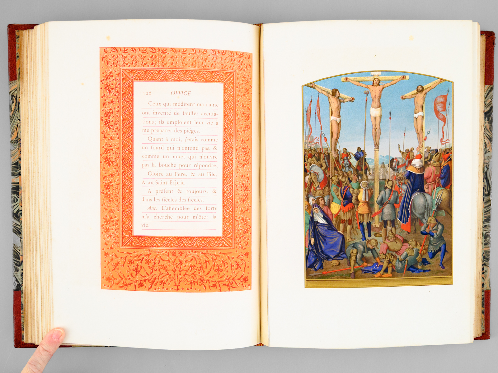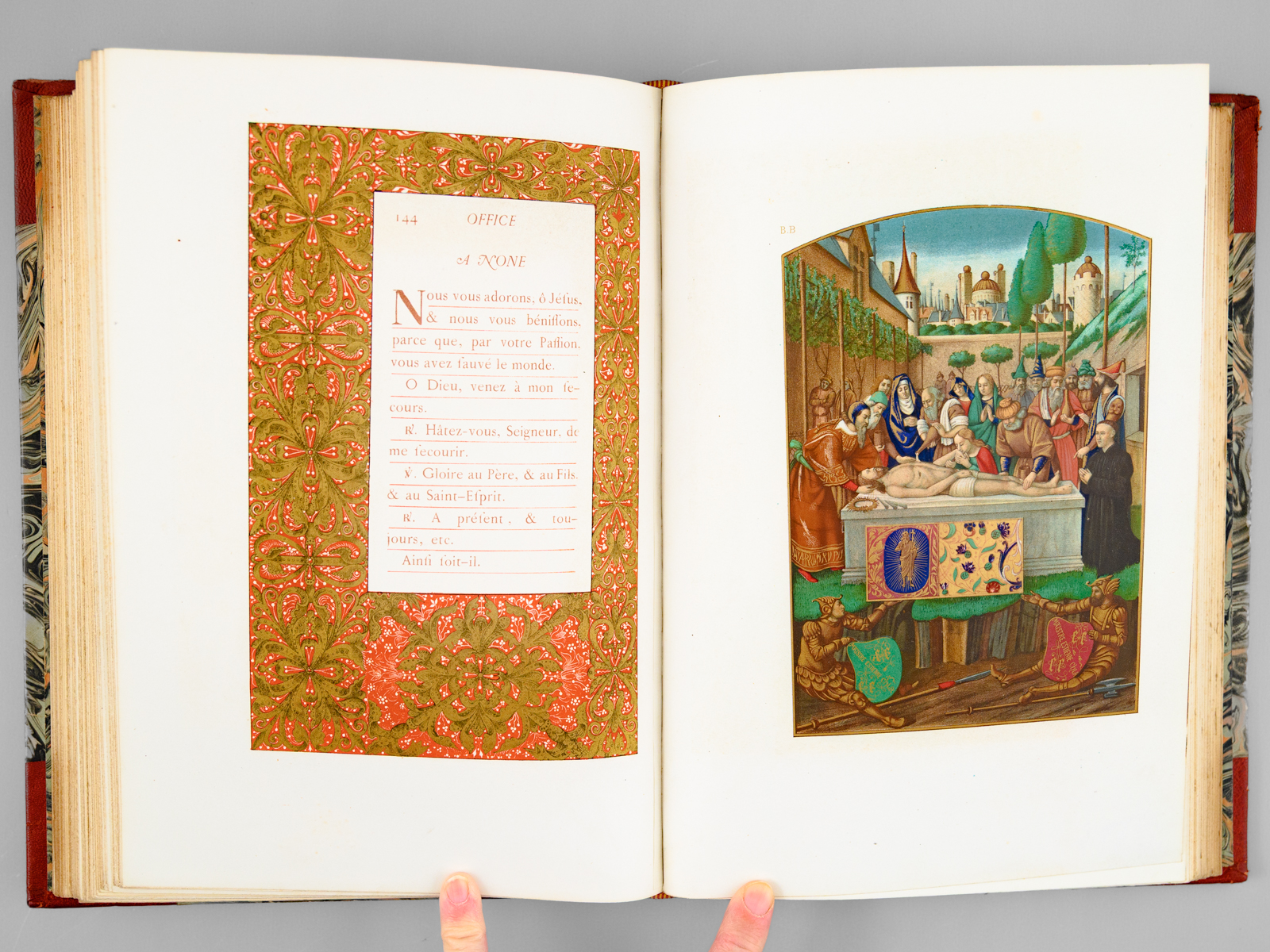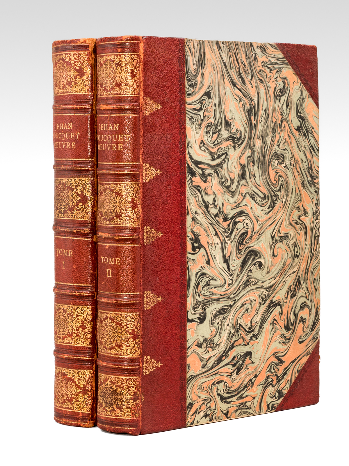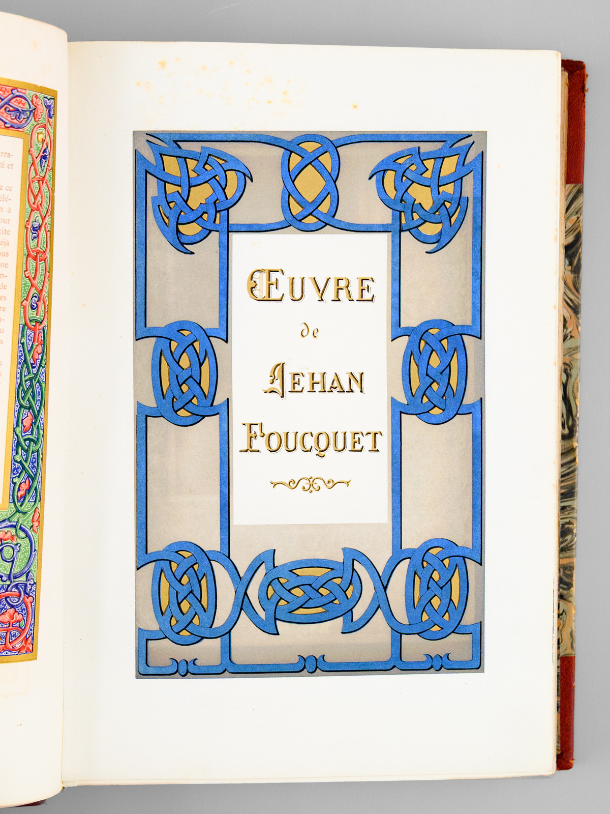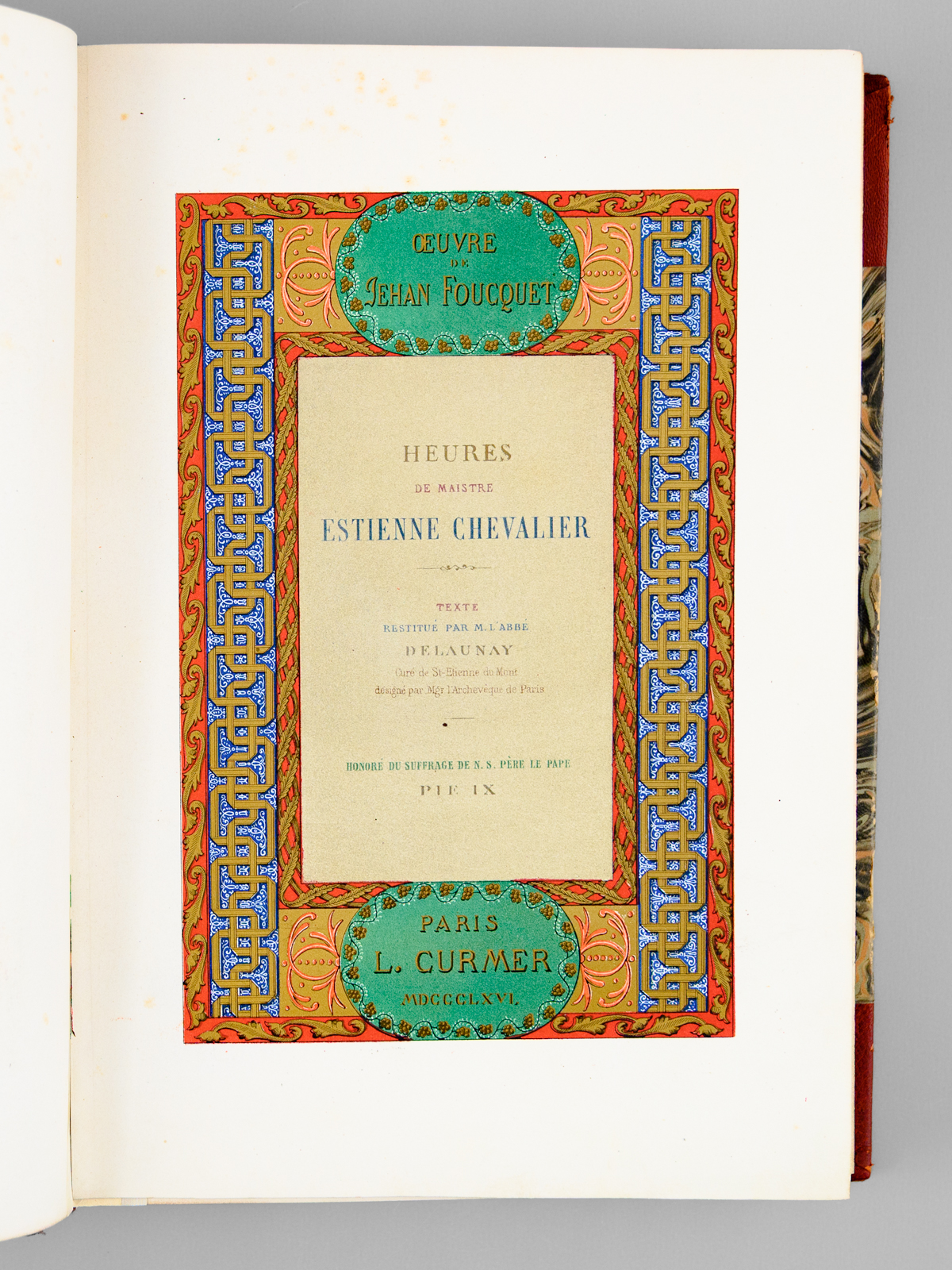 Texte restitué par M. l'Abbé Delaunay, Curé de St Etienne du Mont, Honoré du Suffrage de N.S. Père le Pape Pie IX, 2 vol. in-4 reliure postérieure demi-chagrin à coins rouge, dos à 5 nerfs dorés orné, mors dorés et estampés à froid, L. Curmer, 1866 - 1867, Tome I : 12 ff., 214 pp. et 4 ff. n. ch. avec portrait du Pape Pie IX et 53 chromolithographies hors texte ; Tome II : Liste des souscripteurs, la préface, la biographie de Jehan Foucquet, description de ses oeuvres, celle des miniatures reproduites dans le premier tome, une notice sur ses oeuvres présumées, l'opinion de la presse sur l'ouvrage, une description des ornements accompagnant le texte et 4 tables, avec 1 figure dessiné par Fossey gravée par Colin tirée sur chine, 5 chromolithographies hors texte et 17 titre en chromo, portrait de femme par Pauquet sur Chine rapporté dans le texte à la fin de la préface