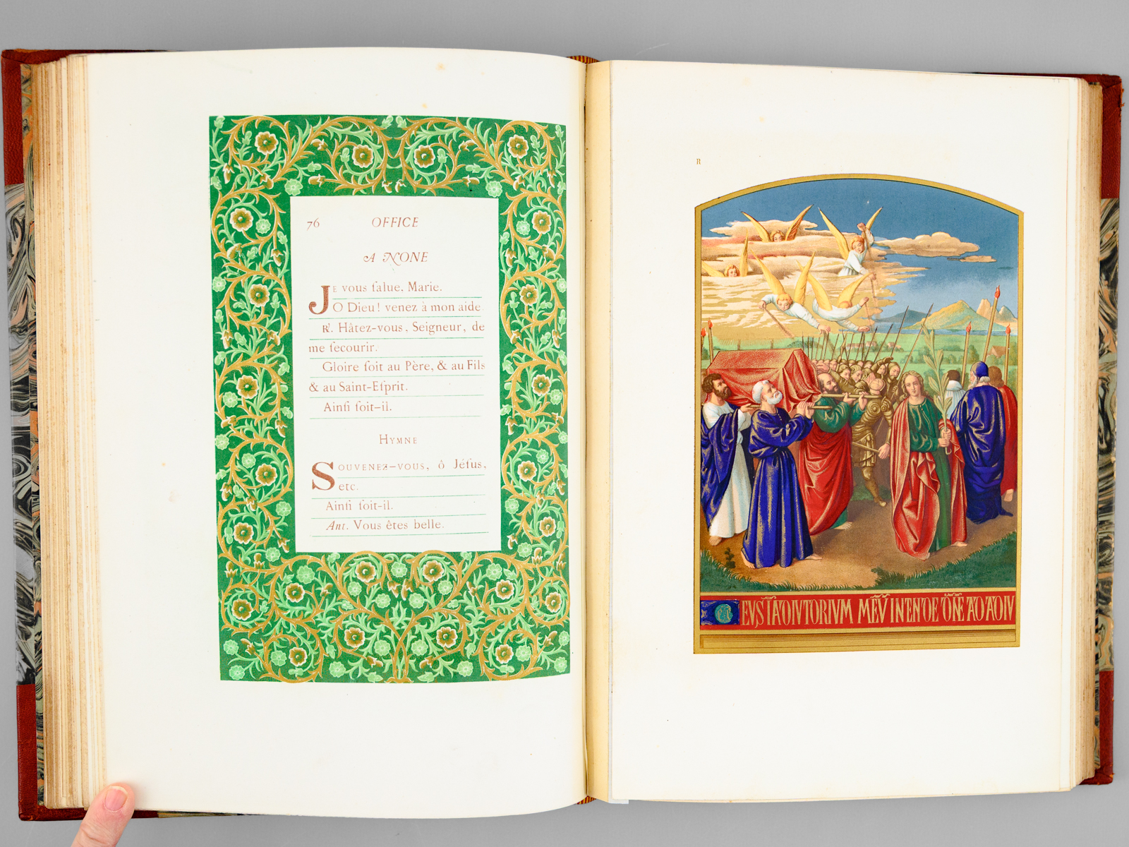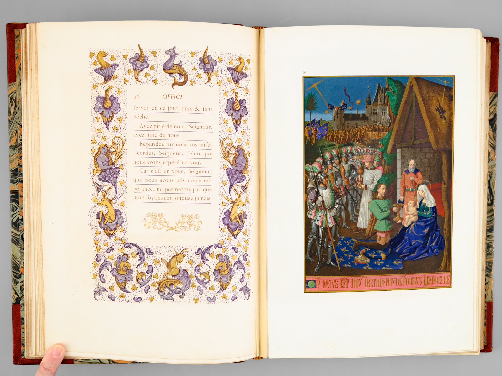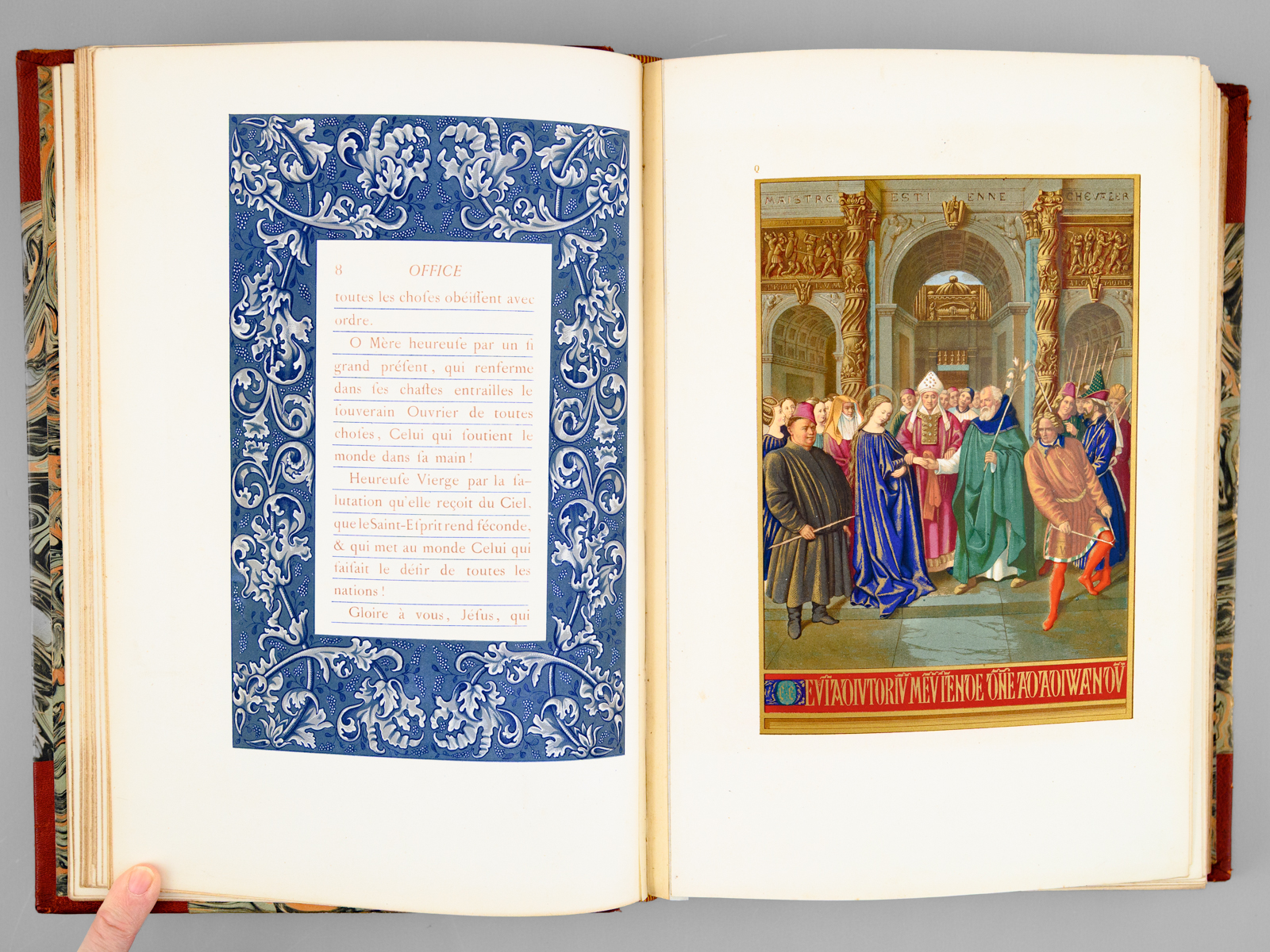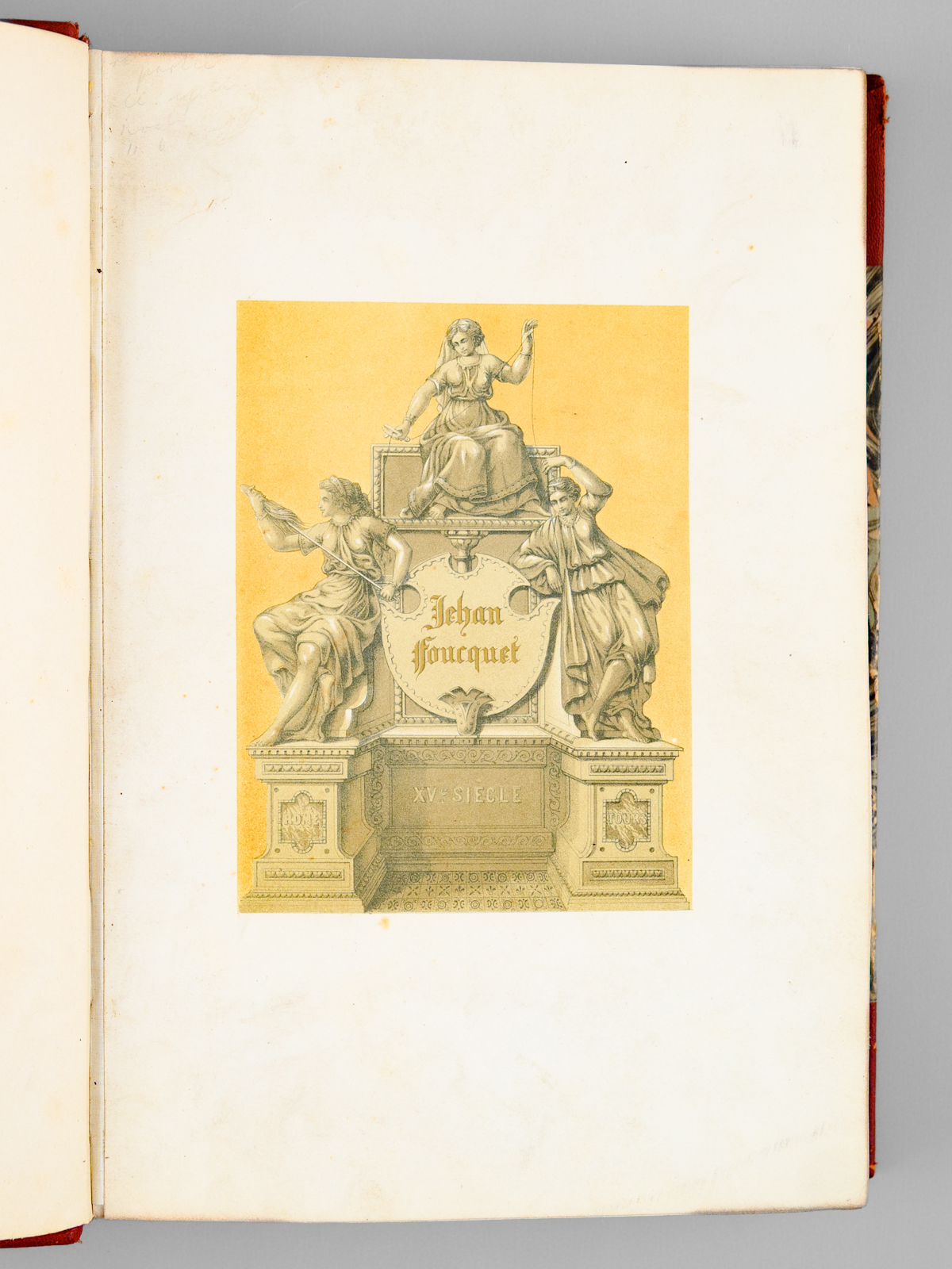 Texte restitué par M. l'Abbé Delaunay, Curé de St Etienne du Mont, Honoré du Suffrage de N.S. Père le Pape Pie IX, 2 vol. in-4 reliure postérieure demi-chagrin à coins rouge, dos à 5 nerfs dorés orné, mors dorés et estampés à froid, L. Curmer, 1866 - 1867, Tome I : 12 ff., 214 pp. et 4 ff. n. ch. avec portrait du Pape Pie IX et 53 chromolithographies hors texte ; Tome II : Liste des souscripteurs, la préface, la biographie de Jehan Foucquet, description de ses oeuvres, celle des miniatures reproduites dans le premier tome, une notice sur ses oeuvres présumées, l'opinion de la presse sur l'ouvrage, une description des ornements accompagnant le texte et 4 tables, avec 1 figure dessiné par Fossey gravée par Colin tirée sur chine, 5 chromolithographies hors texte et 17 titre en chromo, portrait de femme par Pauquet sur Chine rapporté dans le texte à la fin de la préface