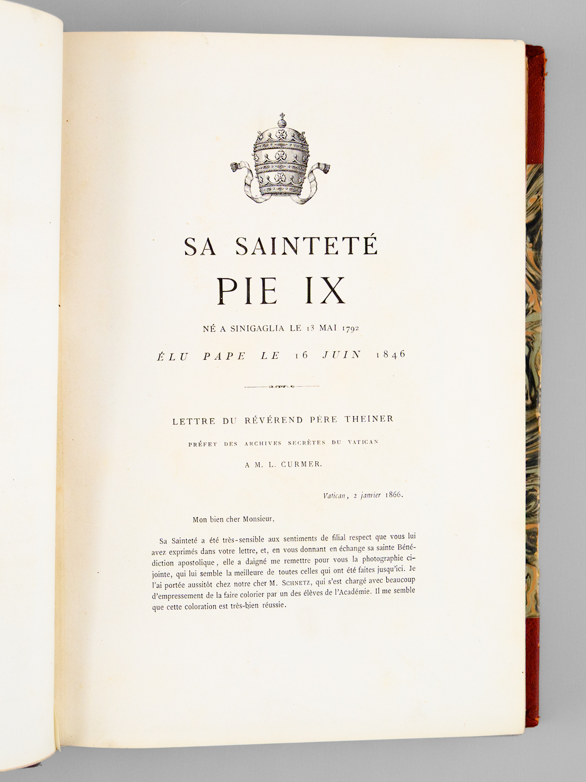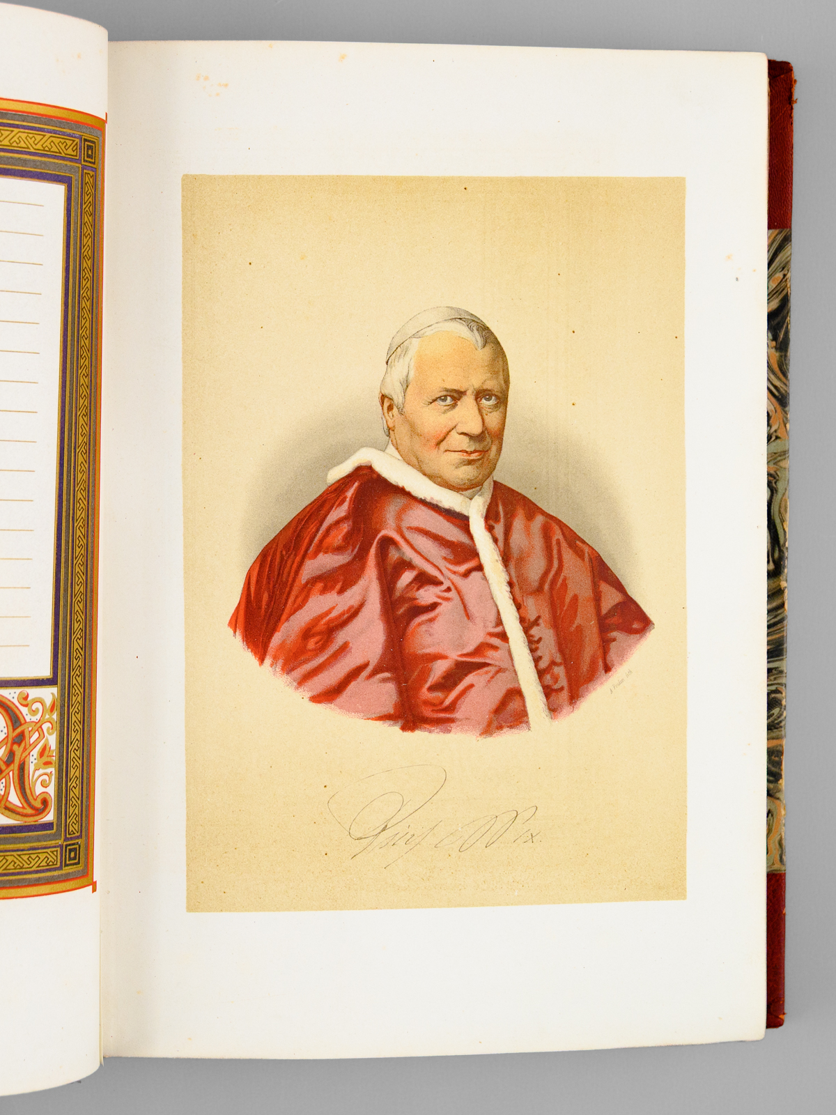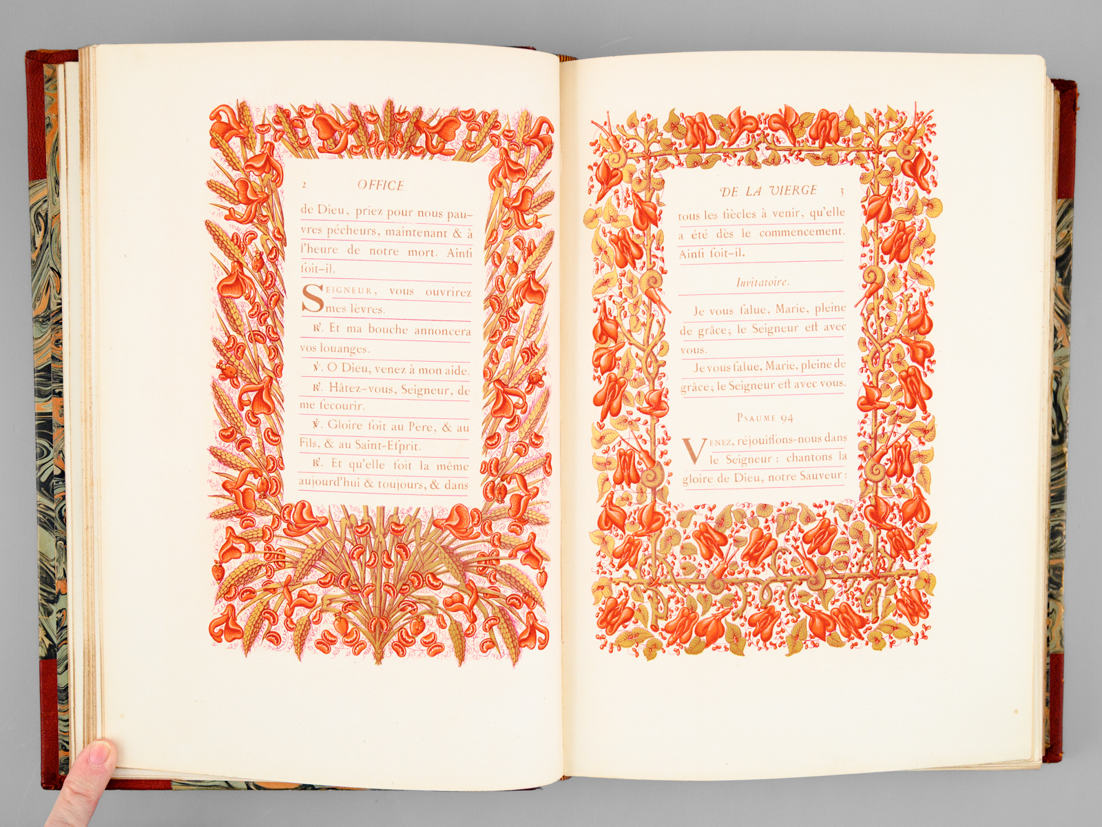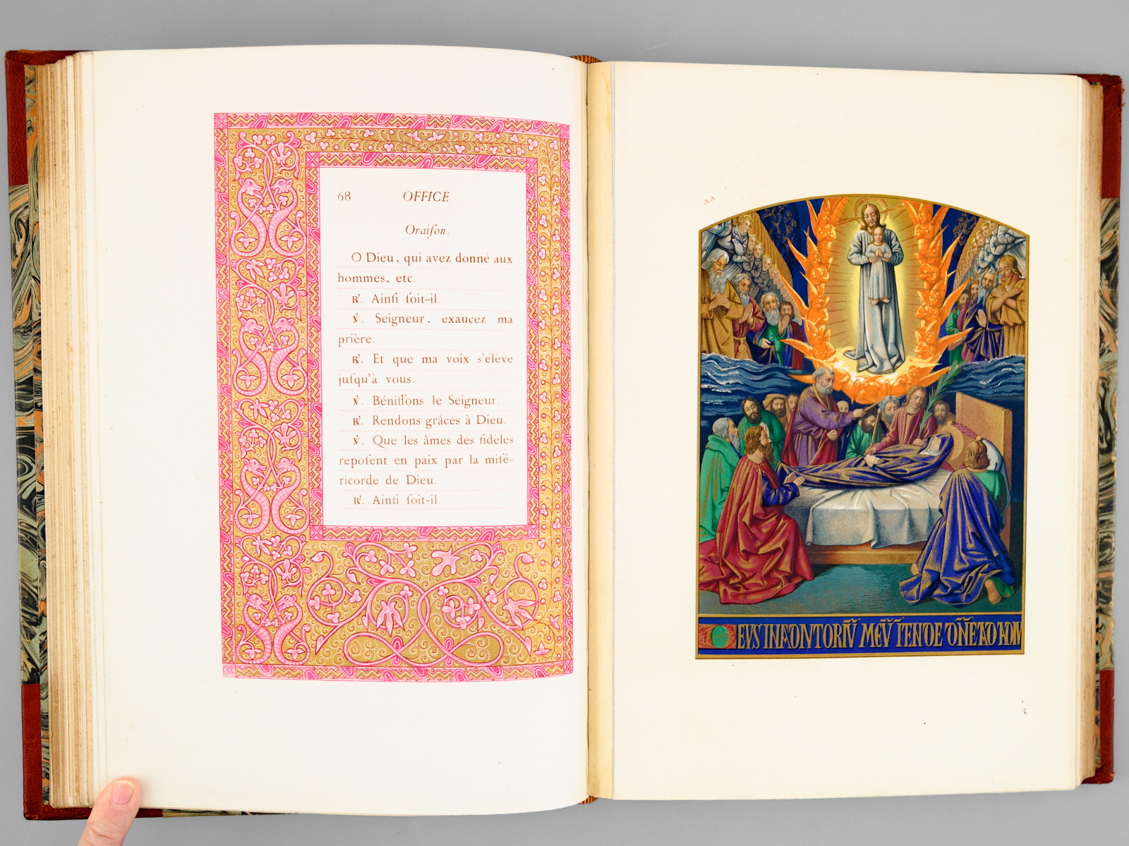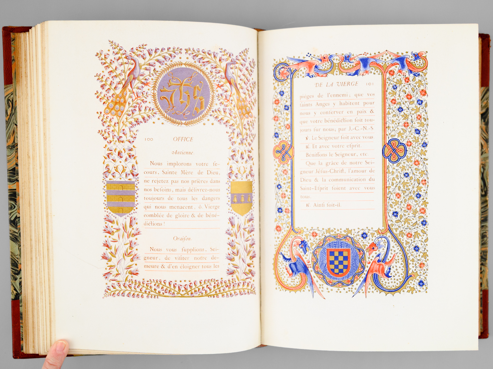 Texte restitué par M. l'Abbé Delaunay, Curé de St Etienne du Mont, Honoré du Suffrage de N.S. Père le Pape Pie IX, 2 vol. in-4 reliure postérieure demi-chagrin à coins rouge, dos à 5 nerfs dorés orné, mors dorés et estampés à froid, L. Curmer, 1866 - 1867, Tome I : 12 ff., 214 pp. et 4 ff. n. ch. avec portrait du Pape Pie IX et 53 chromolithographies hors texte ; Tome II : Liste des souscripteurs, la préface, la biographie de Jehan Foucquet, description de ses oeuvres, celle des miniatures reproduites dans le premier tome, une notice sur ses oeuvres présumées, l'opinion de la presse sur l'ouvrage, une description des ornements accompagnant le texte et 4 tables, avec 1 figure dessiné par Fossey gravée par Colin tirée sur chine, 5 chromolithographies hors texte et 17 titre en chromo, portrait de femme par Pauquet sur Chine rapporté dans le texte à la fin de la préface