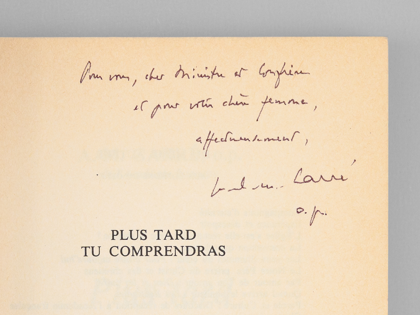 1 vol. in-12 br., coll. Pourquoi je vis, Les éditions du Cerf, Paris, 1980, 197 pp. Commentaire : Envoi de l'auteur à Maurice Druon : 'Pour vous, cher Ministre et confrère, et pour votre chère femme. Affectueusement ' Etat très satisfaisant (lég. pliure sur plat in., bon état par ailleurs. Maurice Druon (1918-2009), neveu de Joseph Kessel, fut résistant, écrivain auteur notamment de la saga des Rois maudits, homme politique. Elu à l'Académie Française en 1968, il en devint le Secrétaire Perpétuel en 1985. Le père Carré, quant à lui, fut élu en 1975, au fauteuil du Cardinal Daniélou, qui sera occupé ensuite par René Girard.