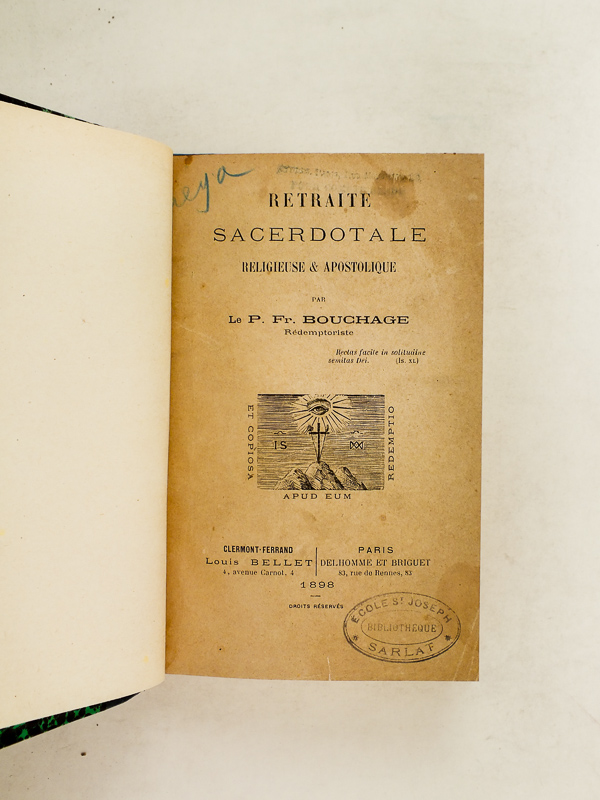 1 vol. in-12 reliure dem-percaline verte, Louis Bellet, Clermont-Ferrand, Delhomme et Briguet, Paris, 1898, 315 pp. Commentaire : Etat satisfaisant (ancien cachet d'institution religieuse, étiquette de cote en faux-titre et mors). L'auteur était un prêtre rédemptoriste (Ordre du Très Saint Rédempteur).