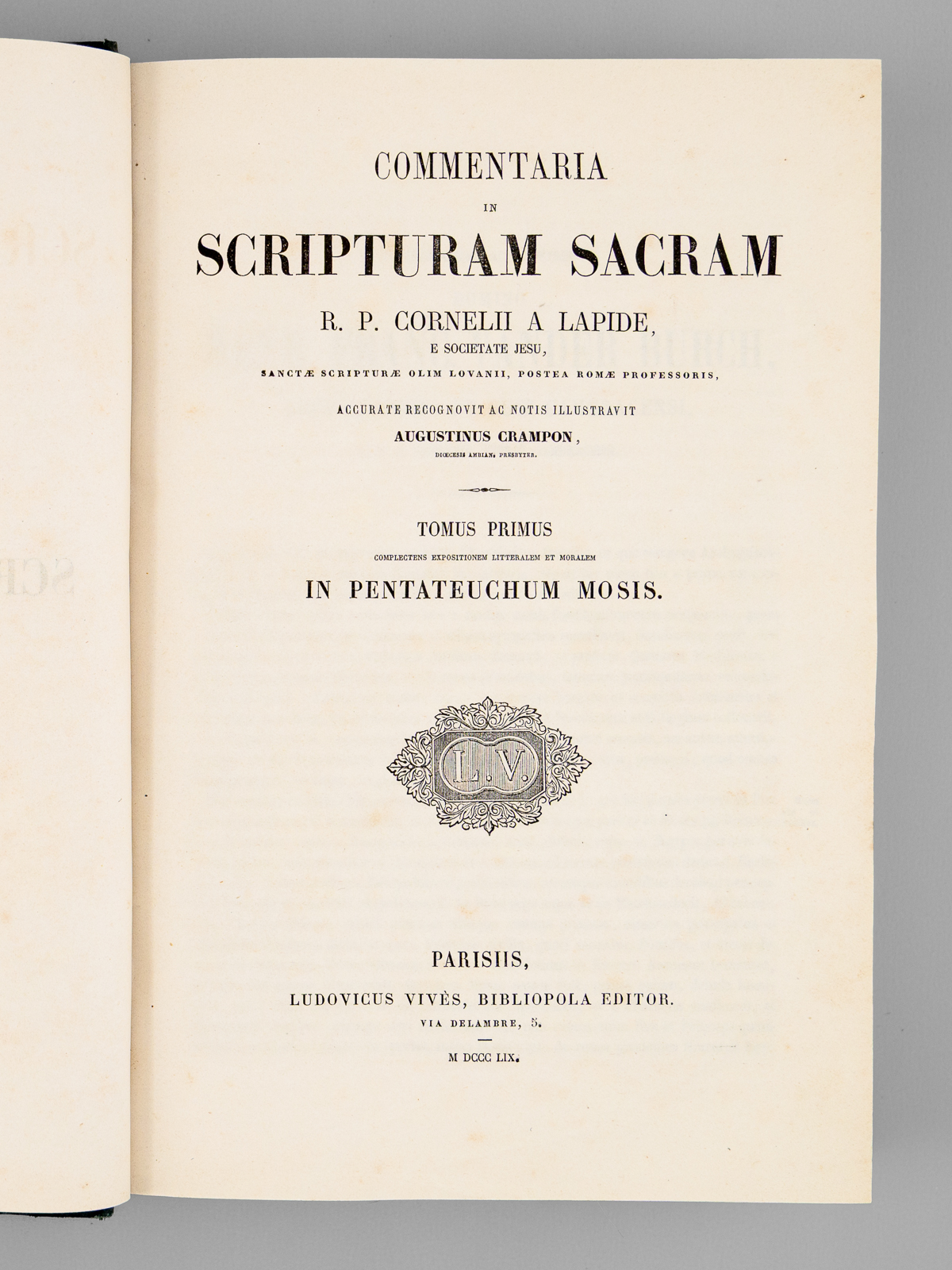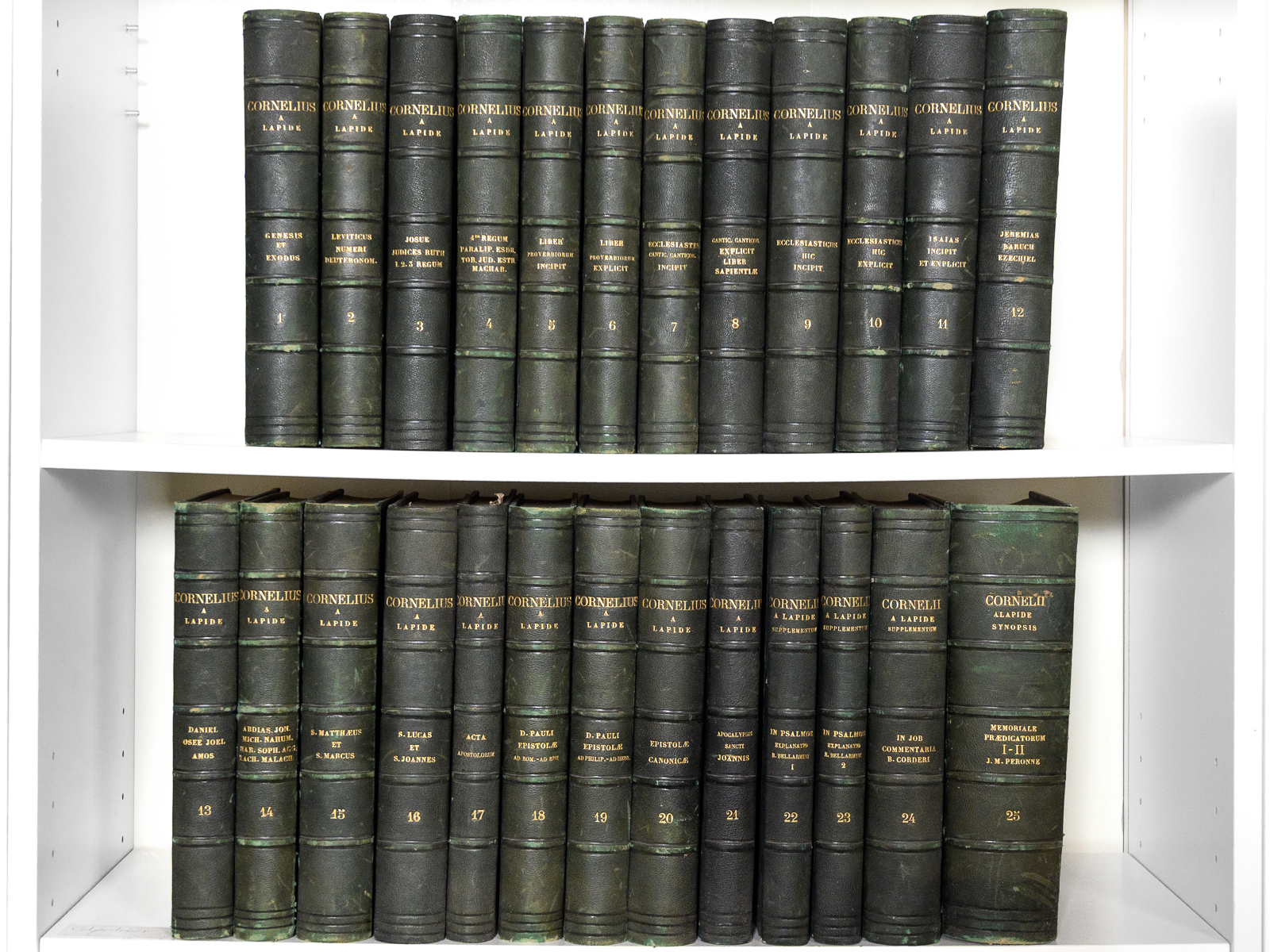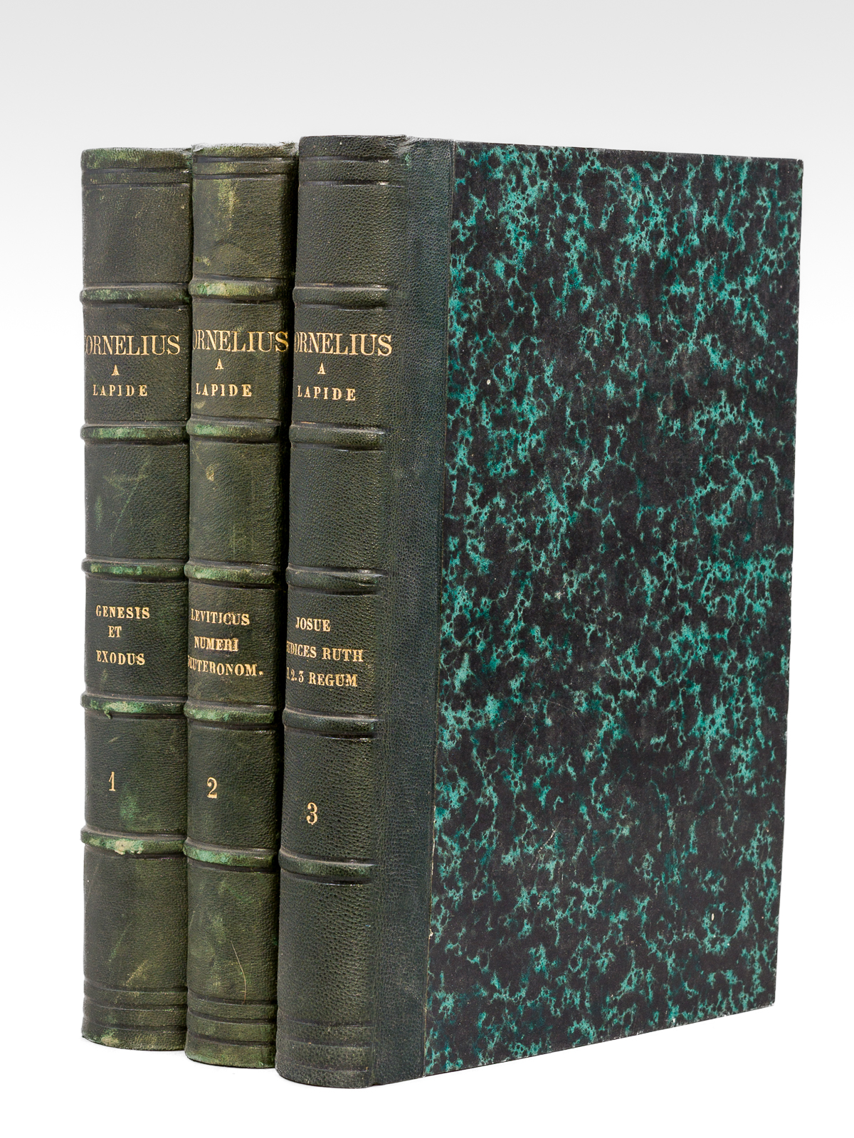 25 vol. in-4 reliure de l'époque demi-chagrin vert, dos à 5 nerfs, Apud Ludovicum Vivès [ Chez Louis Vivès ], Paris, 1859-1863 : Commentaria in Scripturam Sacram (25 Tomes - Complet) Contient : Tome 1 : In Pentateuchum Mosis, Genesis et Exodus ; Tome 2 : In Pentateuchum Mosis, Leviticus, Numeri et Deuternomium ; Tome 3 : In Josue, Judices, Ruth, Regum I, II, III ; Tome 4 : Regum IV, I & II Paralipomenon, I & II Esdrae, Tobiae, Judith, Esther, I & II Macabeaorum ; Tome 5 : Proverbia Salomonis 1-18 ; Tome 6 : Proverbia Salomonis 19-31 ; Tome 7 : In Ecclesiasten, Canticum canticorum 1-8 ; Tome 8: In Canticum canticorum 9-19, Librum Sapientiae ; Tome 9 : In Ecclesiaticum 1-25 ; Tome 10 :In Ecclesiaticum 26-51; Tome 11 : In Isaiam Prophetam ; Tome 12 : In Jeremiam, Threnos, Baruch et Ezechielem ; Tome 13 : In Danielem, Osee, Joelem, Amos ; Tome 14 : In Abdiam, Jonam, Michaeam, Nahum, Habacuc, Sophoniam, Aggaeum, Zachariam, Malachiam ; Tome 15 : In SS. Matthaeum et Marcum ; Tome 16 : In SS. Lucam et Joannem ; Tome 17 : In Acta Apostolorum ; Tome 18 :In Epistolas Divi Pauli ; Tome 19 :Divi Pauli Epistolarum ; Tome 20 : In Epistolas Canonicas ; Tome 21 : In Apocalypsin S. Joannis ; Tome 22 : Supplementum ad Commentaria : Bellarmin : Explanatio in Psalmos ; Tome 23 : Supplementum ad Commentaria : Bellarmin : Explanatio in Psalmos ; Tome 24 : Supplementum ad Commentaria : Balthasaris Corderi Commentaria in Librum Job ; Tome 25 : 25-I : Memoriale Praedicatorum auctore Peronne ; 25-II : Memoriale Praedicatorum auctore Peronne