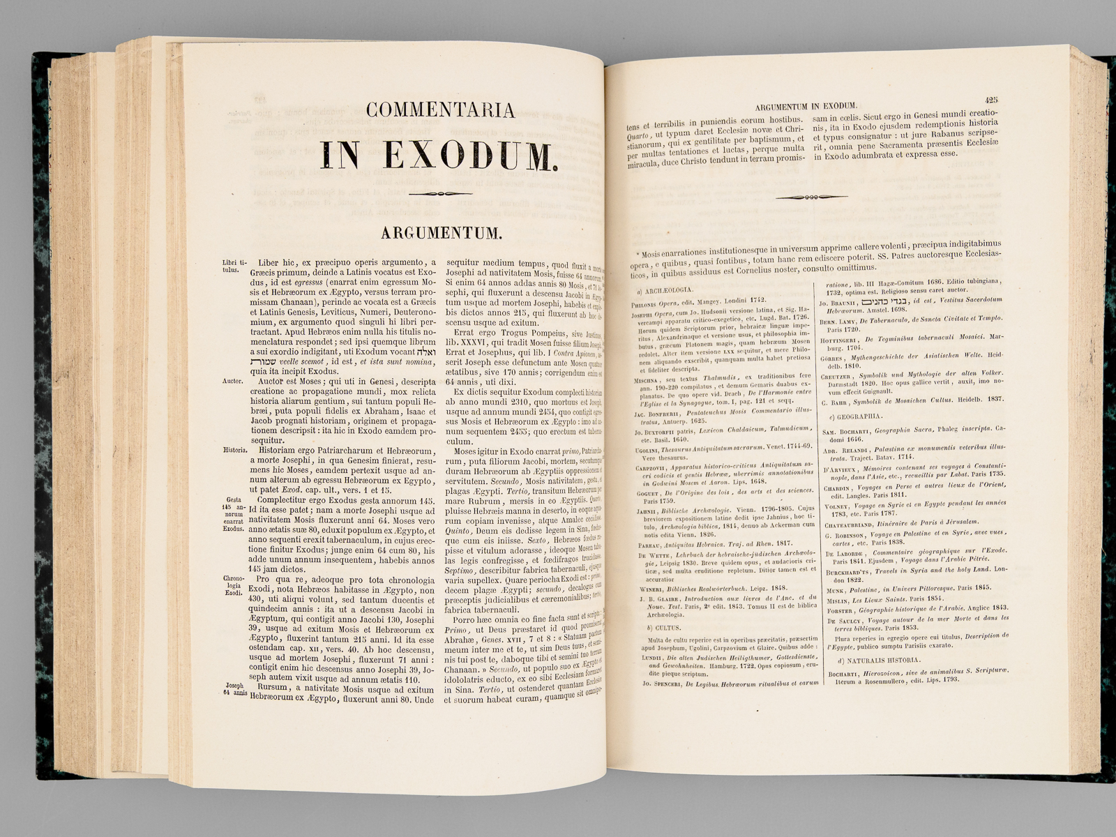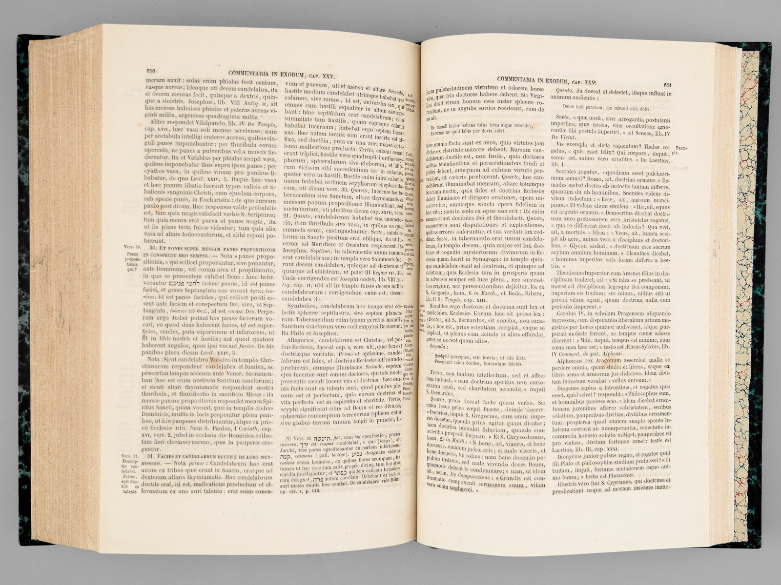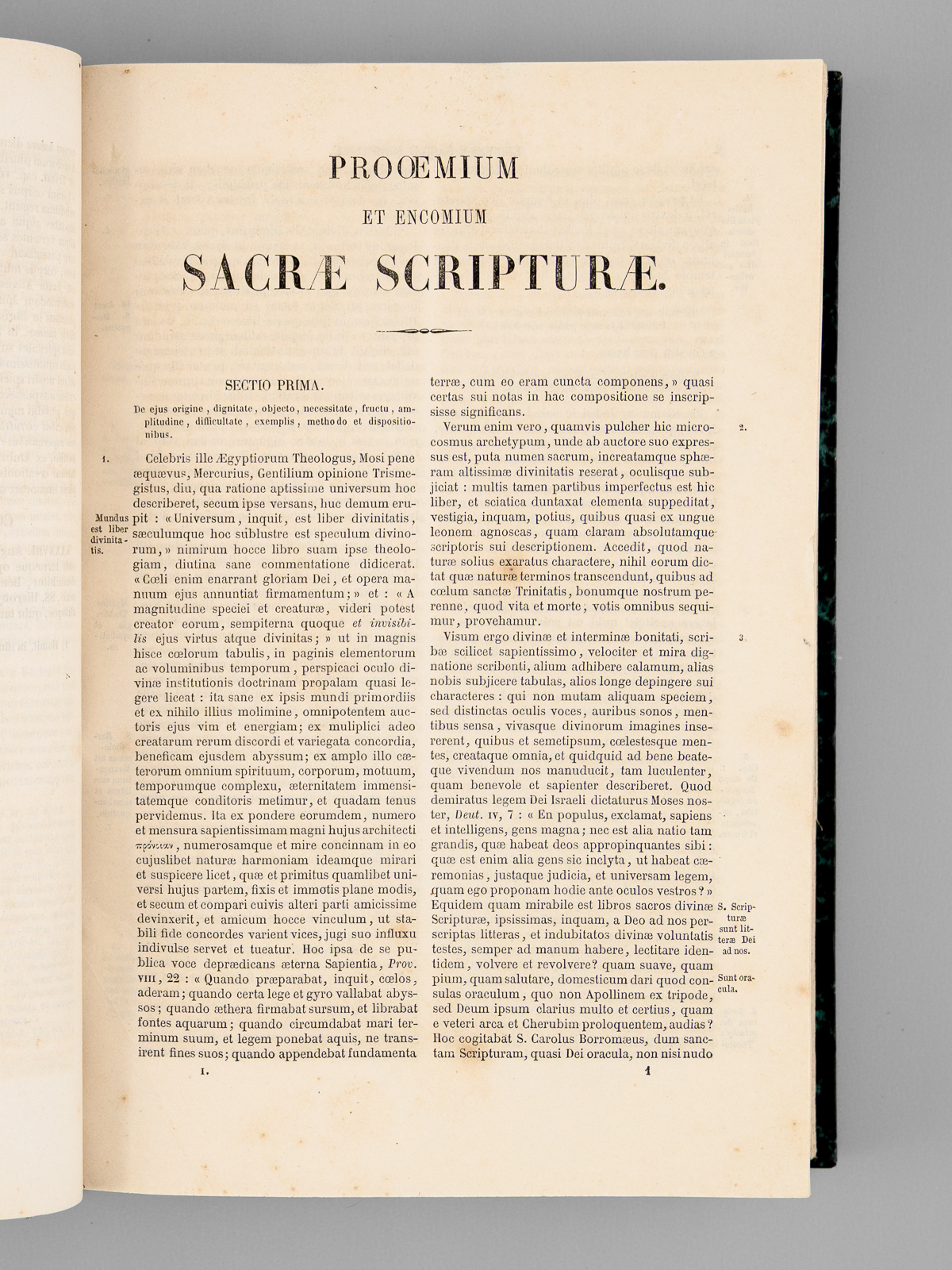 25 vol. in-4 reliure de l'époque demi-chagrin vert, dos à 5 nerfs, Apud Ludovicum Vivès [ Chez Louis Vivès ], Paris, 1859-1863 : Commentaria in Scripturam Sacram (25 Tomes - Complet) Contient : Tome 1 : In Pentateuchum Mosis, Genesis et Exodus ; Tome 2 : In Pentateuchum Mosis, Leviticus, Numeri et Deuternomium ; Tome 3 : In Josue, Judices, Ruth, Regum I, II, III ; Tome 4 : Regum IV, I & II Paralipomenon, I & II Esdrae, Tobiae, Judith, Esther, I & II Macabeaorum ; Tome 5 : Proverbia Salomonis 1-18 ; Tome 6 : Proverbia Salomonis 19-31 ; Tome 7 : In Ecclesiasten, Canticum canticorum 1-8 ; Tome 8: In Canticum canticorum 9-19, Librum Sapientiae ; Tome 9 : In Ecclesiaticum 1-25 ; Tome 10 :In Ecclesiaticum 26-51; Tome 11 : In Isaiam Prophetam ; Tome 12 : In Jeremiam, Threnos, Baruch et Ezechielem ; Tome 13 : In Danielem, Osee, Joelem, Amos ; Tome 14 : In Abdiam, Jonam, Michaeam, Nahum, Habacuc, Sophoniam, Aggaeum, Zachariam, Malachiam ; Tome 15 : In SS. Matthaeum et Marcum ; Tome 16 : In SS. Lucam et Joannem ; Tome 17 : In Acta Apostolorum ; Tome 18 :In Epistolas Divi Pauli ; Tome 19 :Divi Pauli Epistolarum ; Tome 20 : In Epistolas Canonicas ; Tome 21 : In Apocalypsin S. Joannis ; Tome 22 : Supplementum ad Commentaria : Bellarmin : Explanatio in Psalmos ; Tome 23 : Supplementum ad Commentaria : Bellarmin : Explanatio in Psalmos ; Tome 24 : Supplementum ad Commentaria : Balthasaris Corderi Commentaria in Librum Job ; Tome 25 : 25-I : Memoriale Praedicatorum auctore Peronne ; 25-II : Memoriale Praedicatorum auctore Peronne