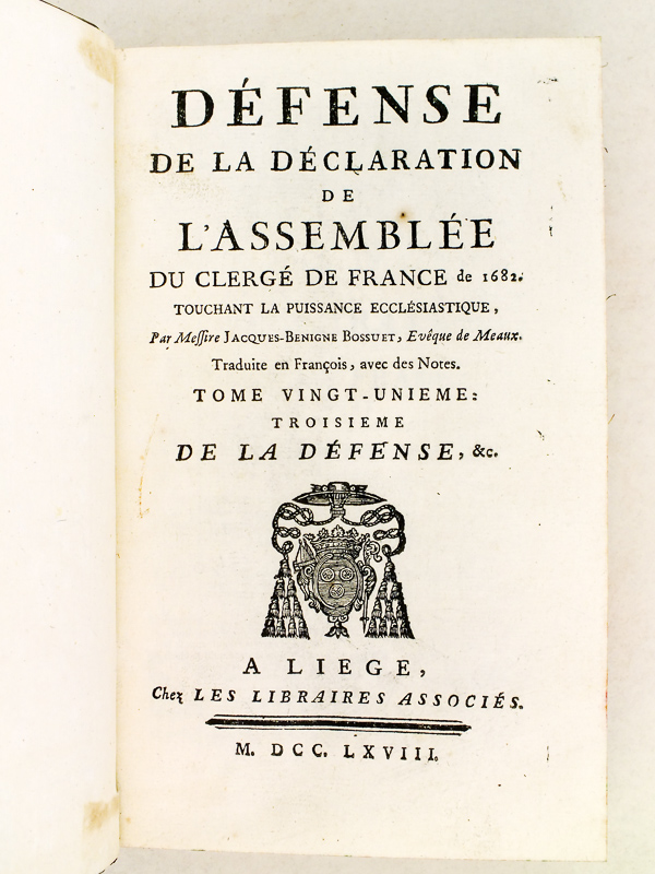 Oeuvres de Messire Jacques-Benigne Bossuet Evêque de Meaux. Tome Vingtième [ Tome 20 ] Second [ Tome ] de la Défense de la Déclaration de l'Assemblée du Clergé de France de 1682 touchant la puissance Ecclési Traité de l'autorité du Pape : Dans lequel ses Droits sont établis & réduits à leurs justes bornes, & les Principes des Libertez de l'Eglise Gallicane justifiez (4 Tomes - Complet) [ Edition originale ]