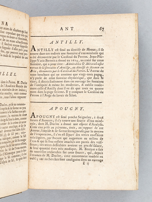 1 vol. in-8 cartonnage bradel bleu, [ Chez J. P. Costard, Paris, 1772 ], XVI-635 pp. [ Dictionnaire minéralogique et hydrologique de la France ] Dictionnaire Universel des Mines, Fossiles, et Fontaines Minérales de la France. Première Partie : Des Fontaines Minérales Commentaire : Exemplaire sans page de titre ni de faux-titre, et dont la préface est reliée par erreur avant la p. 103. Etat satisfaisant (coiffe sup. fort. frottée). Prix en l'état.