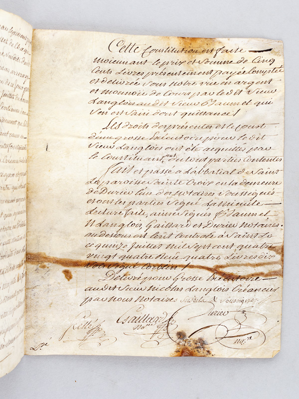 1 grosse sur vélin (parchemin) de 3 pp., 1784 : 'Par devant les Notaires Roiaux de la Ville de Saint Lo et dépendances soussignés le Jeudi huit Juillet avant midi l'an mil sept cent quatre-vingt quatre. Fut présent Sieur François Baumet, Marchand Boucher, Bourgeois de cette Ville y demeurant paroisse Notre Dame. Lequel a par ces présentes ... hipothéqué sur lui et tous ces biens présens et avenir a promesse de garantir fournir et faire valoir tant en principal qu'arrerager au profit du Sieur Nicolas Langlois, laboureur demeurant paroisse Saint Thomas de ce lieu, présent et acceptant pour lui ses héritiers ou aiant causes, Vingt-Cinq Livres de Rente' Commentaire : 'Fait et passé à l'abbatial de Saint-Lo paroisse Sainte Croix en la demeure de Durier l'un des Notaires soussignés'. Etat très satisfaisant (qq. brunissures)