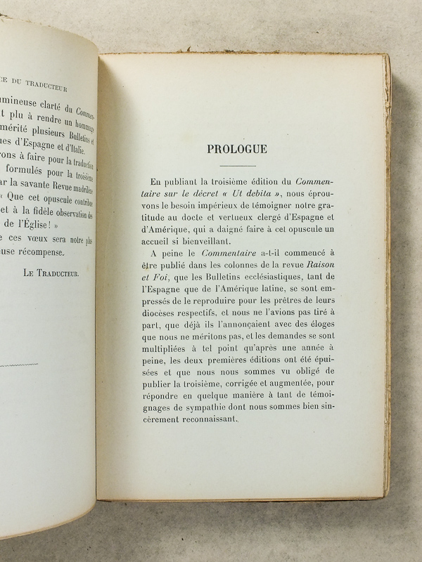 3e éd. corrigée et augm., seule trad. autorisée, 1 vol. in-8 br., Maison de la Bonne Presse, Paris, s.d. (1908), XII-164 pp. Commentaire : Etat très satisfaisant (anciennes traces sur couv., bon état par ailleurs). Un ouvrage du prêtre jésuite espagnol Juan Bautista Ferreres, qui enseigna la théologie morale et le droit canonique, en particulier au colège de Sarriá (Barcelone). Mort en prison, à Valence, en décembre 1936, il fut béatifié en 2001.