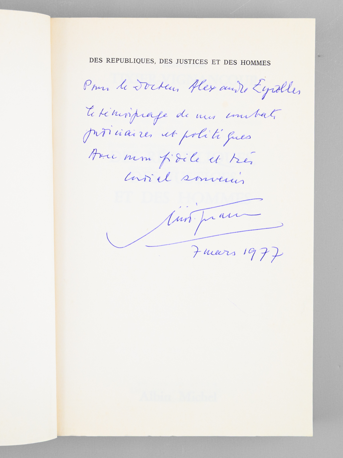 Commentaire : Bel envoi du célèbre avocat et homme politique : 'Pour le docteur A. E... ce témoignage de mes combats judiciaires et politiques avec mon fidèle et très cordial souvenir'. Bon exemplaire.