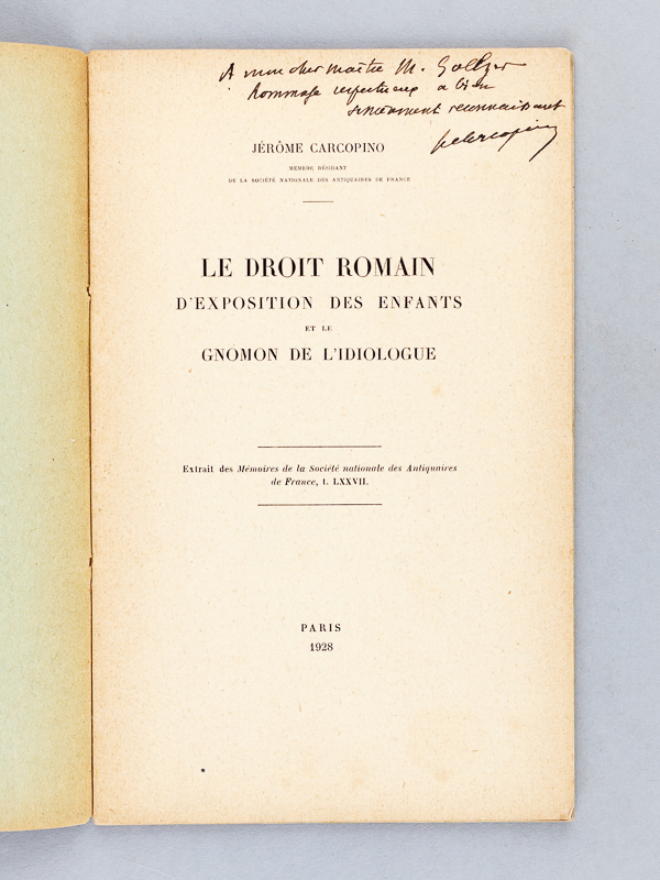 Le Droit romain d'exposition des Enfants et le Gnomon de l'Idiologue [ Edition originale - Livre dédicacé par l'auteur ] - Auteur: CARCOPINO, Jérôme - Année d'édition: 1928