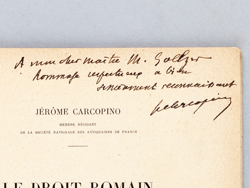 1 brochure in-8, extrait des Mémoires de la Société nationale des Antiquaires de France, T. LXXVII, Paris, 1928, 30 pp. Commentaire : Bel envoi du célèbre historien (et homme politique) Jérôme Carcopino 'à mon cher maître M. Golzer hommage respectueux et bien sincèrement reconnaissant'. Superbe provenance ! Bon état (annotations légères au crayon).