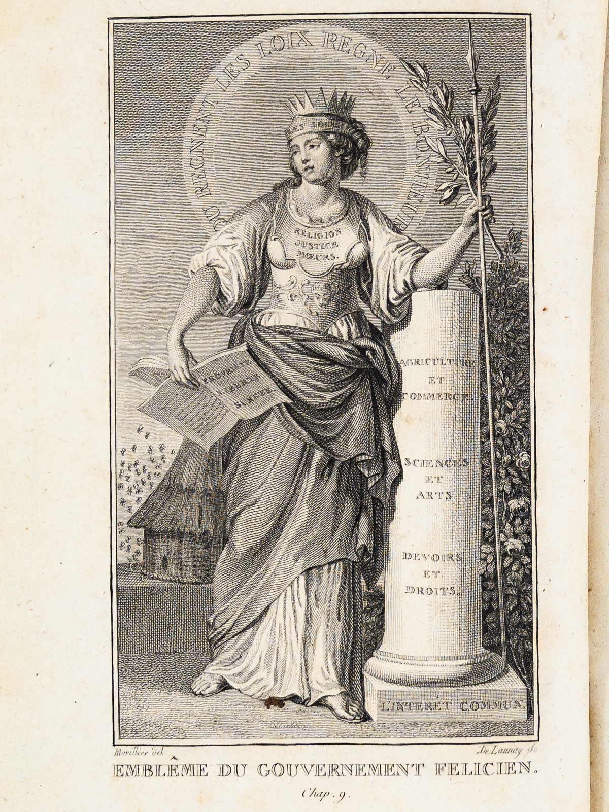 Commentaire : Très rare exemplaire de l'édition originale. 'Sous forme utopique, variante de la théorie du despotisme légal et de la philosophie de l'ordre naturel des sociétés' (INED, 2790). Nommé intendant de la Martinique grâce à l'appui de Madame de Pompadour, l'économiste physioctate Pierre Paul Lemercier de la Rivière (1719-1801) avait exposé sa théorie du 'despotisme légal' dans son traité 'L'ordre naturel et essentiel des sociétés politiques'. Il attira l'attention de l'impératrice Catherine II qui l'invita en Russie. Etat très satisfaisant (reliure lég. frottée, petits mq. à deux coiffes, mouill. angulaires, petit poinçonnement en coin sur qq. feuillets, bon état par ailleurs) pour ce très rare exemplaire, bien complet du frontispice de Marillier gravé par De Launay et des deux errata.