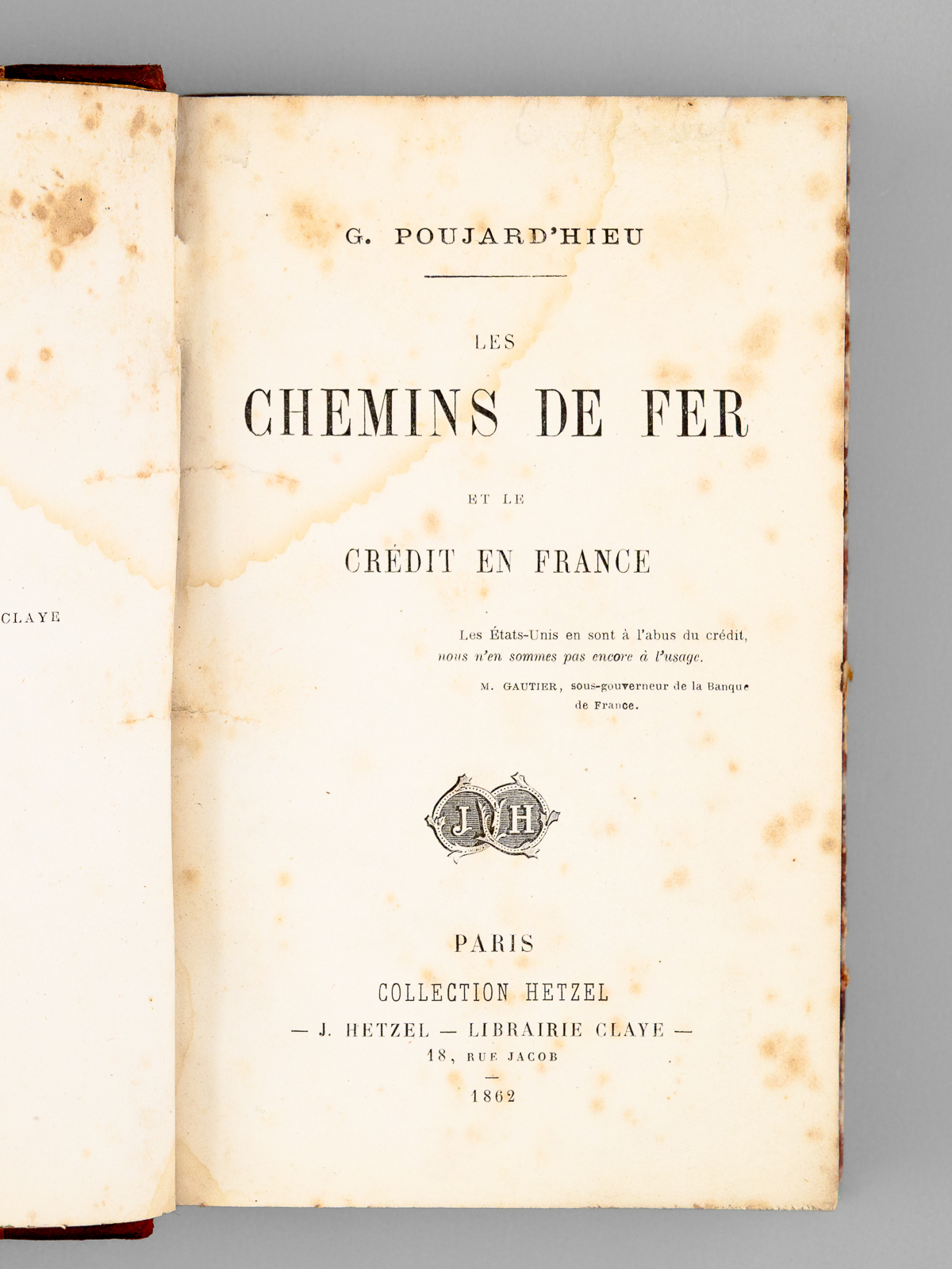 1 vol. in-12 rel. , collection Hetzel, J. Hetzel - Librairie Clayen Paris, 1862, 410 pp. Commentaire : Etat satisfaisant (des rouss., trace d'anciennes mouill. sur premières pages, état très satisfaisant par ailleurs). Un ouvrage très intéressant pour étudier les coûts et le financement des chemins de fer au XIXe siècle. Peu courant.