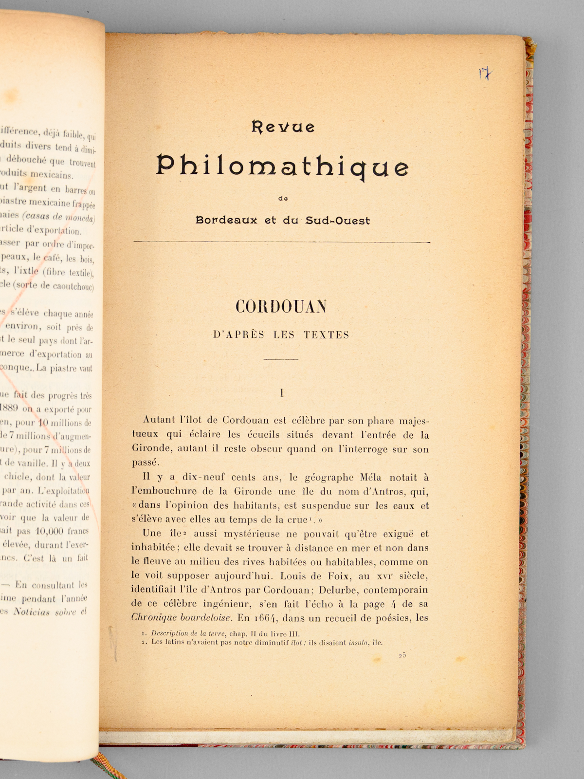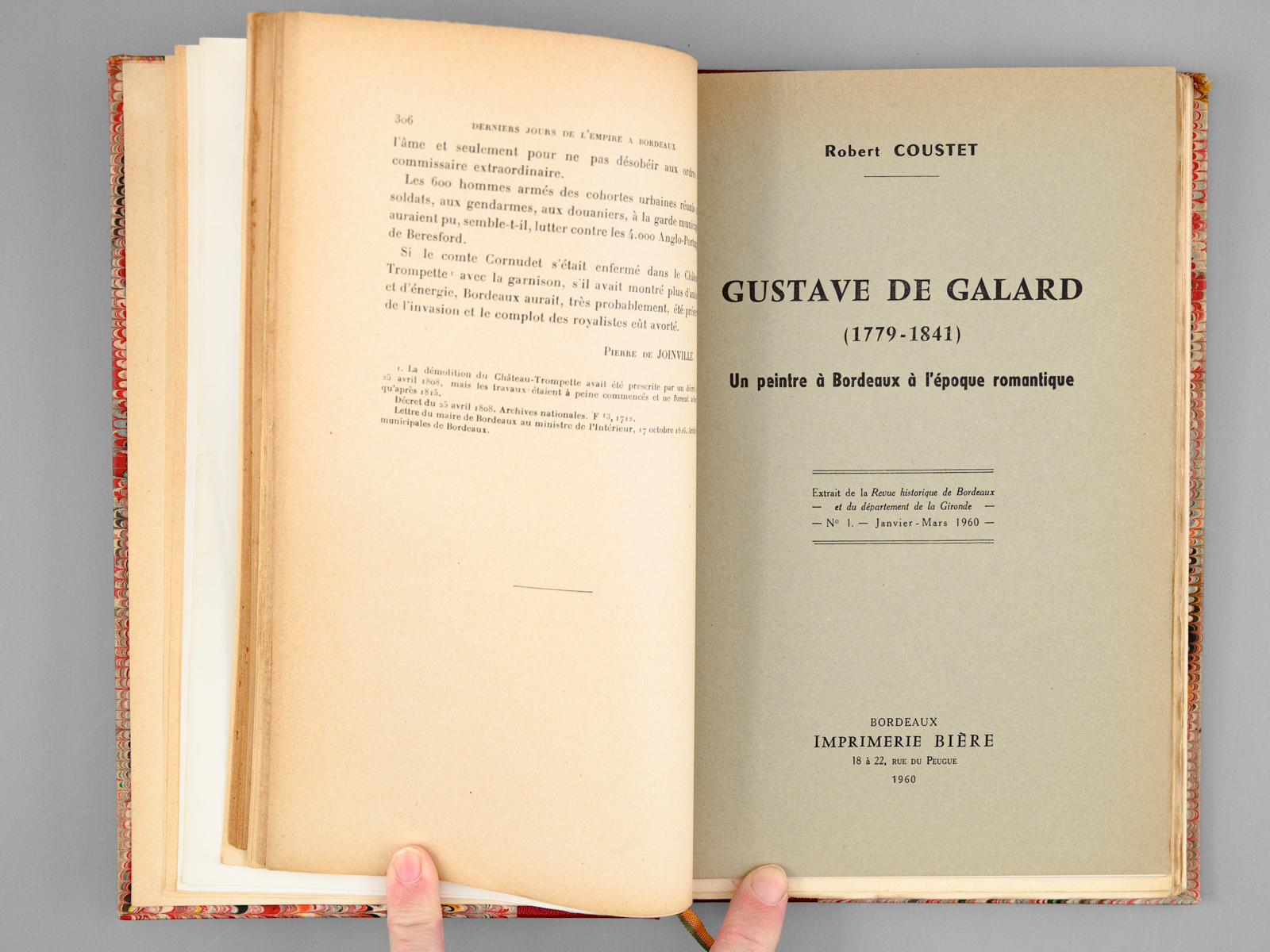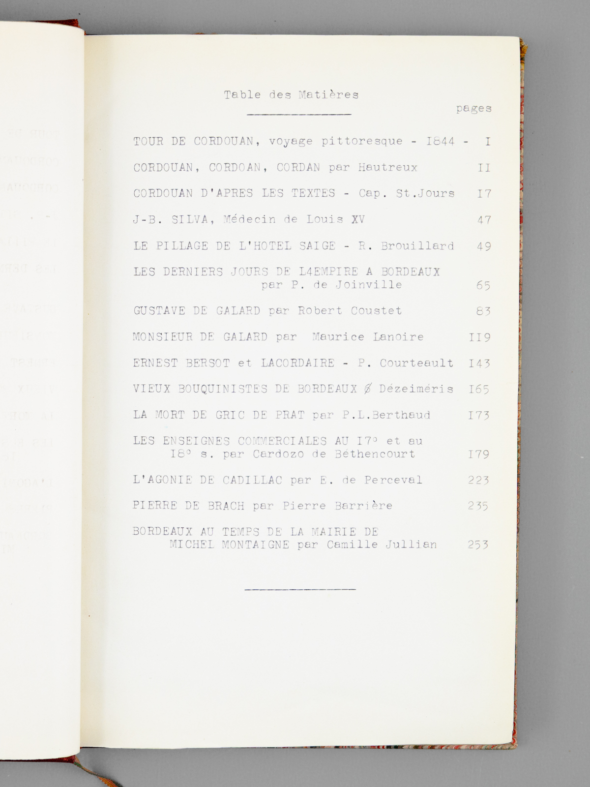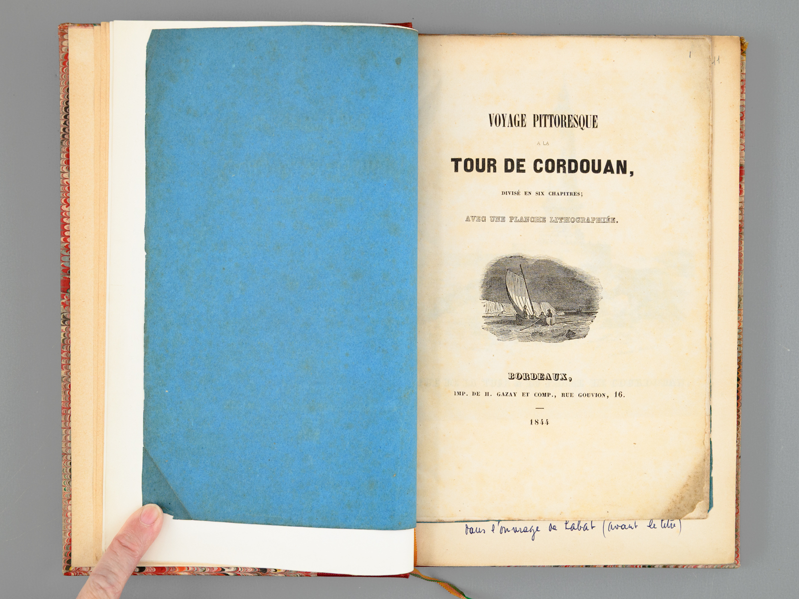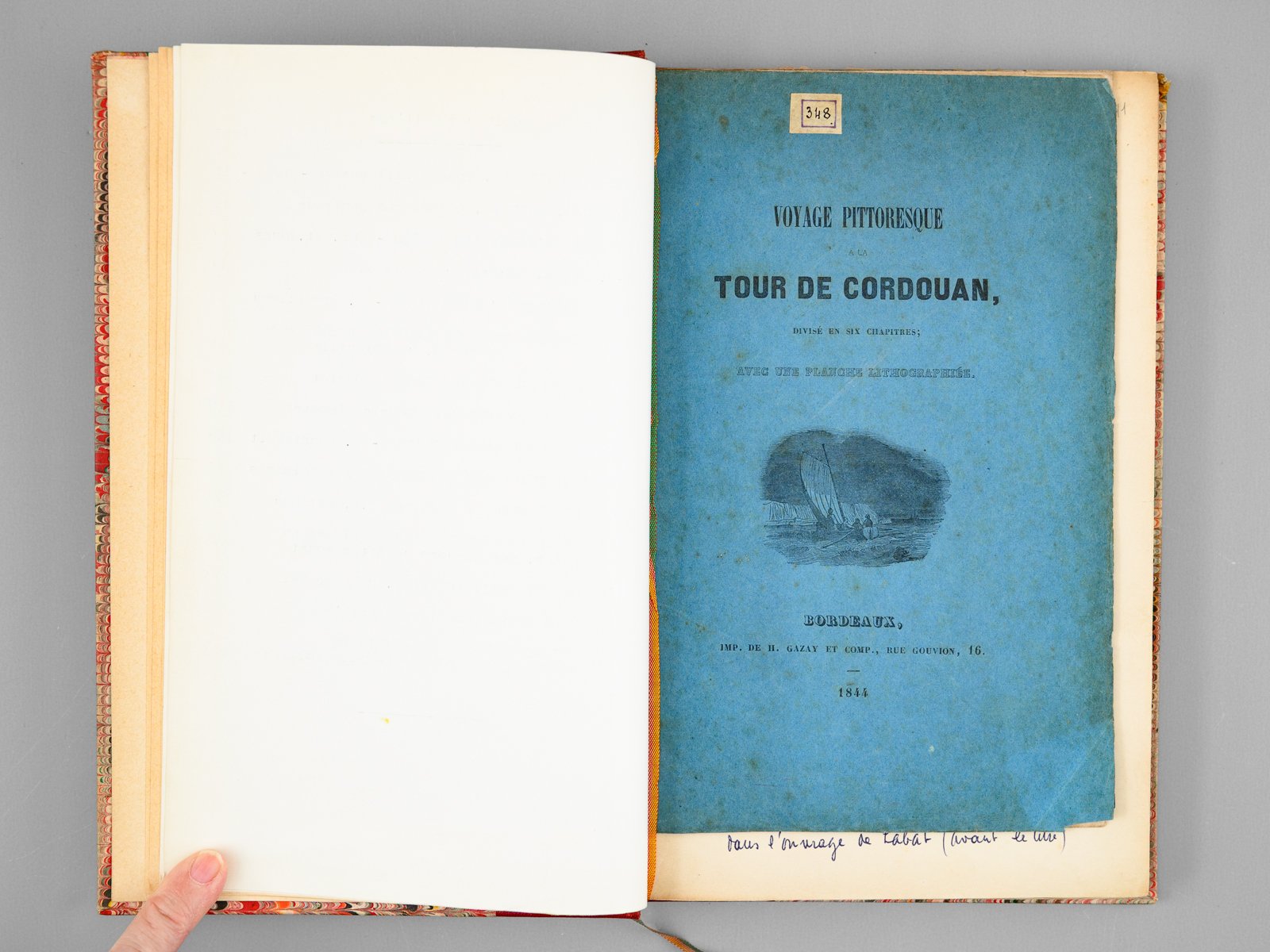 1 vol. in-8 reliure postérieure demi-chagrin bordeaux, dos à 5 nerfs, tomé 'Varia I' : Voyage pittoresque à la Tour de Cordouan, divisé en six chapitres ; avec une planche lithographiée, Imp. de H. Gazay et comp., Bordeaux, 1844, couvertures conservées, 20 pp. avec une planche hors texte [ Suivi de :] Cordouan, Cordoan, Cordan, s.n., 2 et 16 mars 1891, pp. 65-74, par Hautreux [ Suivi de :] Cordouan d'après les textes, Revue Philomatique de Bordeaux et du Sud-Ouest, s.d., pp. 385-475 par le Capitaine Saint-Jours [ Suivi de :] Le bordelais J.-B. Silva médecin du roi Louis XV, Revue Philomatique de Bordeaux et du Sud-Ouest, s.d., pp 173-174 [ Suivi de :] Récit des temps révolutionnaires. Le Pillage de l'Hôtel Saige, par René Brouillard, Revue Philomatique de Bordeaux et du Sud-Ouest, s.d., pp. 49-64 [ Suivi de :] Les derniers jours de l'Empire à Bordeaux. La mission du Sénateur Cornudet dans la Gironde (décembre 1813 - Avril 1814), par Pierre de Joinville, Revue Philomatique de Bordeaux et du Sud-Ouest, s.d., pp. 289-306 [ Suivi de :] Gustave de Galard (1779-1841). Un peintre à Bordeaux à l'époque romantique. Par Robert Coustet. Extrait de la Revue historique de Bordeaux et du département de la Gironde, n° 1 Janvier-Mars 1960, Imprimerie Bière, Bordeaux, 1960, 33 pp. [ Suivi de :] Monsieur de Galard, par Maurice Lanoire, Revue Philomatique de Bordeaux et du Sud-Ouest, s.d., pp. 49-61 [ Suivi de :] Ernest Bersot. Un prédicateur et un philosophe à Bordeaux en 1842, par Paul Courteault, Revue Philomatique de Bordeaux et du Sud-Ouest, Juillet-Août 1911, pp. 145-163 [ Suivi de :] Vieux Bouquinistes de Bordeaux, par Dezeimeris, Revue Philomatique de Bordeaux et du Sud-Ouest, juillet 1903, pp. 289-296 [ Suivi de :] Les Livres aquitains. Gric de Prat et la littérature gasconne du Bordelais, par Pierre-Louis Bertheaud, s.l.n.d., pp. 65-71 [ Suivi de :] Les Enseignes commerciales de Bordeaux au XVIIe et au XVIIIe siècle, par Cardozo de Bethencourt, s.l.n.d., pp. 179-188 ; 26-92 et 134-144 [ Suivi de : ] L'agonie d'une demeure princière, par Emile de Perceval. sur le château de Cadillac, s.l.n.d., pp. 14-24 [ Suivi de : ] Pierre de Brach, par Pierre Barrière, s.l.n.d., pp. 67-84 [ Suivi de : ] Bordeaux au temps de la mairie de Michel de Montaigne, par Camille Jullian, s.l.n.d., pp. 5-18