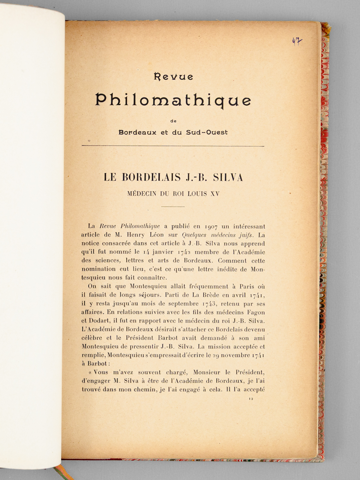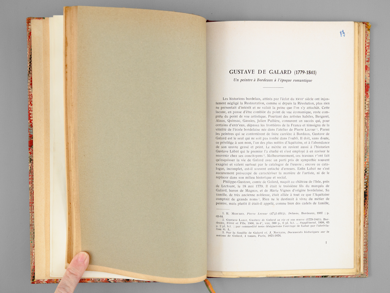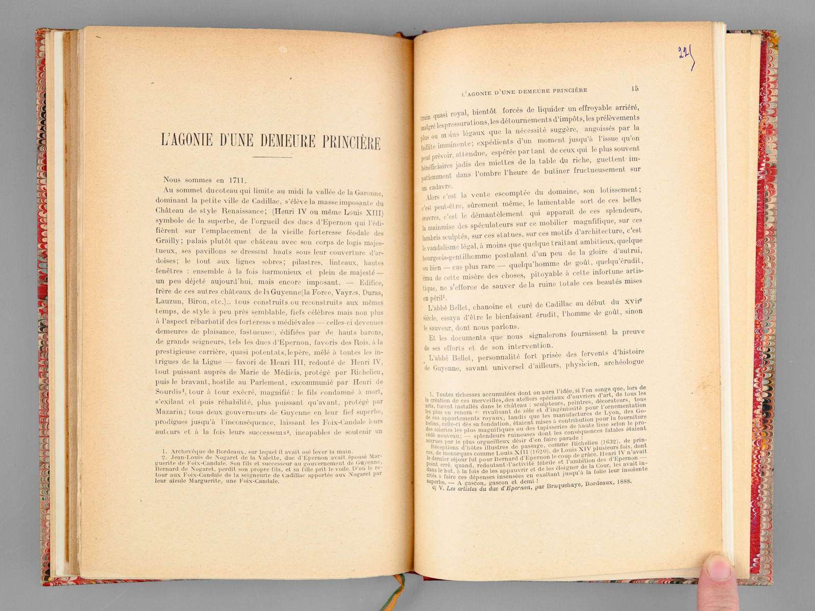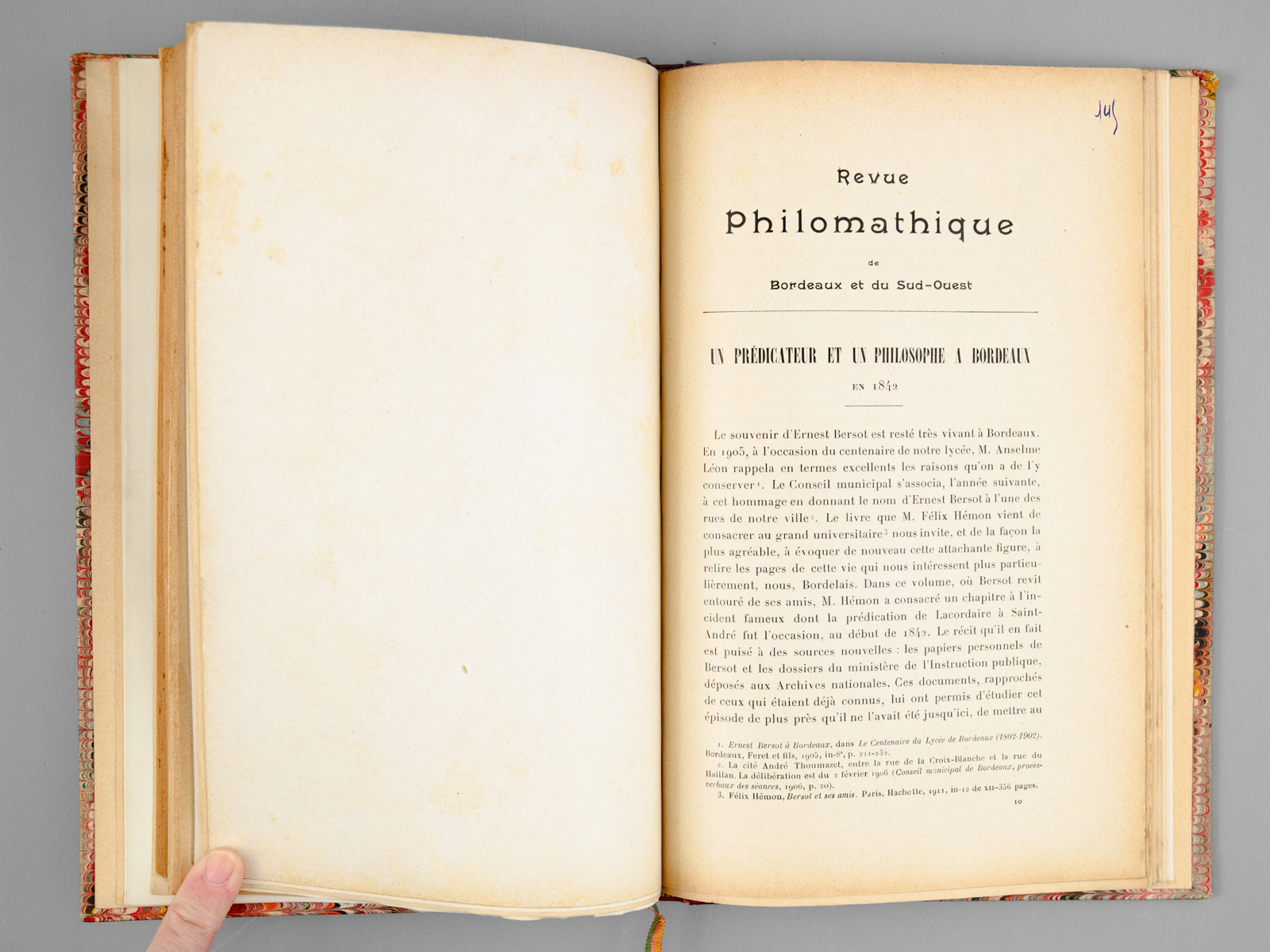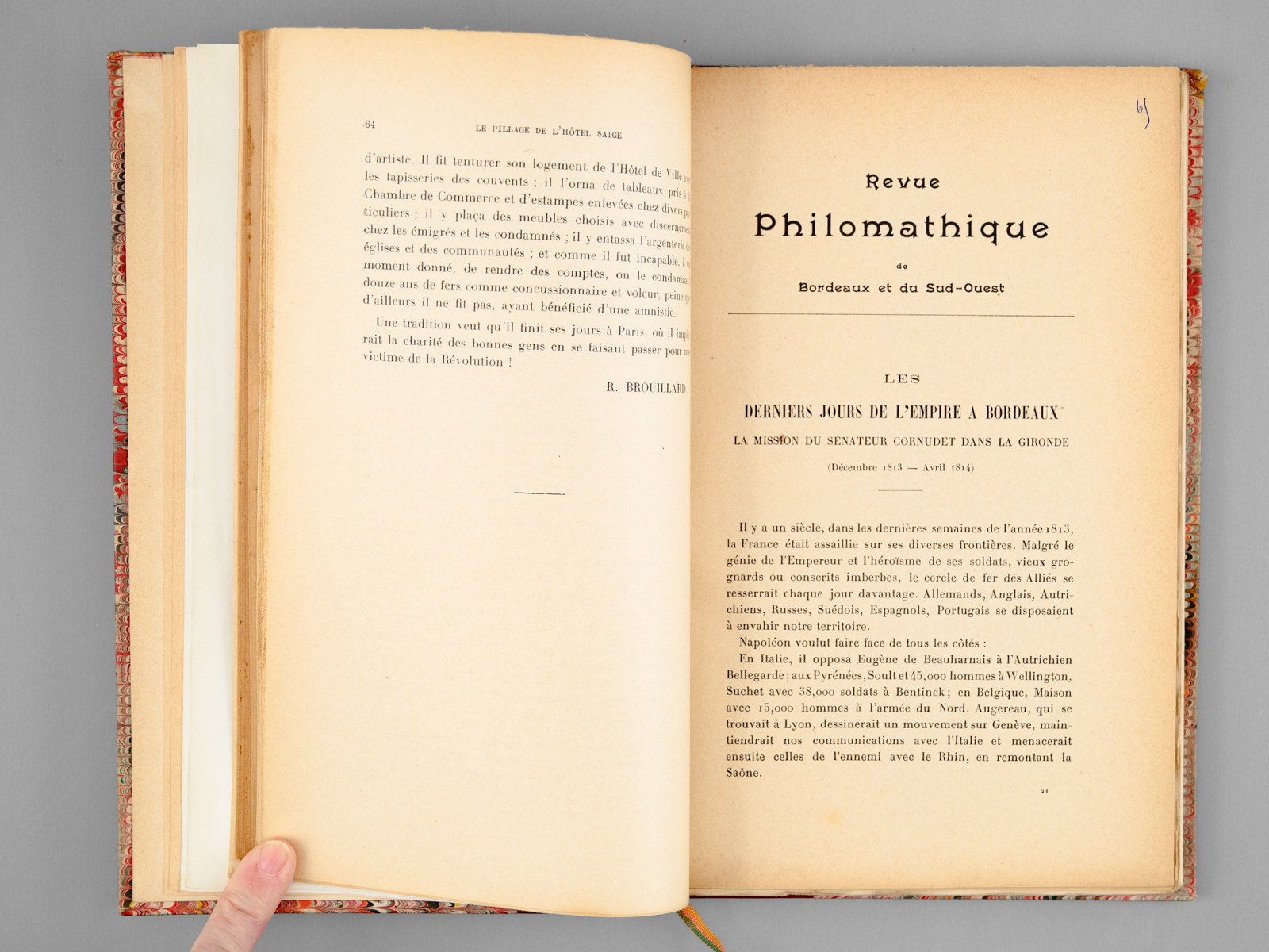 1 vol. in-8 reliure postérieure demi-chagrin bordeaux, dos à 5 nerfs, tomé 'Varia I' : Voyage pittoresque à la Tour de Cordouan, divisé en six chapitres ; avec une planche lithographiée, Imp. de H. Gazay et comp., Bordeaux, 1844, couvertures conservées, 20 pp. avec une planche hors texte [ Suivi de :] Cordouan, Cordoan, Cordan, s.n., 2 et 16 mars 1891, pp. 65-74, par Hautreux [ Suivi de :] Cordouan d'après les textes, Revue Philomatique de Bordeaux et du Sud-Ouest, s.d., pp. 385-475 par le Capitaine Saint-Jours [ Suivi de :] Le bordelais J.-B. Silva médecin du roi Louis XV, Revue Philomatique de Bordeaux et du Sud-Ouest, s.d., pp 173-174 [ Suivi de :] Récit des temps révolutionnaires. Le Pillage de l'Hôtel Saige, par René Brouillard, Revue Philomatique de Bordeaux et du Sud-Ouest, s.d., pp. 49-64 [ Suivi de :] Les derniers jours de l'Empire à Bordeaux. La mission du Sénateur Cornudet dans la Gironde (décembre 1813 - Avril 1814), par Pierre de Joinville, Revue Philomatique de Bordeaux et du Sud-Ouest, s.d., pp. 289-306 [ Suivi de :] Gustave de Galard (1779-1841). Un peintre à Bordeaux à l'époque romantique. Par Robert Coustet. Extrait de la Revue historique de Bordeaux et du département de la Gironde, n° 1 Janvier-Mars 1960, Imprimerie Bière, Bordeaux, 1960, 33 pp. [ Suivi de :] Monsieur de Galard, par Maurice Lanoire, Revue Philomatique de Bordeaux et du Sud-Ouest, s.d., pp. 49-61 [ Suivi de :] Ernest Bersot. Un prédicateur et un philosophe à Bordeaux en 1842, par Paul Courteault, Revue Philomatique de Bordeaux et du Sud-Ouest, Juillet-Août 1911, pp. 145-163 [ Suivi de :] Vieux Bouquinistes de Bordeaux, par Dezeimeris, Revue Philomatique de Bordeaux et du Sud-Ouest, juillet 1903, pp. 289-296 [ Suivi de :] Les Livres aquitains. Gric de Prat et la littérature gasconne du Bordelais, par Pierre-Louis Bertheaud, s.l.n.d., pp. 65-71 [ Suivi de :] Les Enseignes commerciales de Bordeaux au XVIIe et au XVIIIe siècle, par Cardozo de Bethencourt, s.l.n.d., pp. 179-188 ; 26-92 et 134-144 [ Suivi de : ] L'agonie d'une demeure princière, par Emile de Perceval. sur le château de Cadillac, s.l.n.d., pp. 14-24 [ Suivi de : ] Pierre de Brach, par Pierre Barrière, s.l.n.d., pp. 67-84 [ Suivi de : ] Bordeaux au temps de la mairie de Michel de Montaigne, par Camille Jullian, s.l.n.d., pp. 5-18