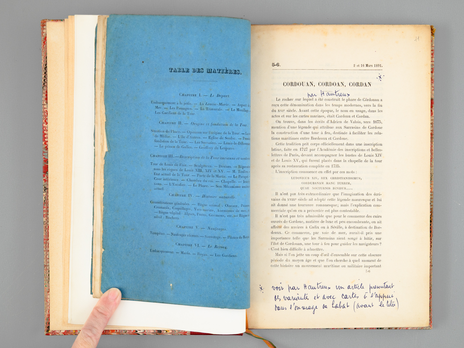 Commentaire : Ce recueil s'ouvre sur la très rare brochure originale consacrée au phare de Cordouan, publiée de manière anonyme en 1844 par Henry Burguet, alors conservateur du Muséum d'Histoire Naturelle de Bordeaux. Bon état (usures et petites taches en dos, qq. annotations au stylo dans certains articles)
