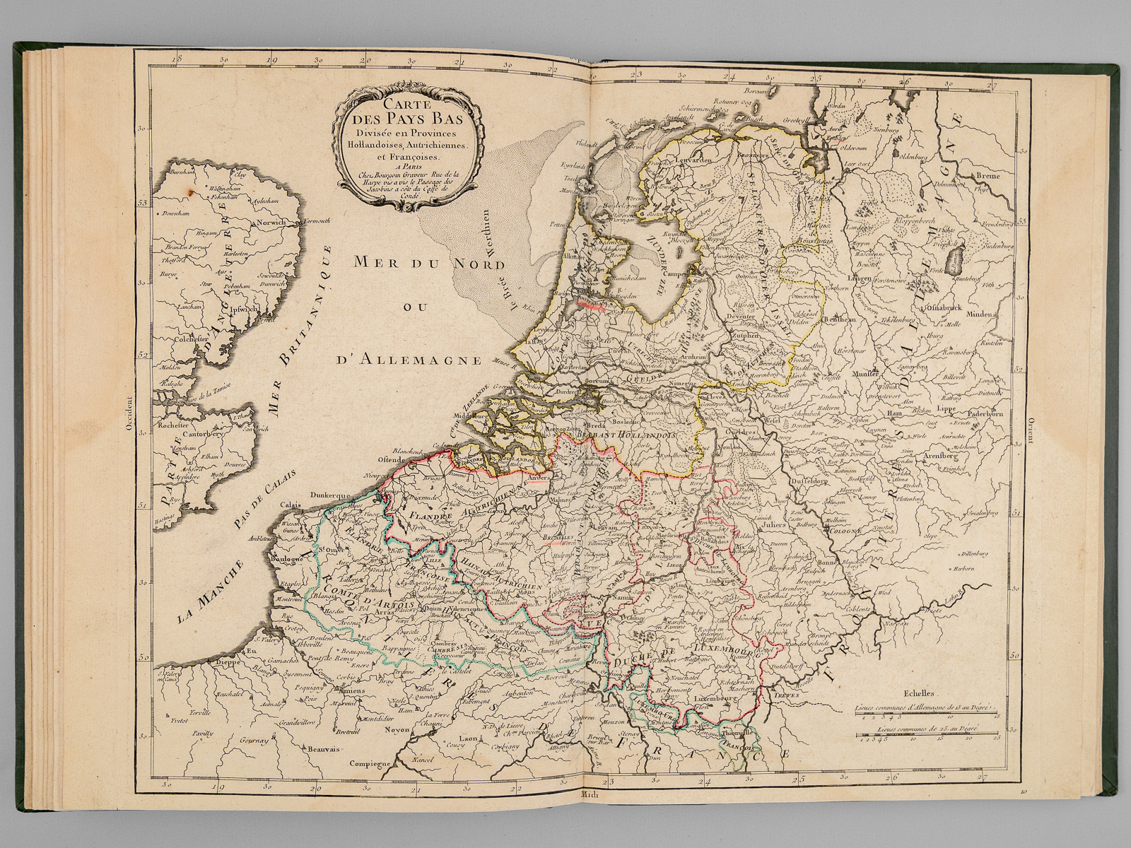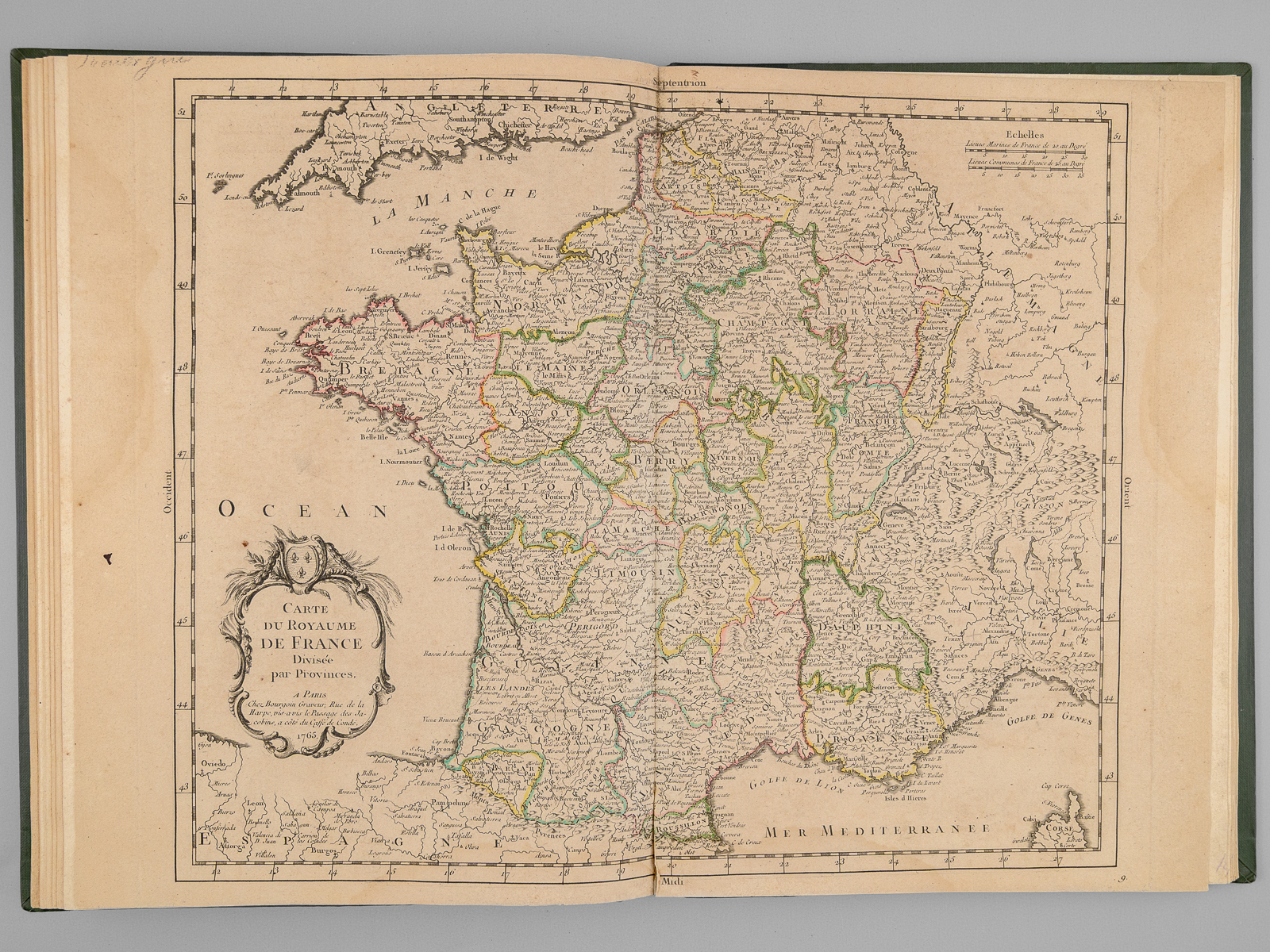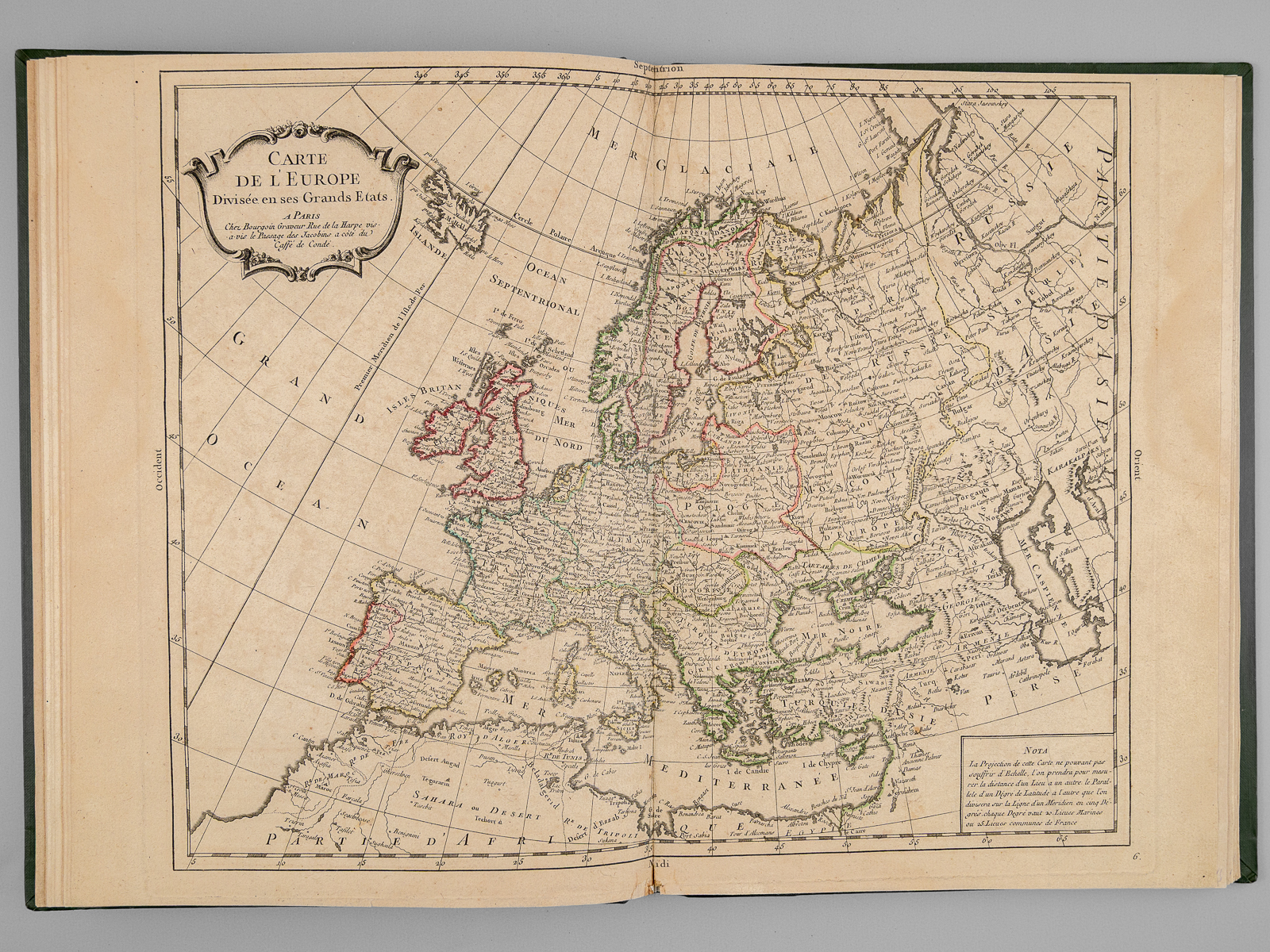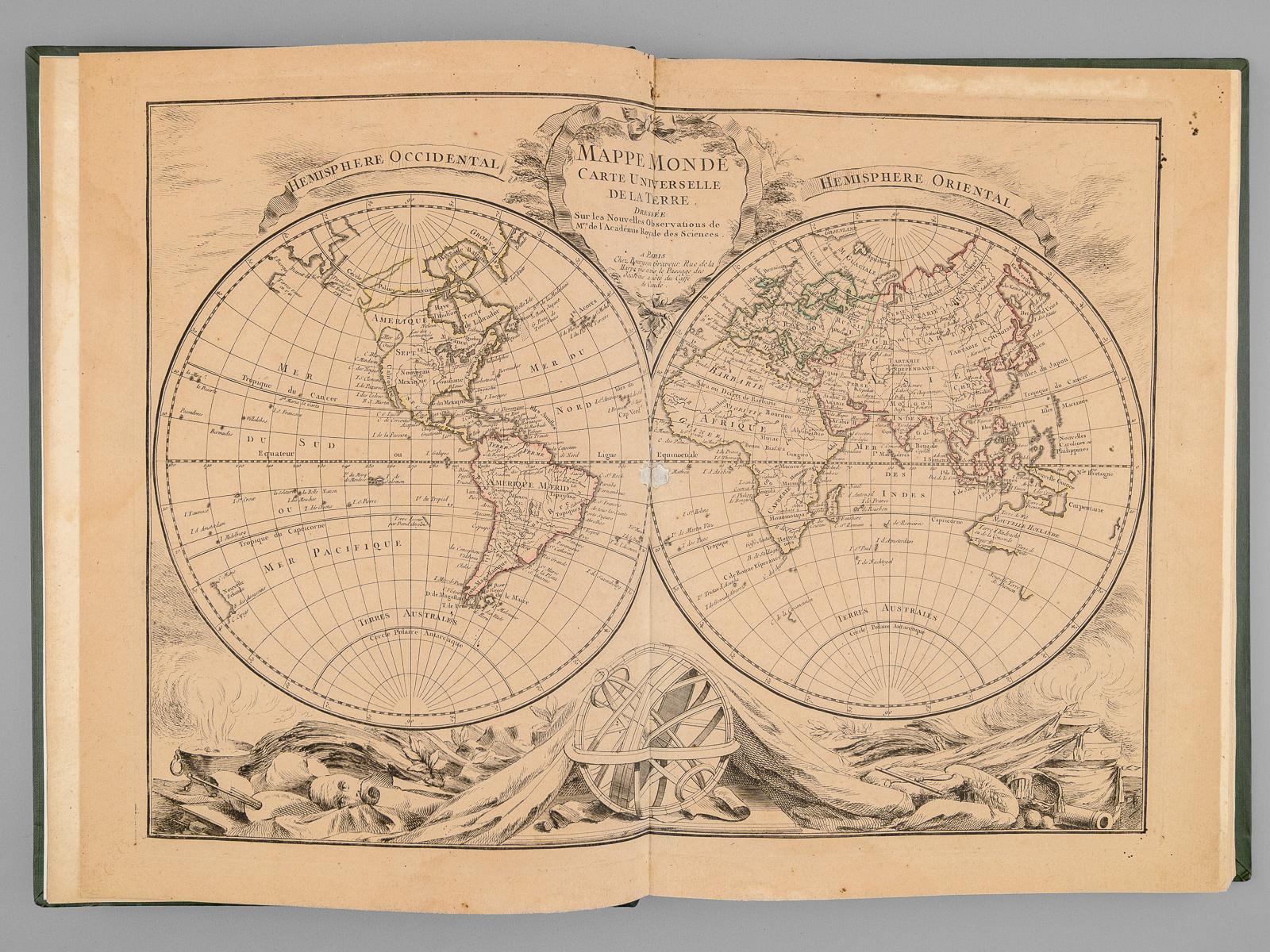 Recueil de cartes et planches en 25 feuilles de format 36 x 50 cm (mesures en marges), en 1 vol. petit in-folio cartonnage moderne (XXe siècle) demi-basane verte, Contient : Carte des diverses positions de la Sphère, des Systèmes de l'Univers, des Planettes, des Eclypses &c. en deux feuilles, [s.l.n.d.] contient notamment Sphère armillaire oblique, globe céleste, globe terreste [ Avec : ] Mappe monde Carte universelle de la Terre dressée sur les Nouvelles Observations de Messieurs de l'Académie Royale des Sciences, Chez Bourgoin Graveur, Rue de la Harpe vis-à-vis le passage des Jacobins à côté du café de Condé, Paris, 1773 [Avec : ] Carte itinéraire de la France divisée par Gouvernements Militaires et en ses Provinces Contenant les Routes Royales et Particulières, Dressée sur la Carte des Triangles levée géométriquement, Première Feuille contenant la Bretagne, la Normandie, le Maine et Perche, Chez Bourgoin 1773 [ Avec : ] Deuxième feuille contenant la Flandre Françoise, Picardie, Artois, Isle de France, Champagne, Lorraine et Alsace [ Avec : ] Troisième feuille contenant une partie de la Bretagne, l'Anjou, la Touraine, le Poitou, la Saintonge, la Marche et le Limosin [ Avec : ] Cinquième feuille contenant la Guienne, le Bearn, la Basse Navarre, le Comté de Foix et une partie du Languedoc [ Avec : ] Sixième feuille contenant le Languedoc, le Dauphiné, la Provence et le Roussillon [ Avec : ] Carte de l'Amérique Septentrionale, Chez Bourgoin, s.d. avec une note sur les découvertes de l'Amiral de Fonte jugées suspectes 'Dans cette Partie on avoit mis les pretendues Decouvertes de l'Amiral de Fonte. La relation en ayant eté trouvé suspecte par plusieurs Auteurs on n'a pas cru devoir les mettre dans cette Carte, dans la Mappemonde elles sont pointées en attendant la verification' [ Avec : ] Carte de l'Amérique Méridionale, Chez Bourgoin, Paris, s.d. [ Avec : ] Carte de l'Asie Divisée en ses principaux Empires et Royaumes, Chez Bourgoin, Paris, s.d. avec cette précision : 'Cette Projection supposant l'oeil du Spectateur au Centre de l'Equateur représente cette Partie comme détachée d'un grand Globe et applatie, les Meridiens et les Paralleles du centre se trouvant plus resserrées et s'elargissant a mesure quils s'en éloignent, cette projection et toutes celles de cette nature ne peuvent souffrir d'Echelles, les quelles seroient fausses' [Avec : ] Carte de l'Europe Divisée en ses Grands Etats, Chez Bourgoin, Paris, s.d. [Avec : ] Cartes des Isles Britanniques, Chez Bourgoin, Paris, s.d. [Avec : ] Carte du Royaume d'Espagne et de Portugal Divisé par Provinces et Royaumes, Chez Bourgoin, Paris, s.d. [ Avec : ] Carte du Royaume de France divisé par Provinces, Chez Bourgoin, Paris, 1765 [ Avec : ] Carte des Pays Bas Divisée en Provinces Hollandoises, Autrichiennes et Françoises, Chez Bourgoin, Paris, s.d. [ Avec : ] Carte de l'Empire d'Allemagne Divisée par Cercles, Chez Bourgoin, Paris, s.d. [ Avec : ] Carte de l'Italie et des Isles adjacentes, Chez Bourgoin, Paris, s.d. [ Avec : ] Carte des XIII Cantons Suisses leurs Alliés et leurs Sujets, Chez Bourgoin, Paris, s.d. [ Avec : ] Royaume d'Hongrie Principauté de Transilvanie et Banat de Temeswar, Chez Bourgoin, Paris, s.d. [ Avec : ] Carte de l'Empire de Turquie en Europe, Chez Bourgoin, Paris, s.d. [ Avec : ] Carte du Royaume du Dannemarck, Chez Bourgoin, Paris, s.d. [ Avec : ] Carte du Royaume de Suède Norwege et Partie du Dannemarck, Chez Bourgoin, Paris, s.d. [ Avec : ] Carte de l'Empire des Russies en Europe Partie Septentrionale, Chez Bourgoin, Paris, 1765 [ Avec : ] Carte de la Judée ou Terre Sainte pour l'Intelligence de l'Histoire Sacréen Chez Bourgoin, Paris, s.d.