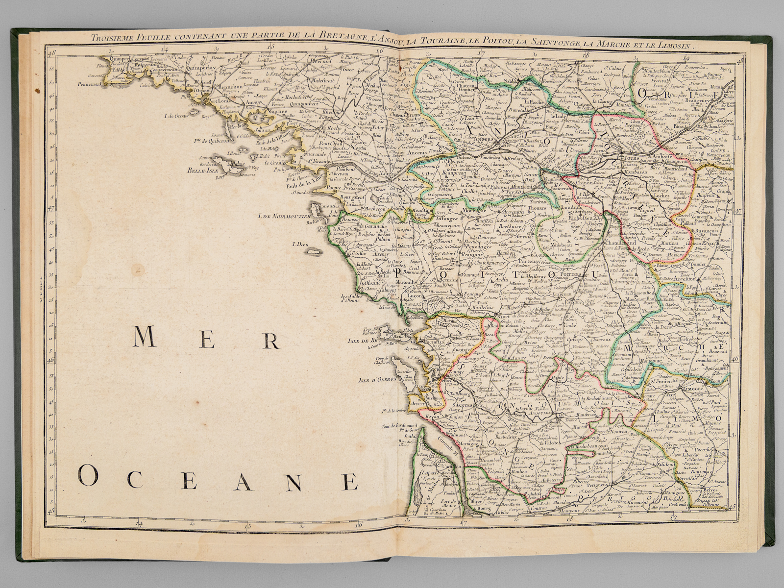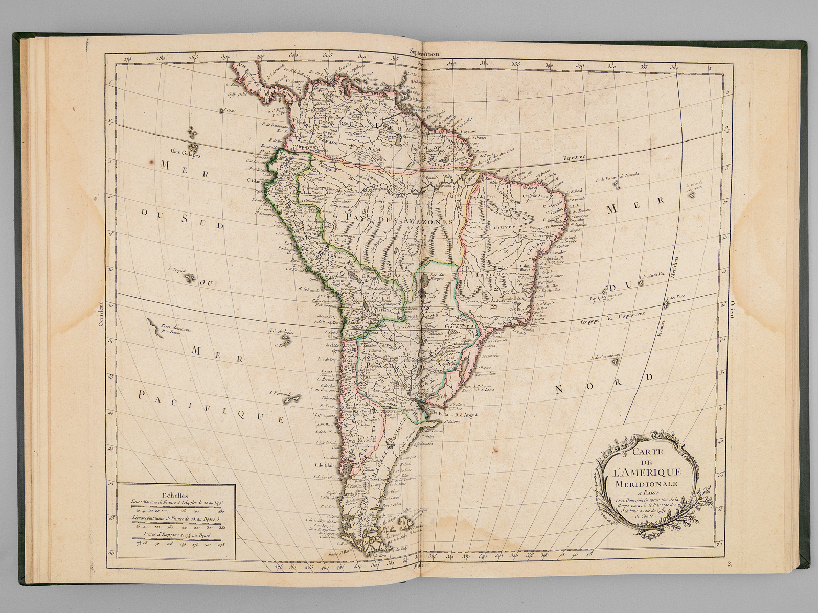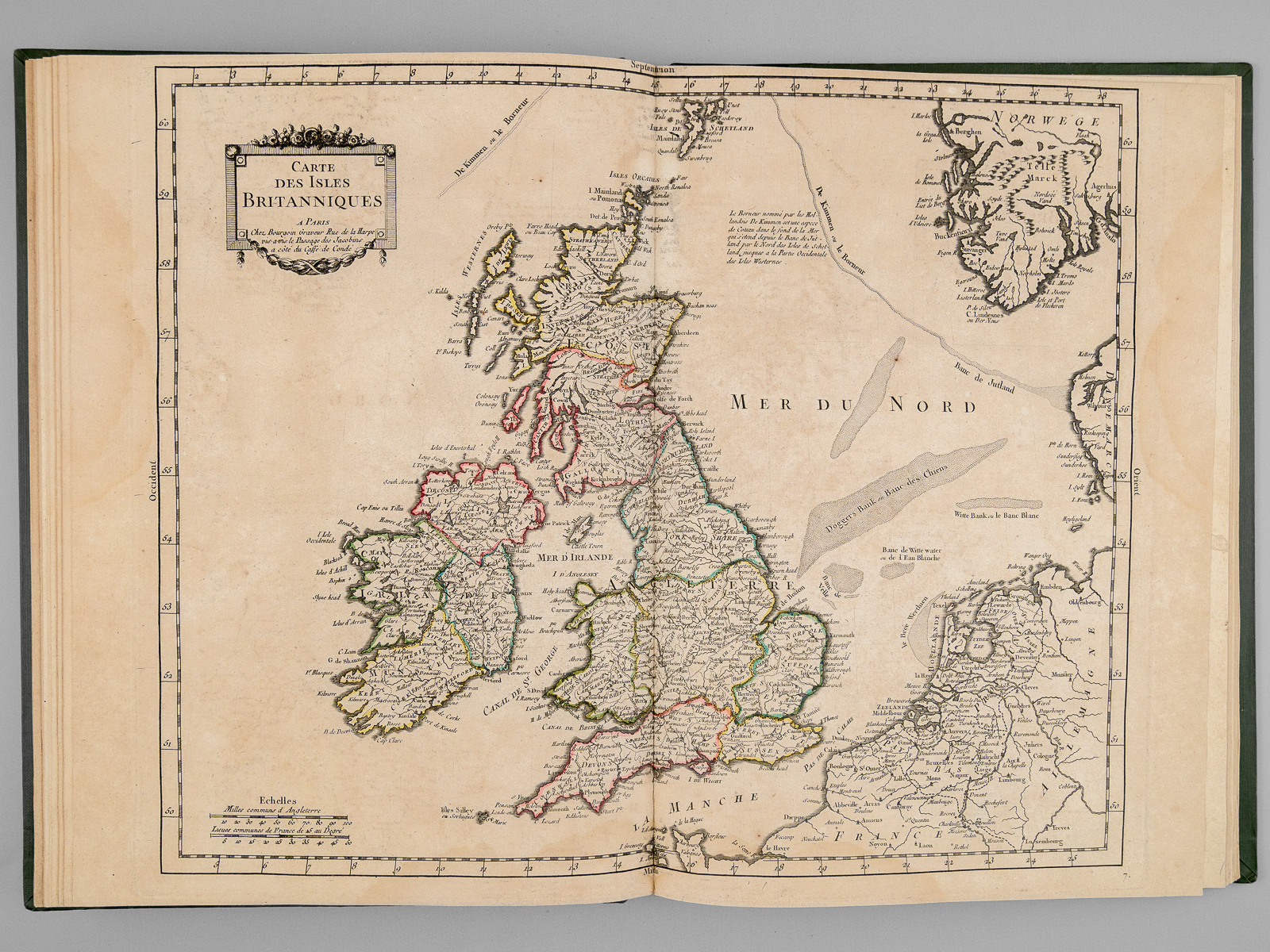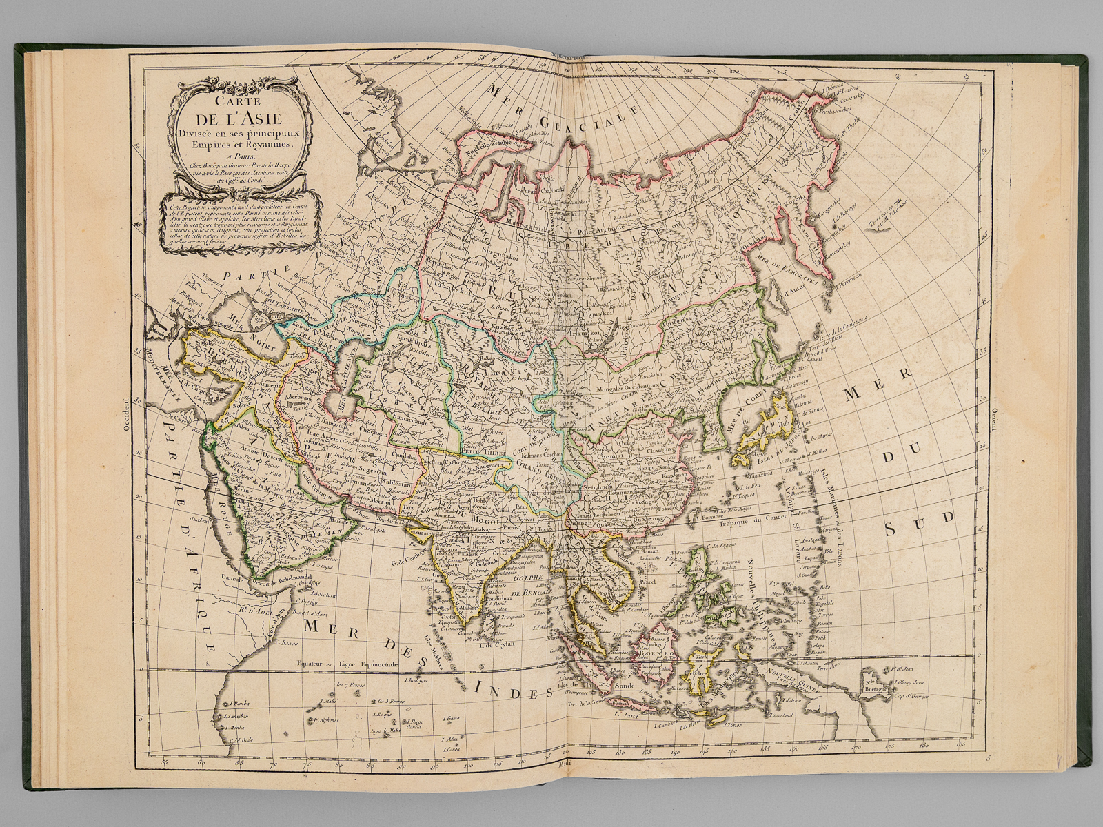 Recueil de cartes et planches en 25 feuilles de format 36 x 50 cm (mesures en marges), en 1 vol. petit in-folio cartonnage moderne (XXe siècle) demi-basane verte, Contient : Carte des diverses positions de la Sphère, des Systèmes de l'Univers, des Planettes, des Eclypses &c. en deux feuilles, [s.l.n.d.] contient notamment Sphère armillaire oblique, globe céleste, globe terreste [ Avec : ] Mappe monde Carte universelle de la Terre dressée sur les Nouvelles Observations de Messieurs de l'Académie Royale des Sciences, Chez Bourgoin Graveur, Rue de la Harpe vis-à-vis le passage des Jacobins à côté du café de Condé, Paris, 1773 [Avec : ] Carte itinéraire de la France divisée par Gouvernements Militaires et en ses Provinces Contenant les Routes Royales et Particulières, Dressée sur la Carte des Triangles levée géométriquement, Première Feuille contenant la Bretagne, la Normandie, le Maine et Perche, Chez Bourgoin 1773 [ Avec : ] Deuxième feuille contenant la Flandre Françoise, Picardie, Artois, Isle de France, Champagne, Lorraine et Alsace [ Avec : ] Troisième feuille contenant une partie de la Bretagne, l'Anjou, la Touraine, le Poitou, la Saintonge, la Marche et le Limosin [ Avec : ] Cinquième feuille contenant la Guienne, le Bearn, la Basse Navarre, le Comté de Foix et une partie du Languedoc [ Avec : ] Sixième feuille contenant le Languedoc, le Dauphiné, la Provence et le Roussillon [ Avec : ] Carte de l'Amérique Septentrionale, Chez Bourgoin, s.d. avec une note sur les découvertes de l'Amiral de Fonte jugées suspectes 'Dans cette Partie on avoit mis les pretendues Decouvertes de l'Amiral de Fonte. La relation en ayant eté trouvé suspecte par plusieurs Auteurs on n'a pas cru devoir les mettre dans cette Carte, dans la Mappemonde elles sont pointées en attendant la verification' [ Avec : ] Carte de l'Amérique Méridionale, Chez Bourgoin, Paris, s.d. [ Avec : ] Carte de l'Asie Divisée en ses principaux Empires et Royaumes, Chez Bourgoin, Paris, s.d. avec cette précision : 'Cette Projection supposant l'oeil du Spectateur au Centre de l'Equateur représente cette Partie comme détachée d'un grand Globe et applatie, les Meridiens et les Paralleles du centre se trouvant plus resserrées et s'elargissant a mesure quils s'en éloignent, cette projection et toutes celles de cette nature ne peuvent souffrir d'Echelles, les quelles seroient fausses' [Avec : ] Carte de l'Europe Divisée en ses Grands Etats, Chez Bourgoin, Paris, s.d. [Avec : ] Cartes des Isles Britanniques, Chez Bourgoin, Paris, s.d. [Avec : ] Carte du Royaume d'Espagne et de Portugal Divisé par Provinces et Royaumes, Chez Bourgoin, Paris, s.d. [ Avec : ] Carte du Royaume de France divisé par Provinces, Chez Bourgoin, Paris, 1765 [ Avec : ] Carte des Pays Bas Divisée en Provinces Hollandoises, Autrichiennes et Françoises, Chez Bourgoin, Paris, s.d. [ Avec : ] Carte de l'Empire d'Allemagne Divisée par Cercles, Chez Bourgoin, Paris, s.d. [ Avec : ] Carte de l'Italie et des Isles adjacentes, Chez Bourgoin, Paris, s.d. [ Avec : ] Carte des XIII Cantons Suisses leurs Alliés et leurs Sujets, Chez Bourgoin, Paris, s.d. [ Avec : ] Royaume d'Hongrie Principauté de Transilvanie et Banat de Temeswar, Chez Bourgoin, Paris, s.d. [ Avec : ] Carte de l'Empire de Turquie en Europe, Chez Bourgoin, Paris, s.d. [ Avec : ] Carte du Royaume du Dannemarck, Chez Bourgoin, Paris, s.d. [ Avec : ] Carte du Royaume de Suède Norwege et Partie du Dannemarck, Chez Bourgoin, Paris, s.d. [ Avec : ] Carte de l'Empire des Russies en Europe Partie Septentrionale, Chez Bourgoin, Paris, 1765 [ Avec : ] Carte de la Judée ou Terre Sainte pour l'Intelligence de l'Histoire Sacréen Chez Bourgoin, Paris, s.d.