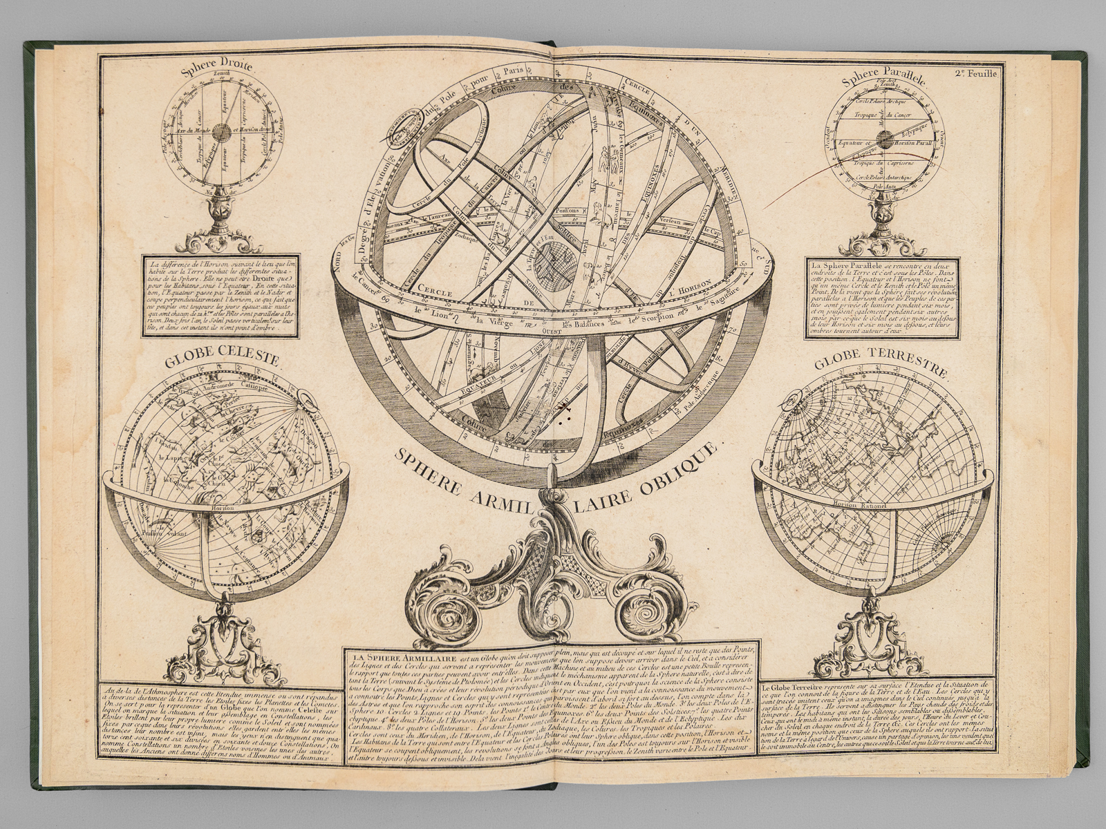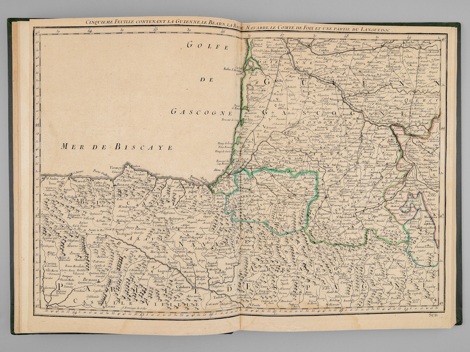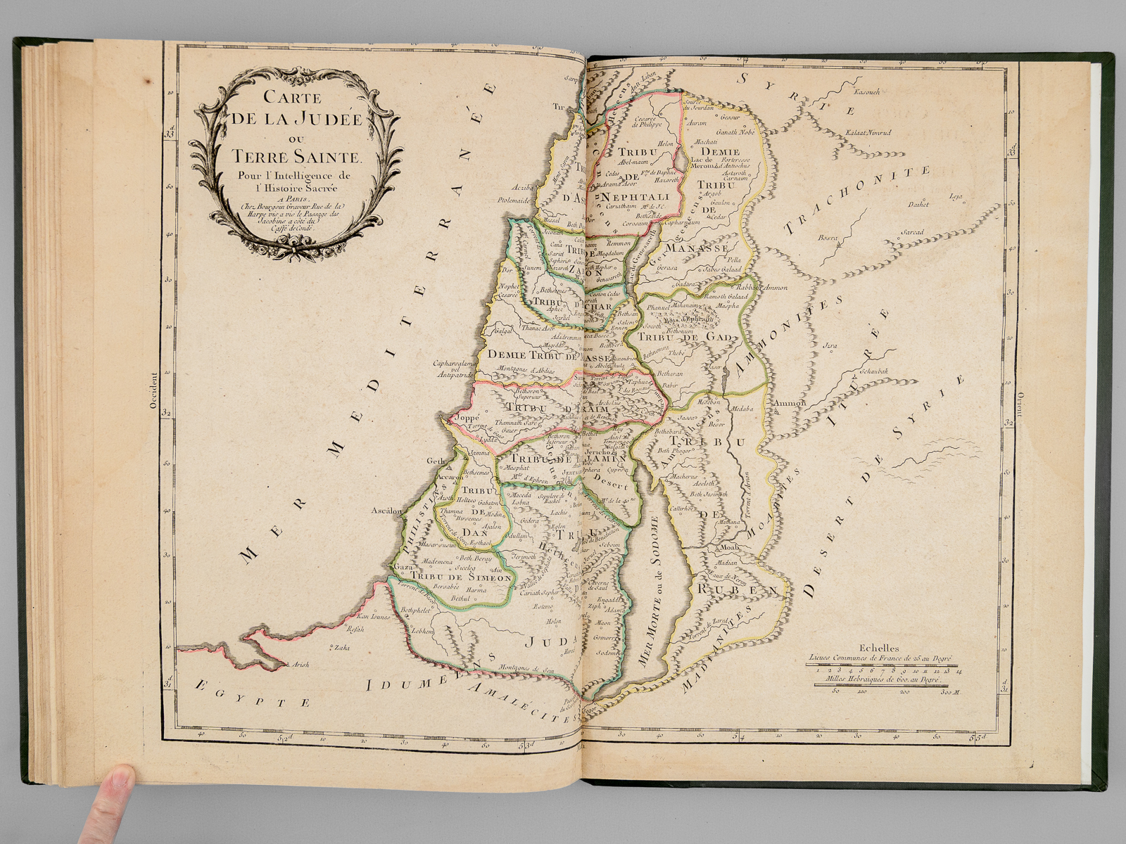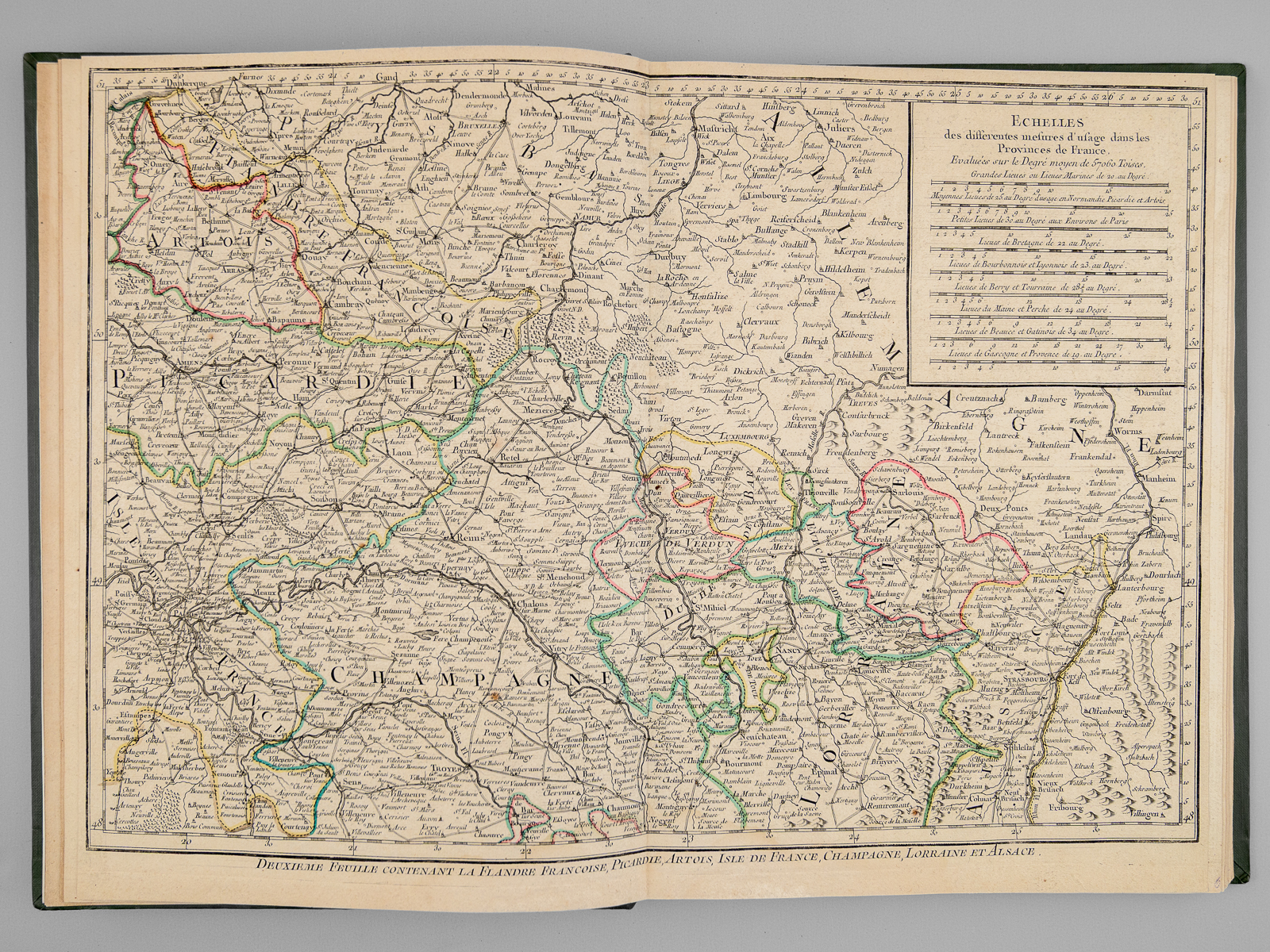 Recueil de cartes et planches en 25 feuilles de format 36 x 50 cm (mesures en marges), en 1 vol. petit in-folio cartonnage moderne (XXe siècle) demi-basane verte, Contient : Carte des diverses positions de la Sphère, des Systèmes de l'Univers, des Planettes, des Eclypses &c. en deux feuilles, [s.l.n.d.] contient notamment Sphère armillaire oblique, globe céleste, globe terreste [ Avec : ] Mappe monde Carte universelle de la Terre dressée sur les Nouvelles Observations de Messieurs de l'Académie Royale des Sciences, Chez Bourgoin Graveur, Rue de la Harpe vis-à-vis le passage des Jacobins à côté du café de Condé, Paris, 1773 [Avec : ] Carte itinéraire de la France divisée par Gouvernements Militaires et en ses Provinces Contenant les Routes Royales et Particulières, Dressée sur la Carte des Triangles levée géométriquement, Première Feuille contenant la Bretagne, la Normandie, le Maine et Perche, Chez Bourgoin 1773 [ Avec : ] Deuxième feuille contenant la Flandre Françoise, Picardie, Artois, Isle de France, Champagne, Lorraine et Alsace [ Avec : ] Troisième feuille contenant une partie de la Bretagne, l'Anjou, la Touraine, le Poitou, la Saintonge, la Marche et le Limosin [ Avec : ] Cinquième feuille contenant la Guienne, le Bearn, la Basse Navarre, le Comté de Foix et une partie du Languedoc [ Avec : ] Sixième feuille contenant le Languedoc, le Dauphiné, la Provence et le Roussillon [ Avec : ] Carte de l'Amérique Septentrionale, Chez Bourgoin, s.d. avec une note sur les découvertes de l'Amiral de Fonte jugées suspectes 'Dans cette Partie on avoit mis les pretendues Decouvertes de l'Amiral de Fonte. La relation en ayant eté trouvé suspecte par plusieurs Auteurs on n'a pas cru devoir les mettre dans cette Carte, dans la Mappemonde elles sont pointées en attendant la verification' [ Avec : ] Carte de l'Amérique Méridionale, Chez Bourgoin, Paris, s.d. [ Avec : ] Carte de l'Asie Divisée en ses principaux Empires et Royaumes, Chez Bourgoin, Paris, s.d. avec cette précision : 'Cette Projection supposant l'oeil du Spectateur au Centre de l'Equateur représente cette Partie comme détachée d'un grand Globe et applatie, les Meridiens et les Paralleles du centre se trouvant plus resserrées et s'elargissant a mesure quils s'en éloignent, cette projection et toutes celles de cette nature ne peuvent souffrir d'Echelles, les quelles seroient fausses' [Avec : ] Carte de l'Europe Divisée en ses Grands Etats, Chez Bourgoin, Paris, s.d. [Avec : ] Cartes des Isles Britanniques, Chez Bourgoin, Paris, s.d. [Avec : ] Carte du Royaume d'Espagne et de Portugal Divisé par Provinces et Royaumes, Chez Bourgoin, Paris, s.d. [ Avec : ] Carte du Royaume de France divisé par Provinces, Chez Bourgoin, Paris, 1765 [ Avec : ] Carte des Pays Bas Divisée en Provinces Hollandoises, Autrichiennes et Françoises, Chez Bourgoin, Paris, s.d. [ Avec : ] Carte de l'Empire d'Allemagne Divisée par Cercles, Chez Bourgoin, Paris, s.d. [ Avec : ] Carte de l'Italie et des Isles adjacentes, Chez Bourgoin, Paris, s.d. [ Avec : ] Carte des XIII Cantons Suisses leurs Alliés et leurs Sujets, Chez Bourgoin, Paris, s.d. [ Avec : ] Royaume d'Hongrie Principauté de Transilvanie et Banat de Temeswar, Chez Bourgoin, Paris, s.d. [ Avec : ] Carte de l'Empire de Turquie en Europe, Chez Bourgoin, Paris, s.d. [ Avec : ] Carte du Royaume du Dannemarck, Chez Bourgoin, Paris, s.d. [ Avec : ] Carte du Royaume de Suède Norwege et Partie du Dannemarck, Chez Bourgoin, Paris, s.d. [ Avec : ] Carte de l'Empire des Russies en Europe Partie Septentrionale, Chez Bourgoin, Paris, 1765 [ Avec : ] Carte de la Judée ou Terre Sainte pour l'Intelligence de l'Histoire Sacréen Chez Bourgoin, Paris, s.d.