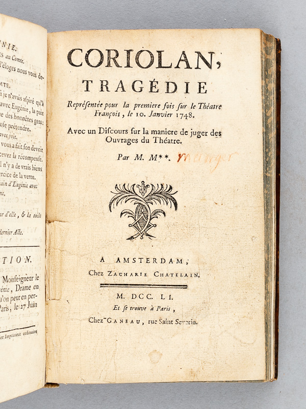 1 vol. in-8 reliure de l'époque plein veau brun marbré, dos à 5 nerfs richement orné : Eugénie, Drame en cinq Actes en Prose, enrichi de figures en taille-douce ; avec un Essai sur le Drame Sérieux [ Editon originale ], Chez Merlin, Paris, 1767, 1 f., xliv-118 pp. [ Avec : ] Coriolan, Tragédie, Représentée pour la première fois sur le Théatre François le 10 Janvier 1748, Avec un Discours sur la manière de juger des Ouvrages du Théatre par M. M** [ MAUGER ; Editon originale ], Chez Zacharie Chatelain, Amsterdam, Chez Ganeau, à Paris, 1751, 112 pp. (accroc en page de titre) [ Avec : ] Béverlei, Tragédie bourgeoise, imitée de l'Anglois, en cinq Actes et en vers Libres par M. Saurin, Chez la Veuve Duchesne, Paris, 1770, 96 pp. [ Avec : ] Le Père de Famille, Drame en cinq Actes, et en Prose, par M. Diderot, conforme à la Représentation, Chez la Veuve Duchesne, Delalain, Paris, 1772, 159 pp. (anciens trous de brochage en marge intérieure) [ Avec : ] Anacréon, Citoyen, Chez Monory, Amsterdam, 1774, 33 pp.