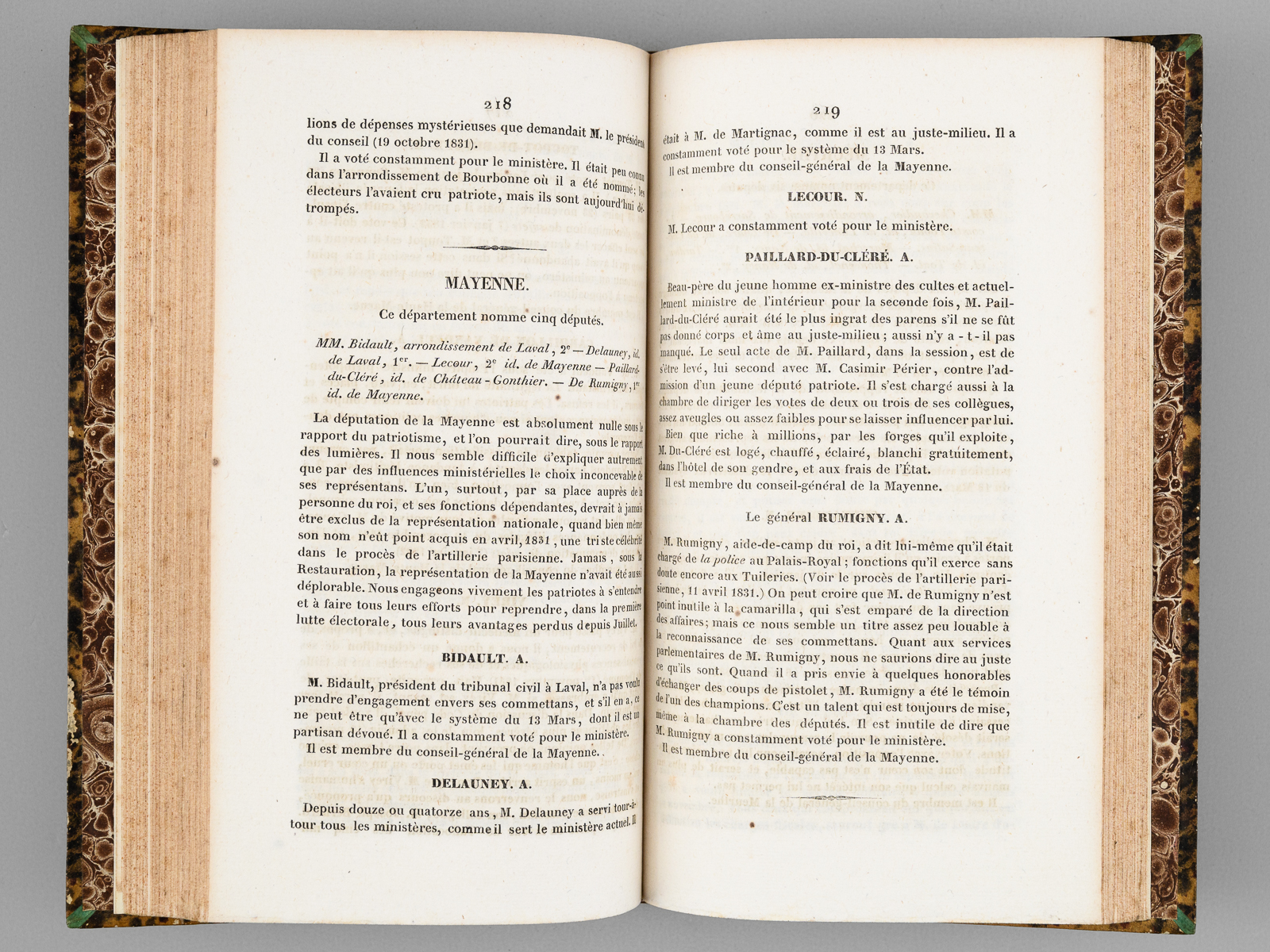 1 vol. in-8 reliure demi-veau brun, dos à 4 nerfs orné, Paulin, Paris, 5 Juillet 1832, VI-359 pp. Commentaire : Très intéressant ouvrage, publié par la société de tendance libérale 'Aide-toi, le Ciel t'aidera'. Fondée au mois d'août 1827, présidée par Guizot, cette société organisa les funérailles de Manuel (première manifestation publique contre Charles X) et son action obtint 180 députés sur 430 sièges aux élections de novembre 1827, influençant le ministère Martignac. En crise après ces élections (Guizot en demeure simple membre), la société continue ses activités sous Louis-Philippe, sous la direction d'Etienne Garnier-Pagès. Il s'agit de la seconde partie des 'Notes et jugemens sur la Chambre de 1830' L'ouvrage passe en revue avec verve l'intégralité des députés, département par département. Bel exemplaire