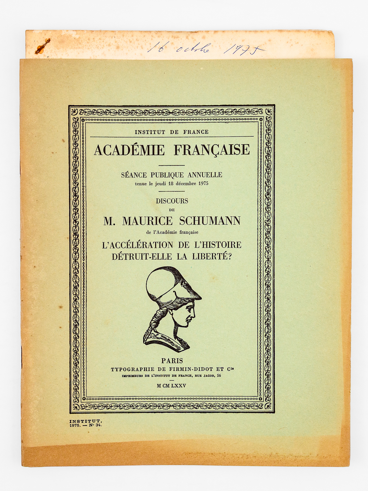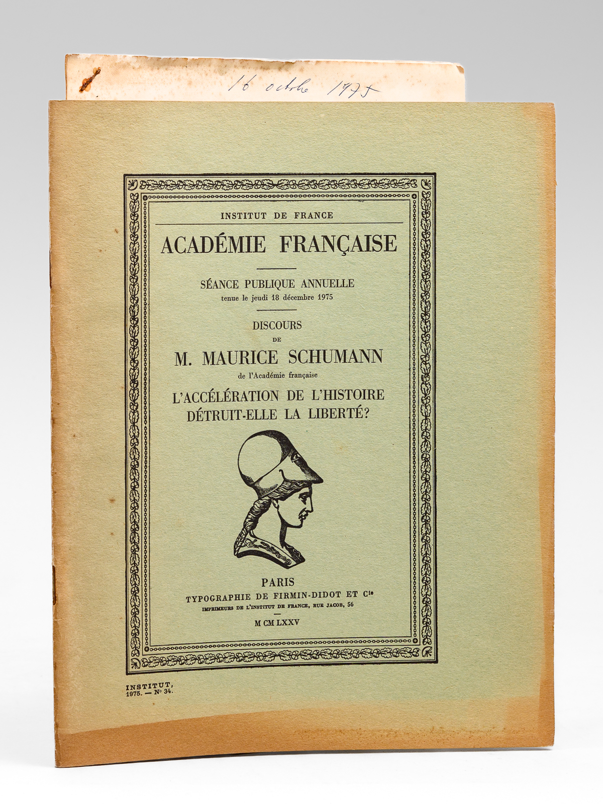 Copie du tapuscrit d'un discours consacré à François Mauriac, daté du 16 octobre 1975 et dédicacé à Maurice Druon [ On joint : ] L'Accélération de l'Histoire détruit-elle la libert&eacu - Auteur: SCHUMANN, Maurice - Année d'édition: 1975