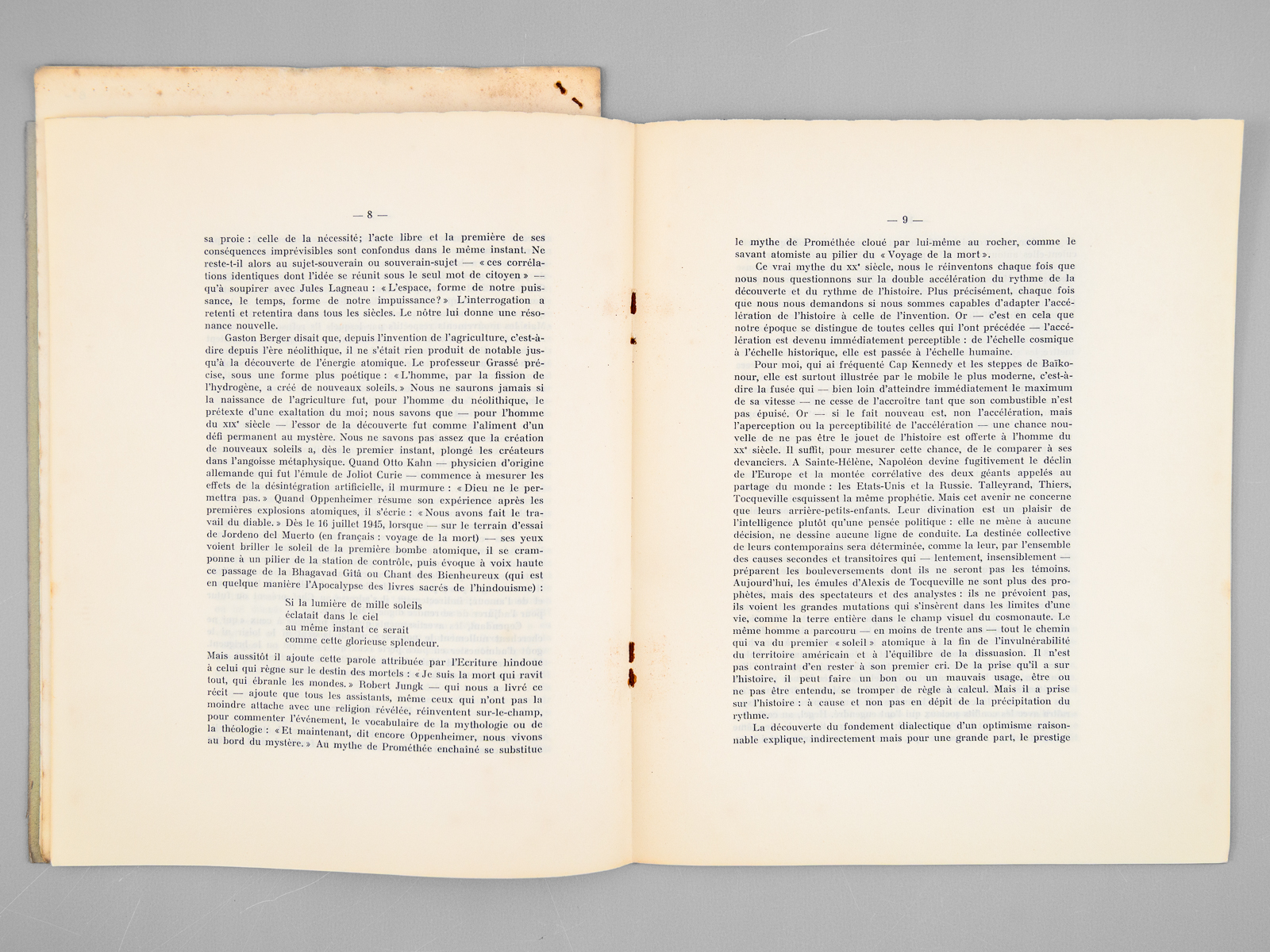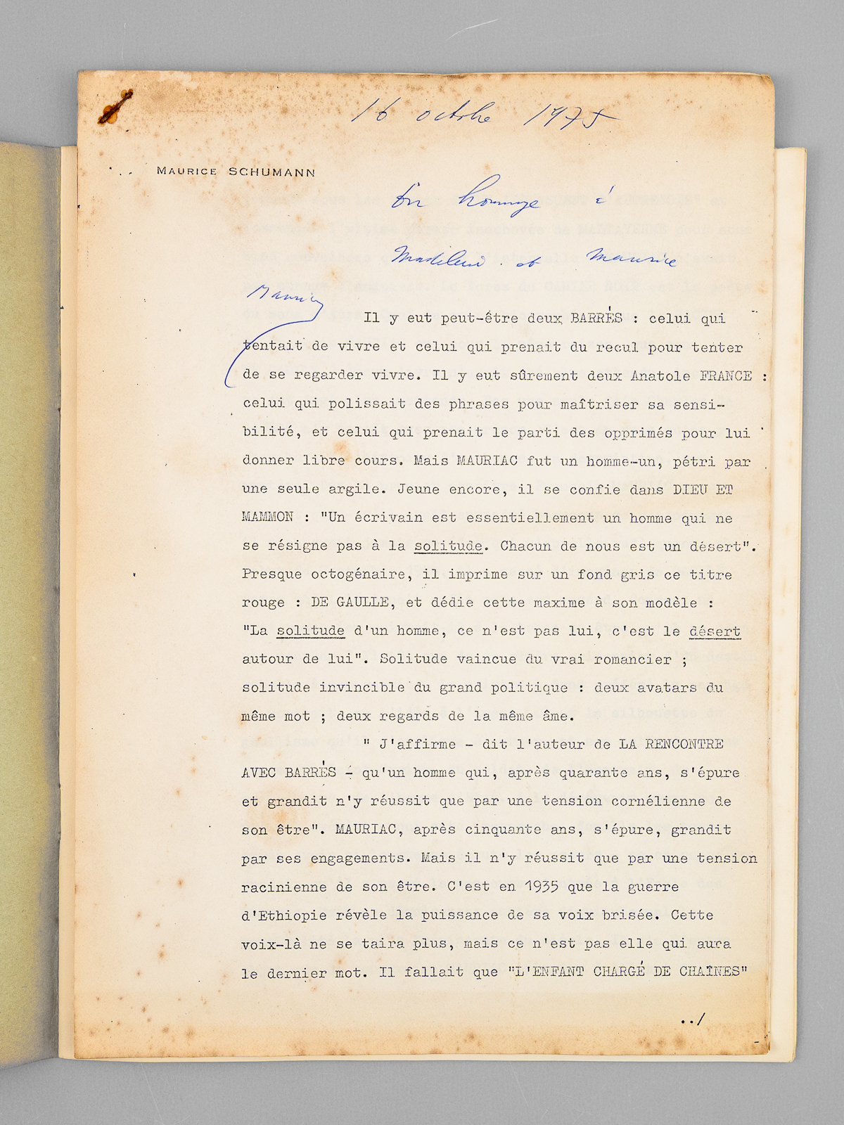 Copie du tapuscrit d'un discours consacré à François Mauriac, daté du 16 octobre 1975 et dédicacé à Maurice Druon [ On joint : ] L'Accélération de l'Histoire détruit-elle la libert&eacu