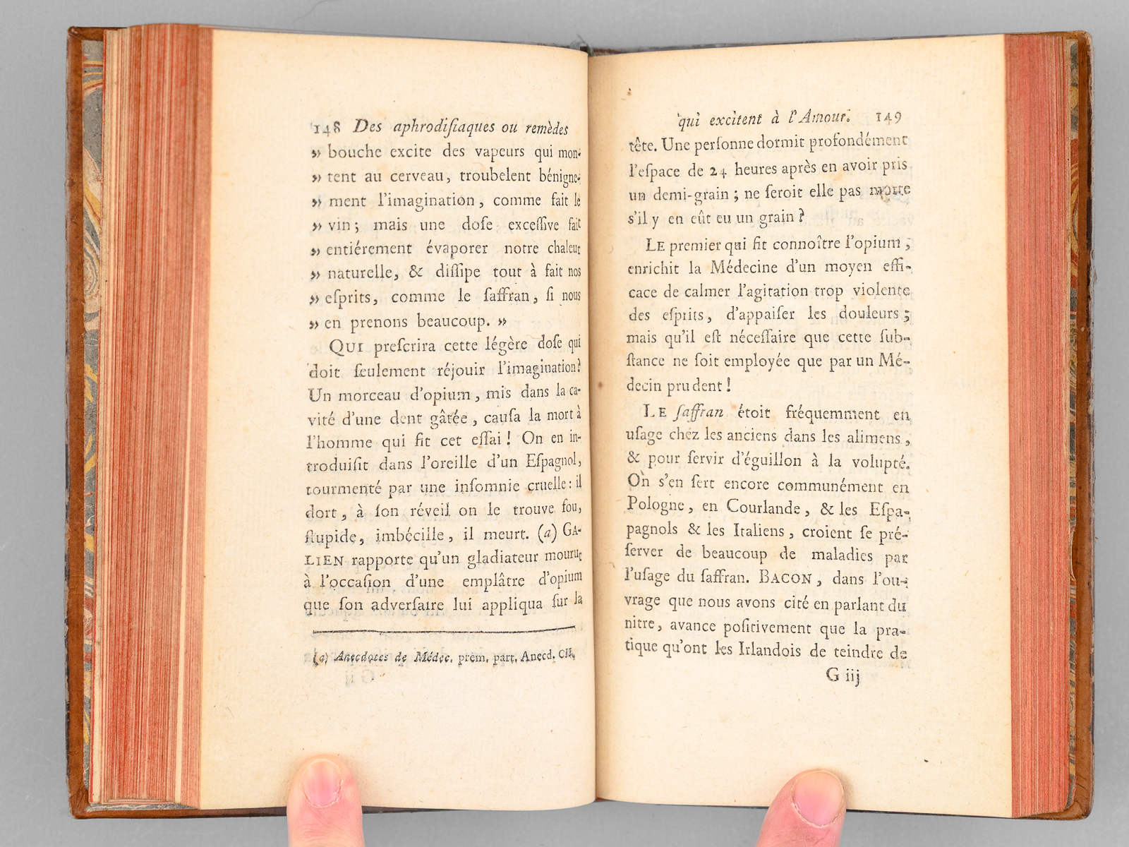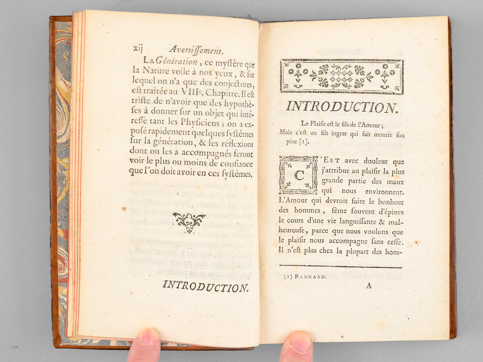 Commentaire : Bon exemplaire en reliure plein veau d'époque de ce véritable traité d'éducation sexuelle, qui s'ouvre sur une étude des 'tempéraments' mais aborde rapidement les aspects plus matériels et suggestifs (infimes frott. en plats, très bon état par ailleurs).