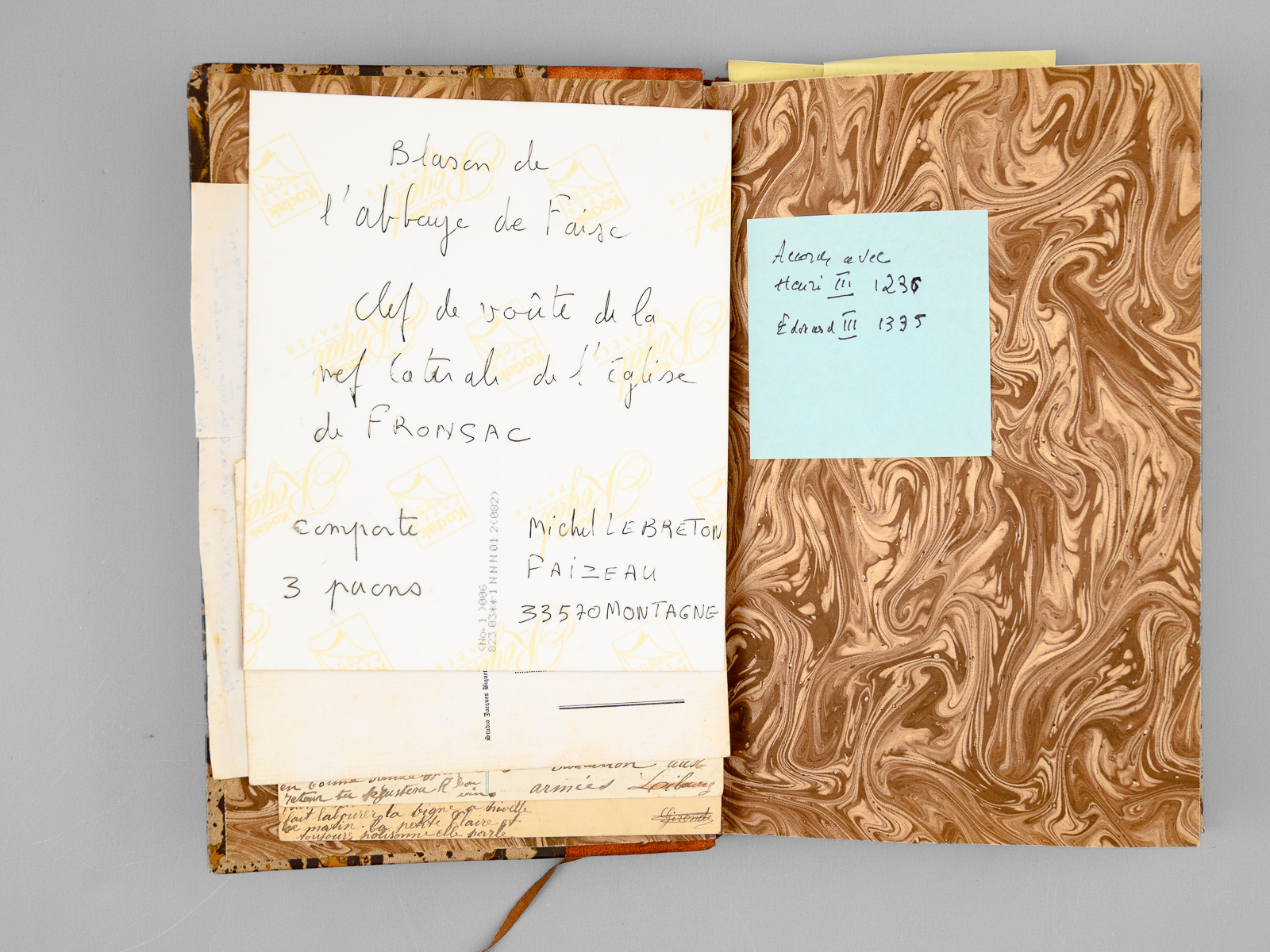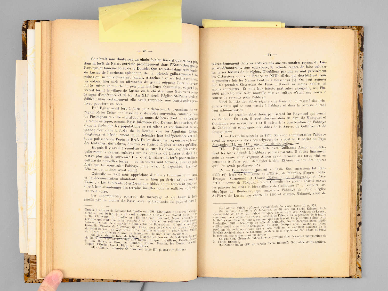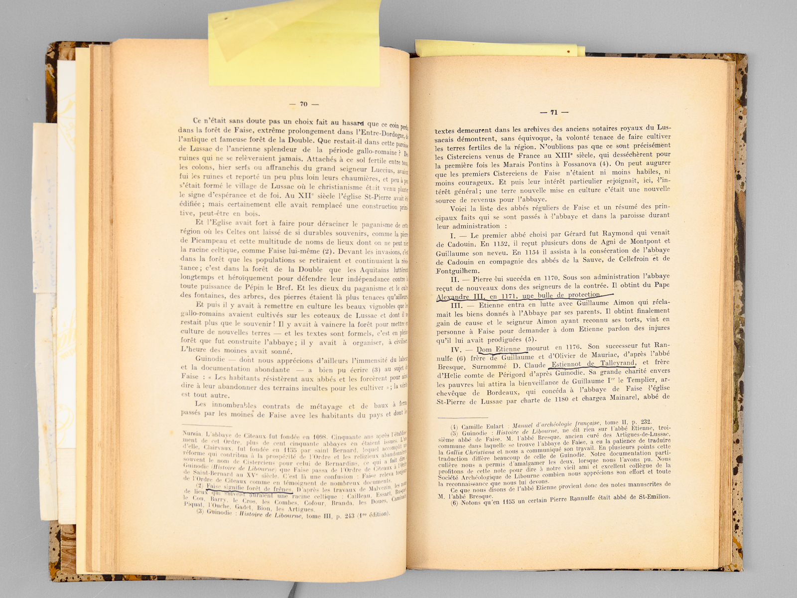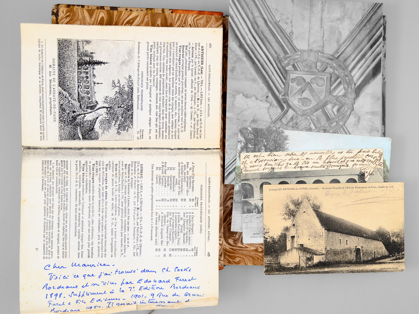 Commentaire : Remarquable provenance pour cette monographie de l'Abbaye de Faize : de la bibliothèque de Maurice Druon, qui acquit le domaine en 1972. L'ouvrage est truffé de quelques documents, dont 2 cartes postales anciennes de l'Abbaye (anciens cloîtres et ancienne chapelle), nous avons laissé les 'post-it' placés par Maurice Druon. Bon état (qq. annotations)