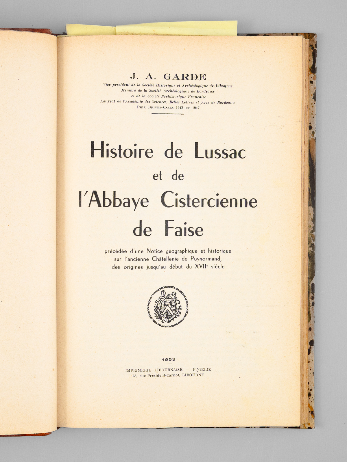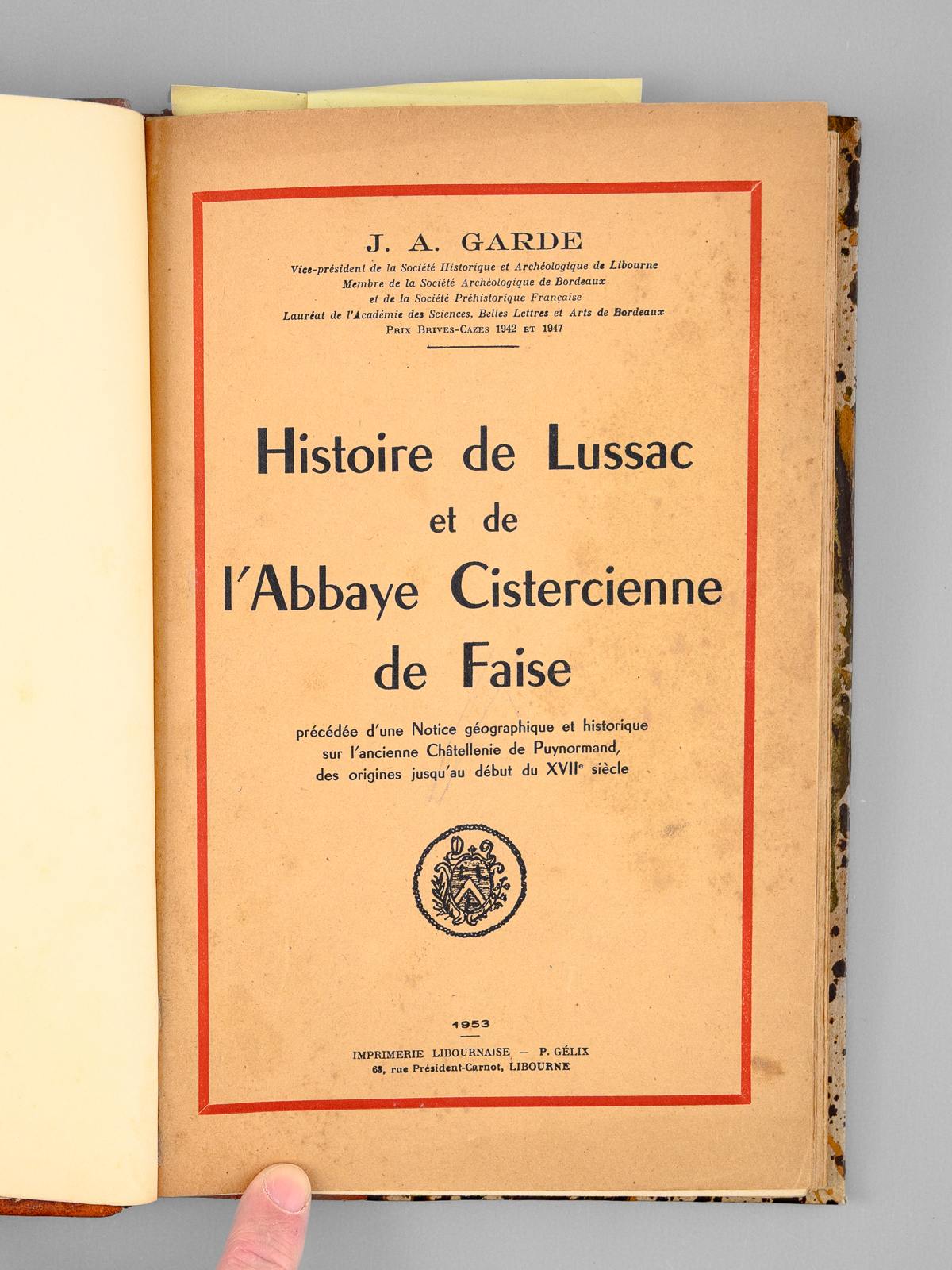 1 vol. in-8 reliure demi-basane brune, dos à 4 nerfs, couverture conservée, Imprimerie Libournaise P. Gélix, Libourne, 1953, 200 pp.