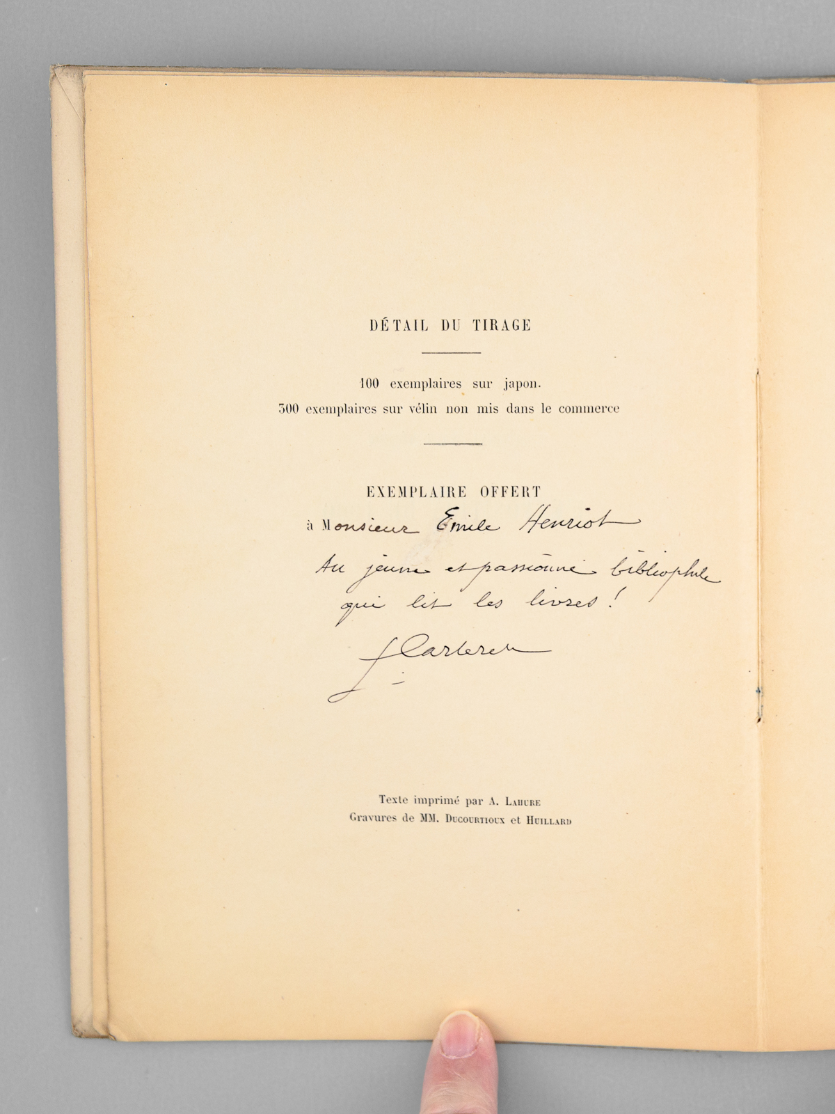 Commentaire : Exemplaire sur papier du Japon offert par Léopold Carteret 'à Monsieur Emile Henriot, Au jeune et passionné bibliophie qui lit les livres !'. Bel exemplaire.
