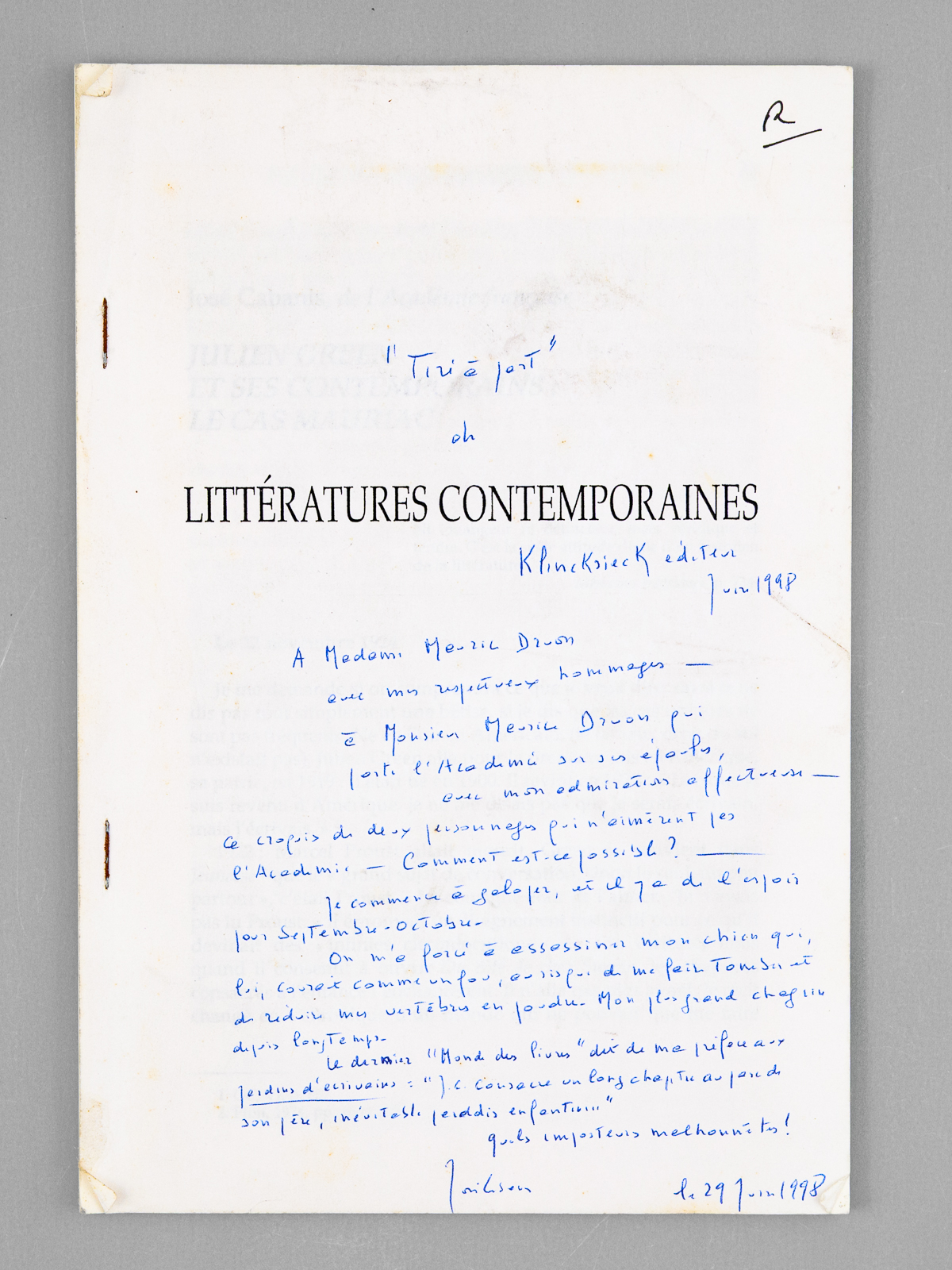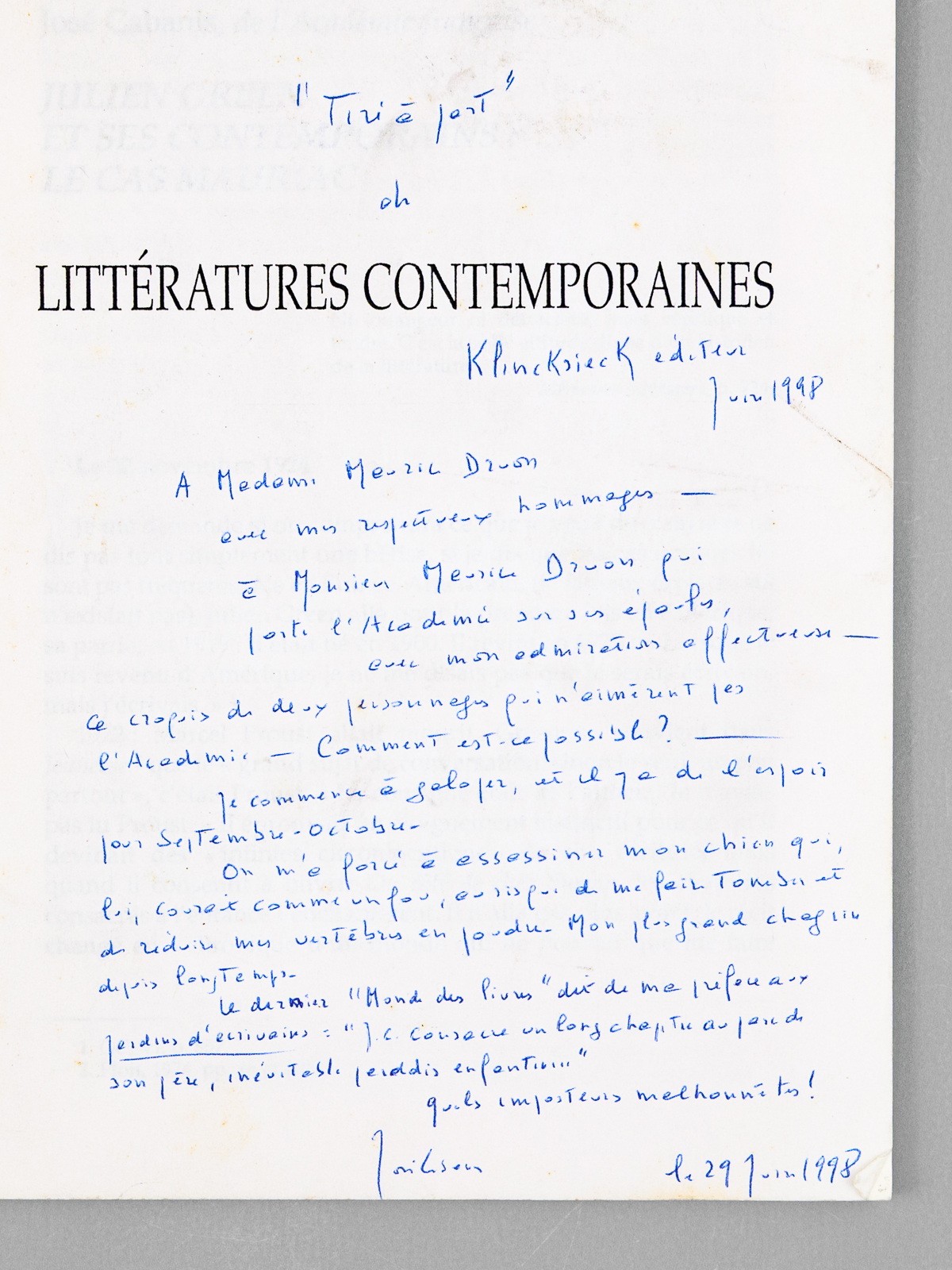 Commentaire : Superbe envoi autographe signé de José Cabanis de cet article, tiré-à-part de l'ouvrage collectif 'Littératures contemporaines', adressé à Madame Maurice Druon et 'à Monsieur Maurice Druon qui porte l'Académie sur ses épaules, avec mon admiration affectueuse. Ce croquis de deux personnages qui n'aimèrent pas l'Académie. Comment est-ce possible ? Je commence à galoper, et il y a de l'espoir pour Septembre-Octobre. On m'a forcé à assassiner mon chien qui, lui, courait comme un fou, au risque de me faire tomber et de réduire mes vertèbres en poudre. Mon plus grand chagrin depuis longtemps. Le dernier 'Monde des Livres' dit de ma préface aux 'Jardins d'écrivains' : 'J.C. consacre un long chapitre au parc de son père, inévitable paradis enfantin...' Quels imposteurs malhonnêtes'. Bon état (couv. un peu frottée).