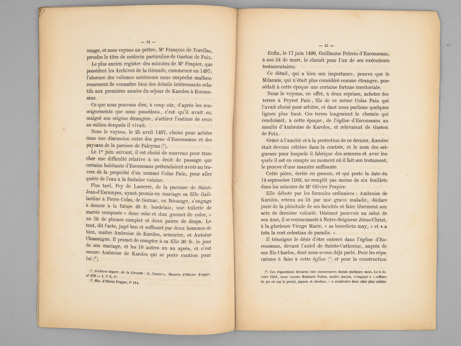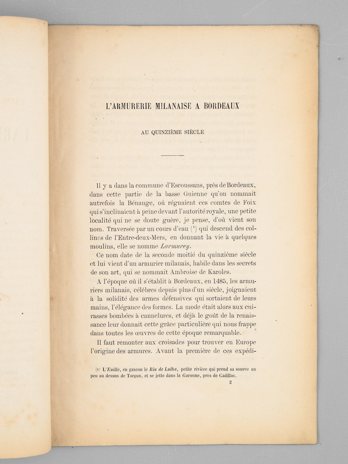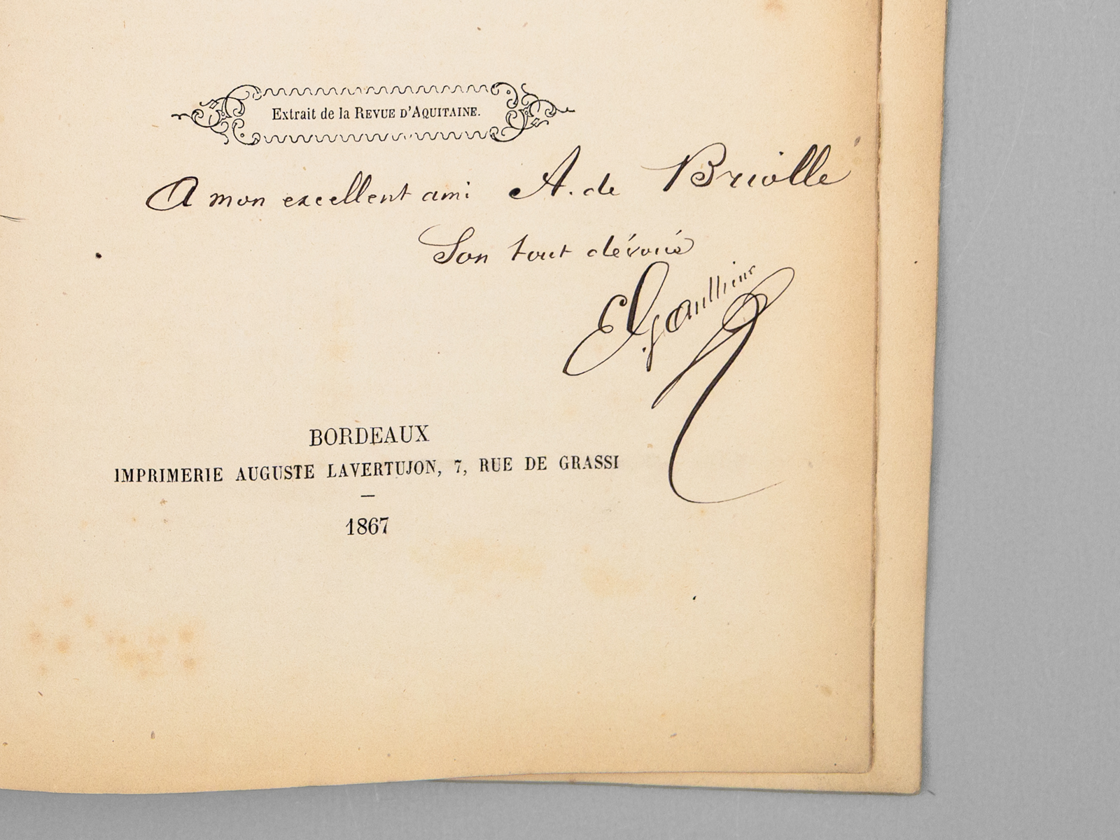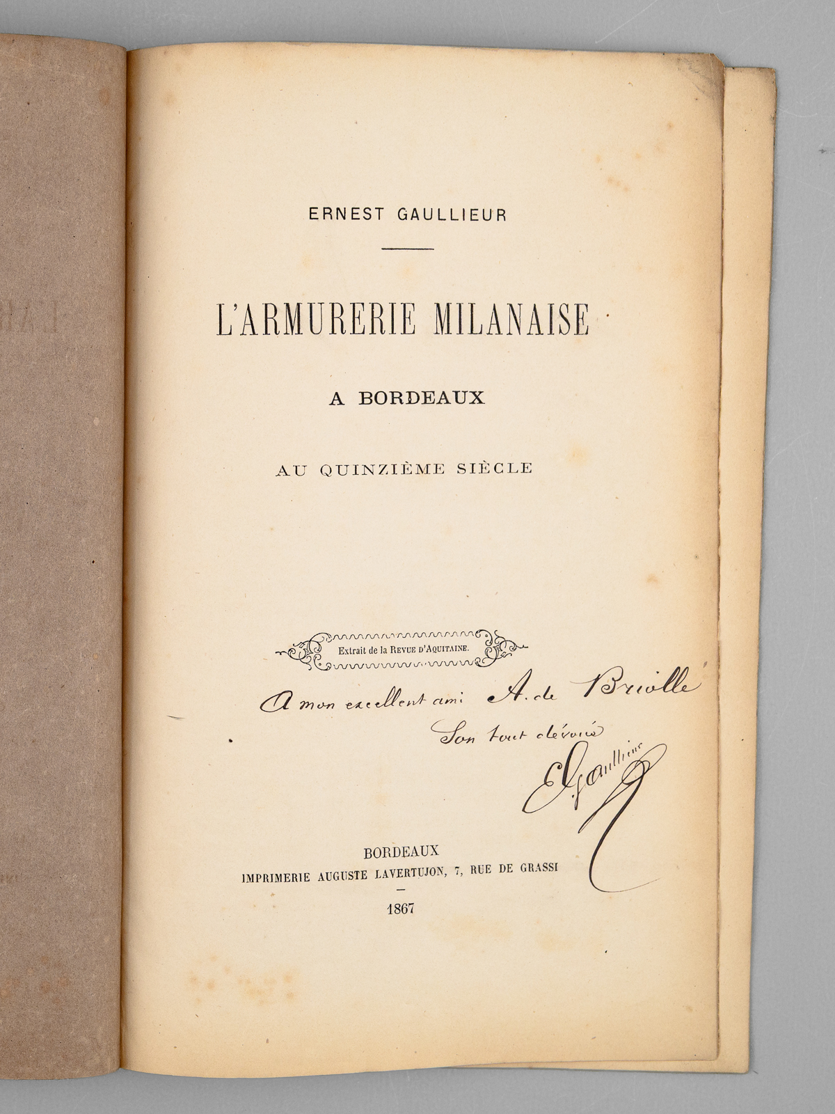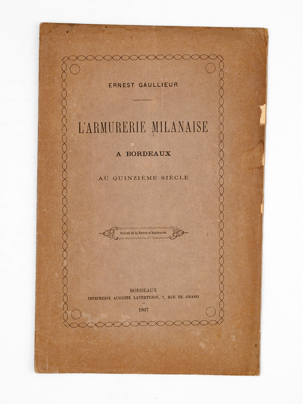 Commentaire : Envoi de l'auteur 'A mon excellent ami A. de Briolle, son tout dévoué E. Gaullieur'. Rare exemplaire de l'édition originale de cet article évoquant l'armurier milanais Ambroise de Karoles, établi à Bordeaux en 1485.