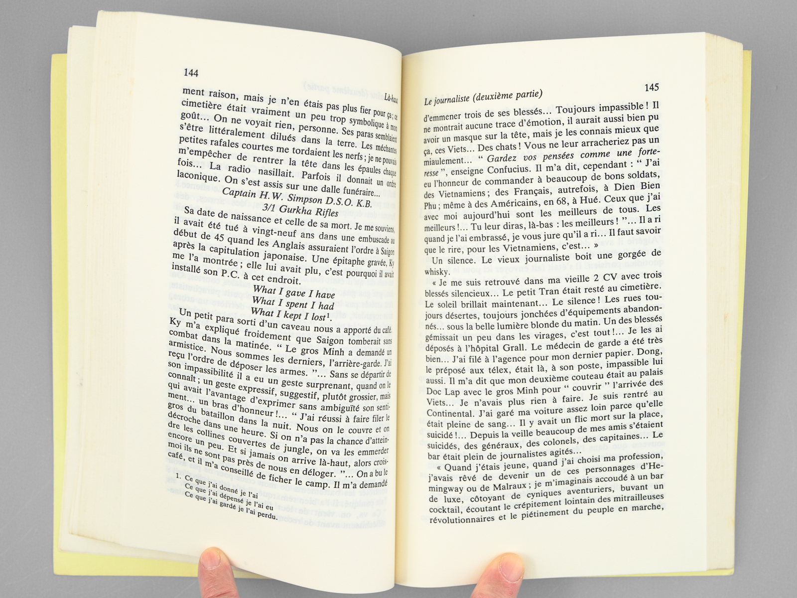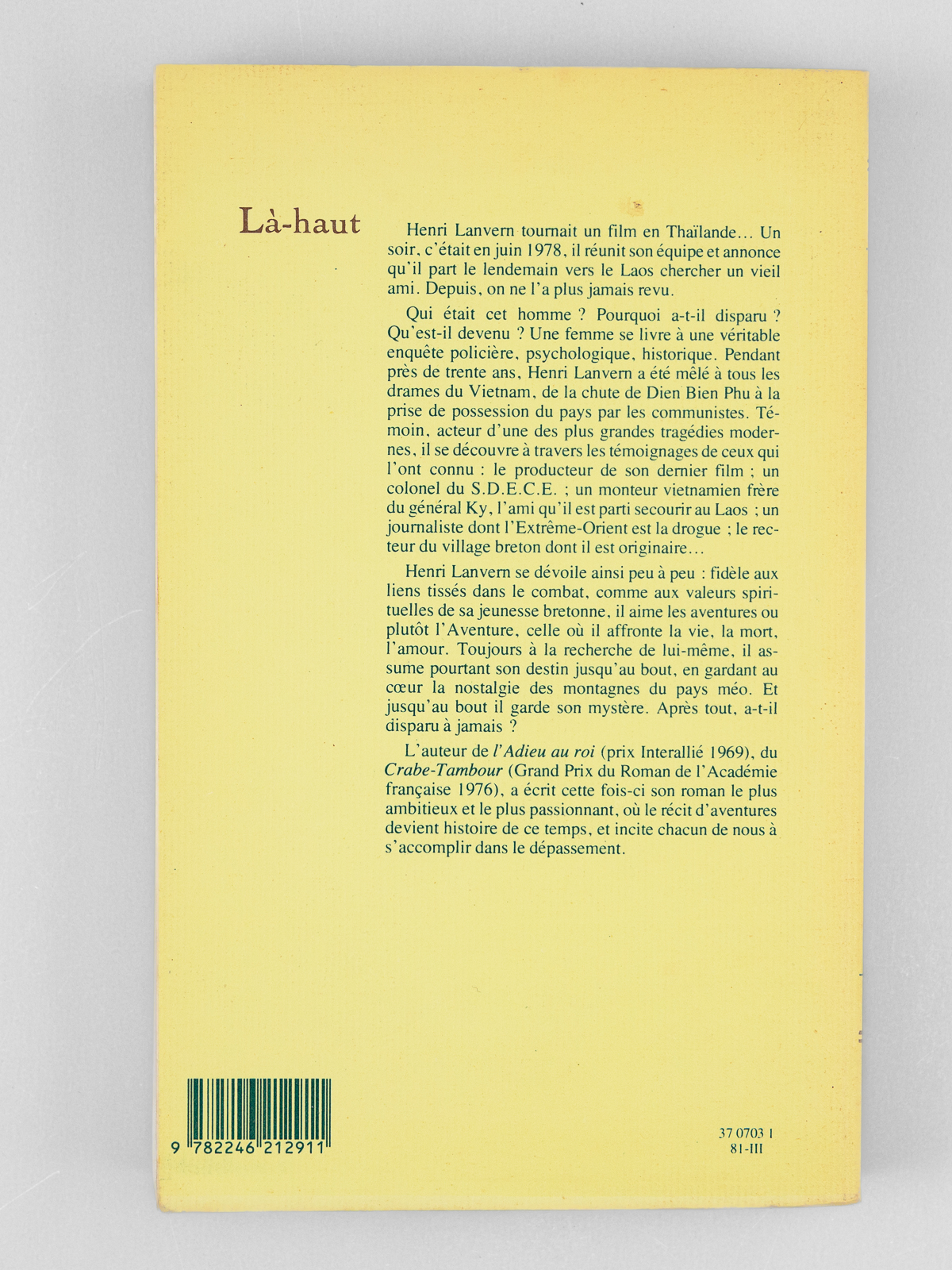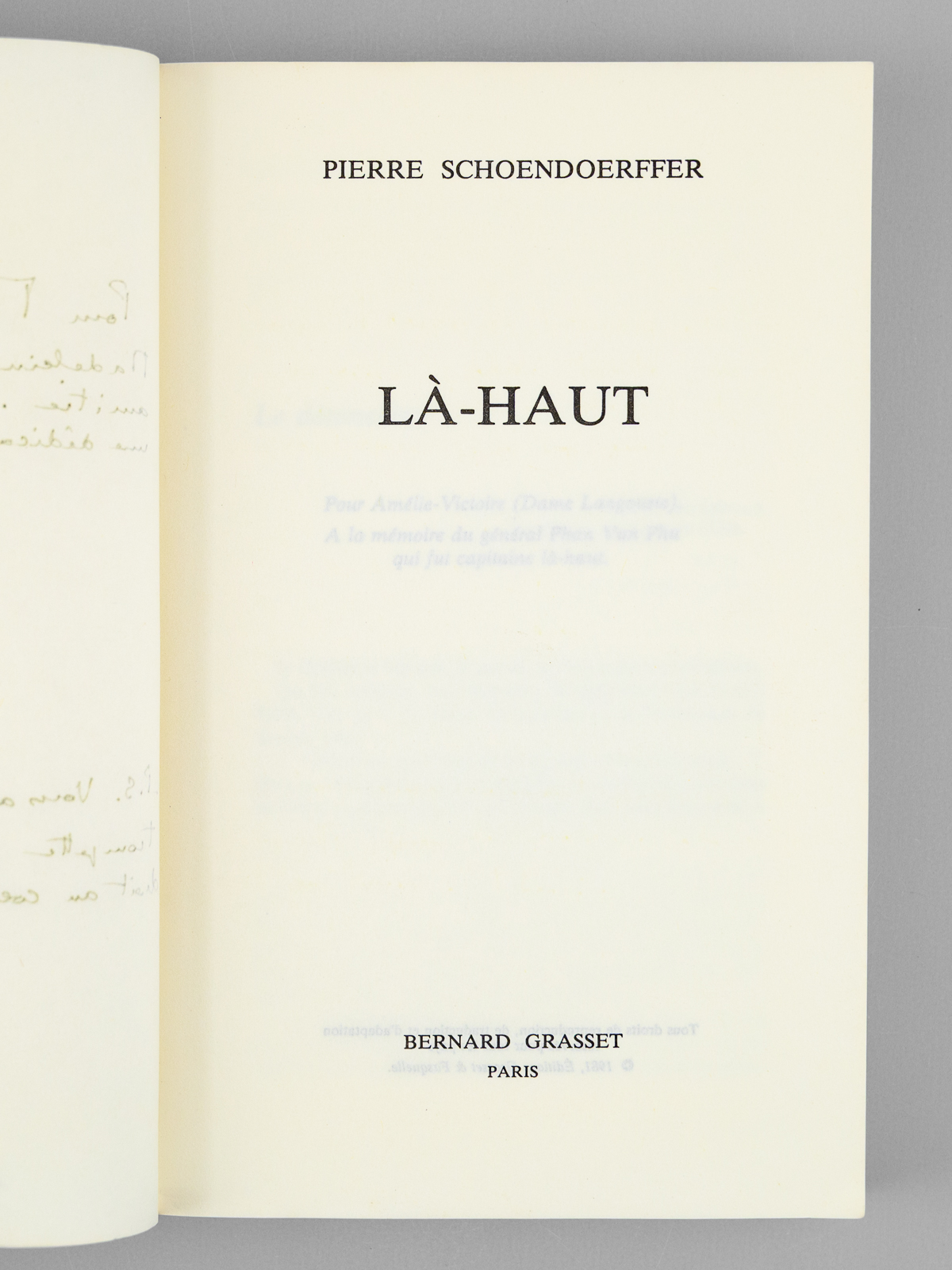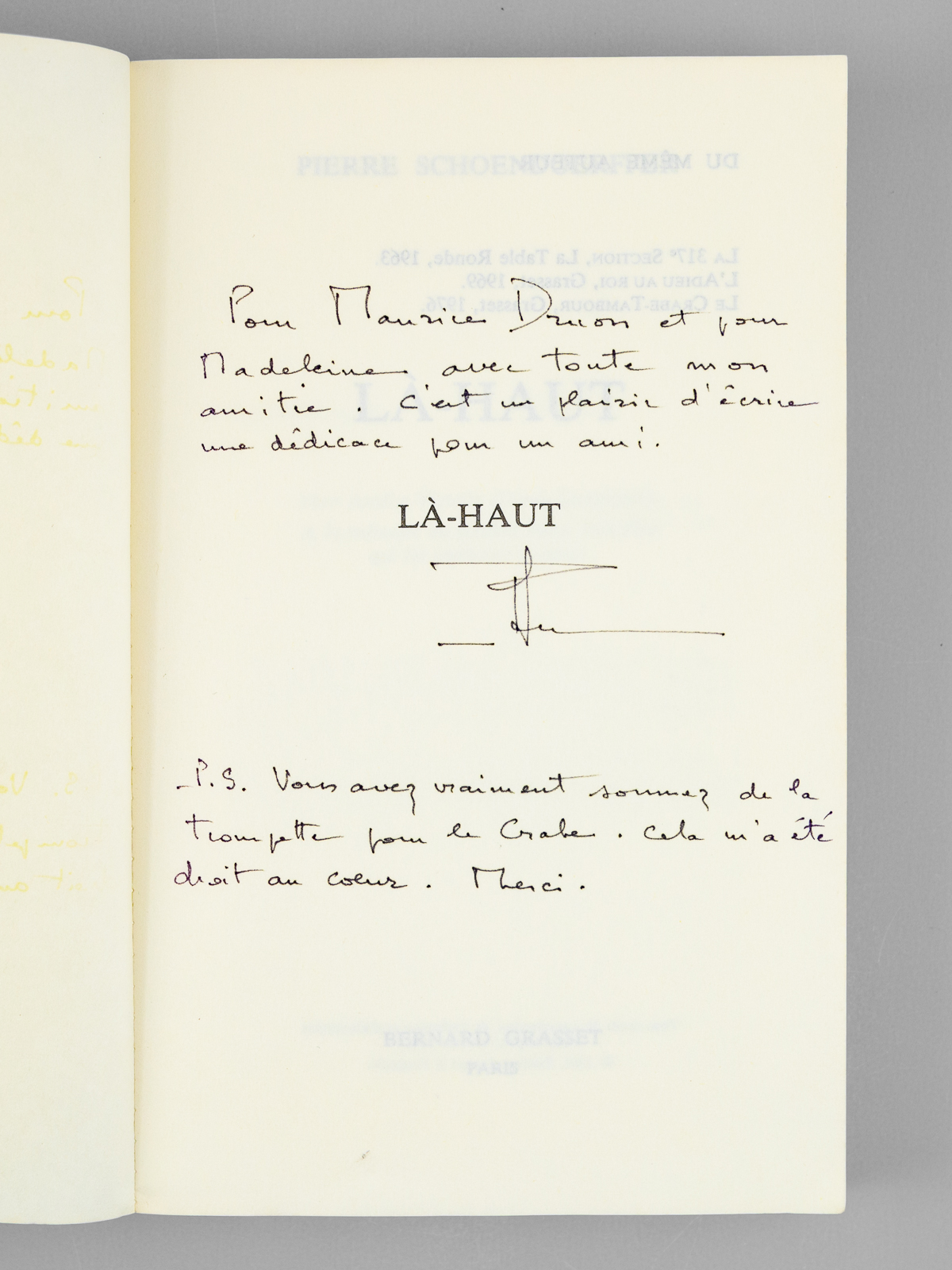 Envoi ms. de l'auteur, 1 vol. in-8 br., Bernard Grasset, Paris, 1981, 349 pp Commentaire : Bel envoi de Pierre Schoendoerffer 'Pour Maurice Druon et pour Madeleine, avec toute mon amitié. C'est un plaisir d'écrire une dédicace pour un ami. P.S. : Vous avez vraiment sonnez (sic) de la trompette pour le Crabe. Cela m'a été droit au coeur. Merci'. Bon état (couv. très lég. frottée)