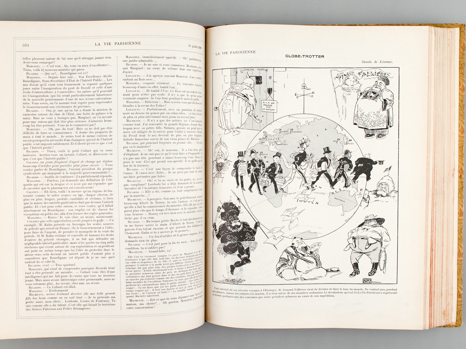 1 vol. fort in-folio reliure demi-basane marron, dos à 5 nerfs orné, couvertures conservées, La Vie Parisienne. Année 1908 Complète (Du 4 janvier 1908 au 26 décembre 1908 : 52 numéros ), 942 pp. Commentaire : Rare exemplaire bien complet, en bon état et bien complet des couvertures (reliure un peu frottée, petit accroc à la planche dépliante, bon exemplaire par ailleurs).