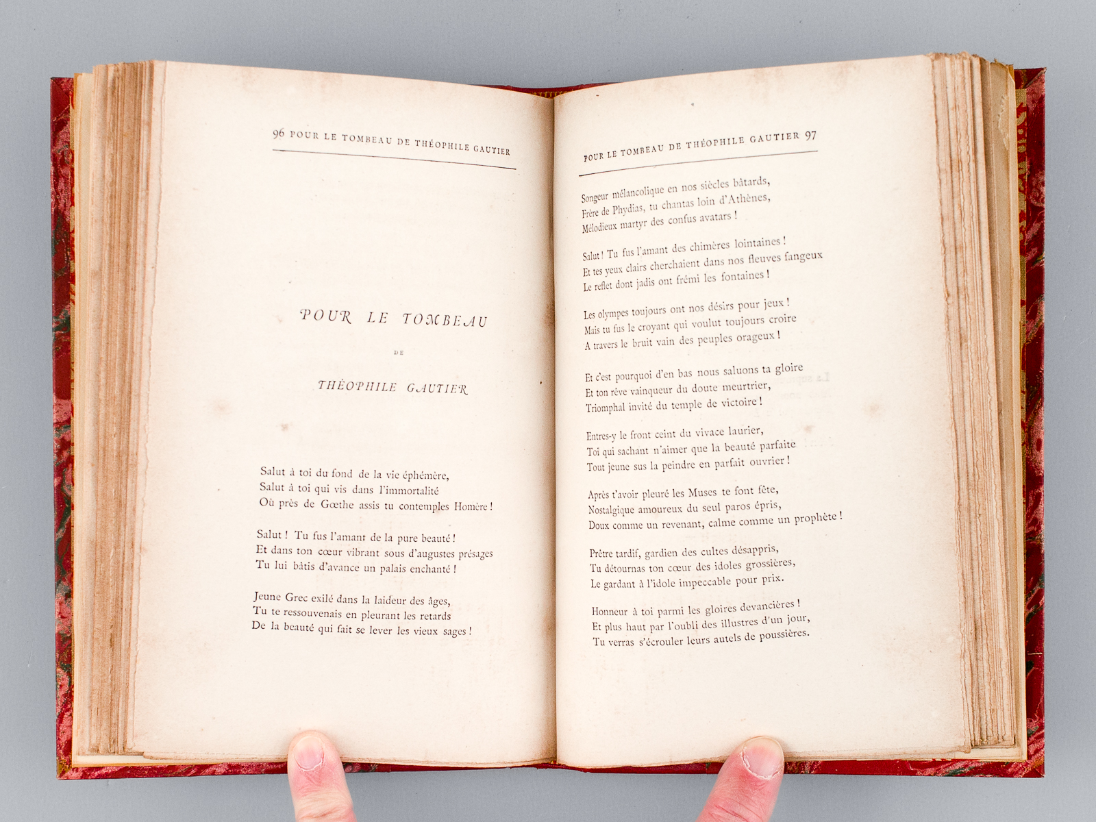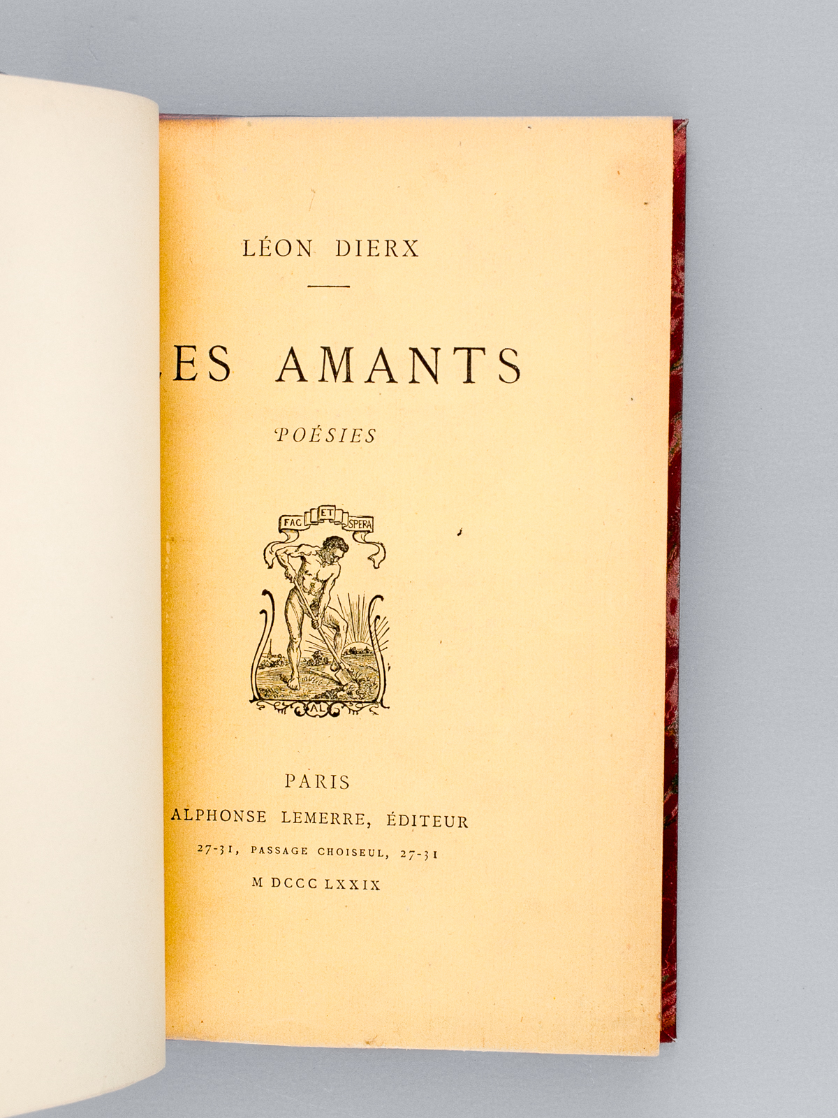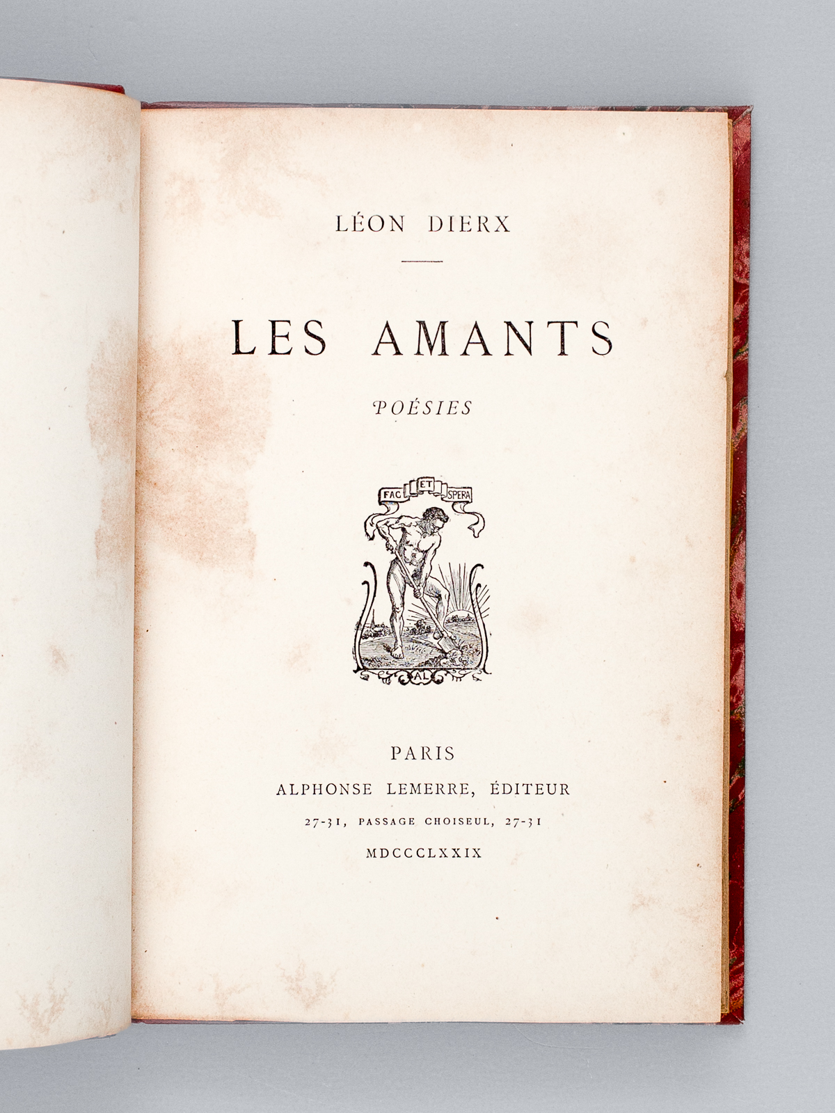 1 vol. in-12 reliure postérieure demi-basane rouge, dos à 5 nerfs, couverture conservée, Alphonse Lemerre, Paris, 1879, 146 pp. et 1 f. Commentaire : Né à Saint-Denis de La Réunion, le poète parnassien Léon Dierx (1838-1912) est ainsi loué par Verlaine : 'Mais où l'admiration se vit forcée parmi les compétents, ce fut à l'apparition des Lèvres closes, puis des Amants'.. Bon état (qq. rouss., très bon état par ailleurs, ex-libris en garde). Vicaire, III, 264