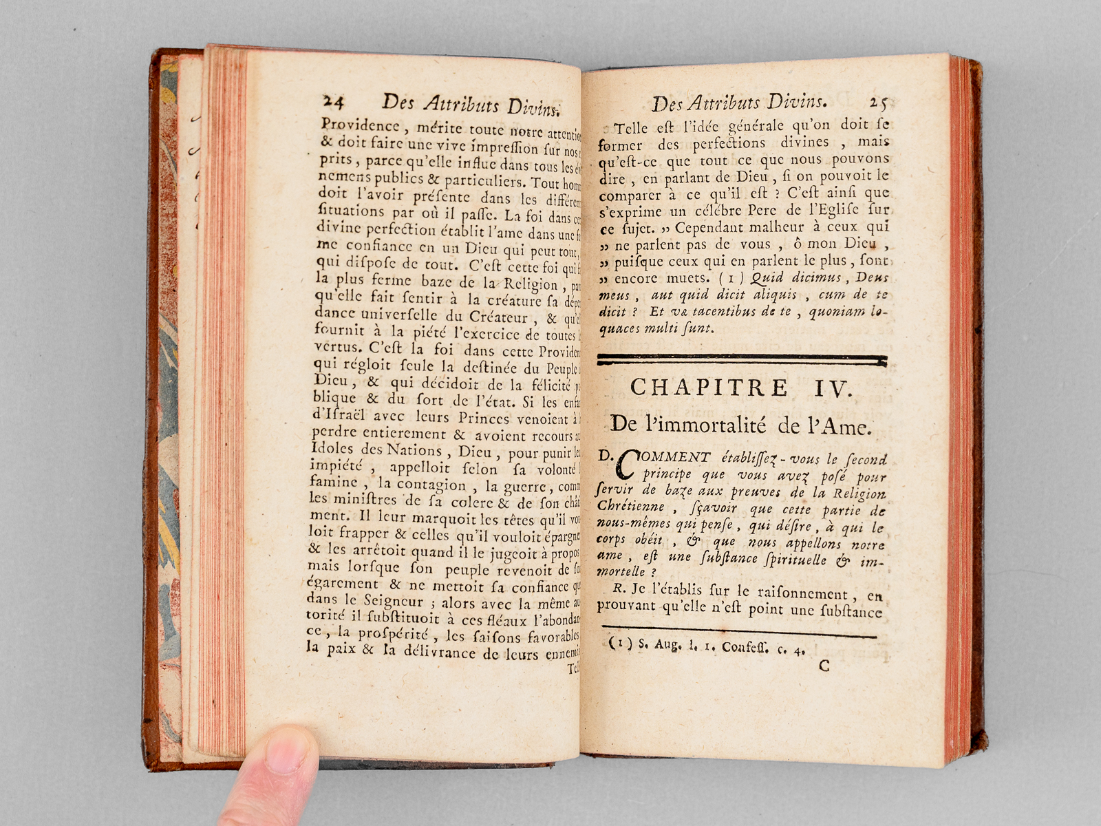 1 vol. in-12 reliure de l'époque pleine basane mouchetée, Chez Babuty fils, Brocas, Humblot, Paris, 1760, XXIV-264 pp. Rappel du titre complet : Les Principes Fondamentaux de la Religion, ou le Catéchisme de l'âge Mûr. Méthode courte & à la portée de tous les Fidèles... & qui désirent se rendre raison des motifs de leur Foi