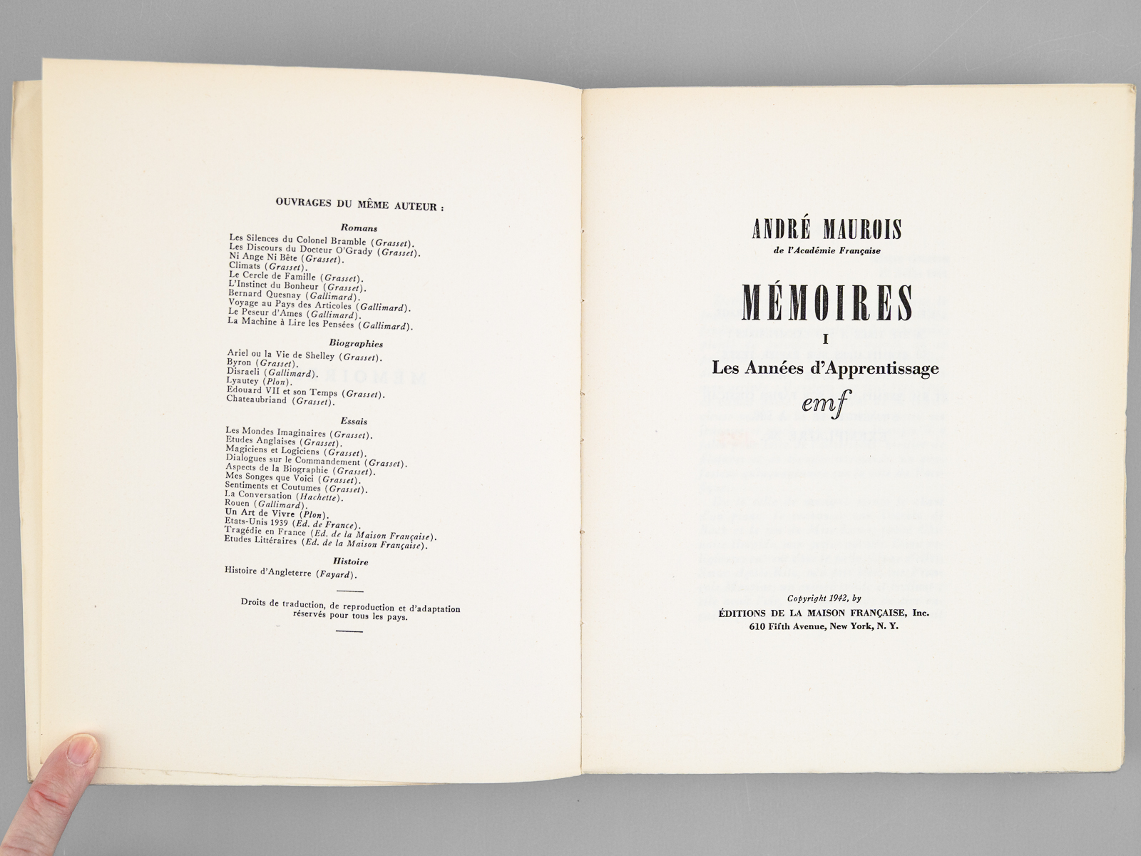 Commentaire : Bel exemplaire en très bel état de l'édition originale à grandes marges de ces superbes Mémoires d'André Maurois.