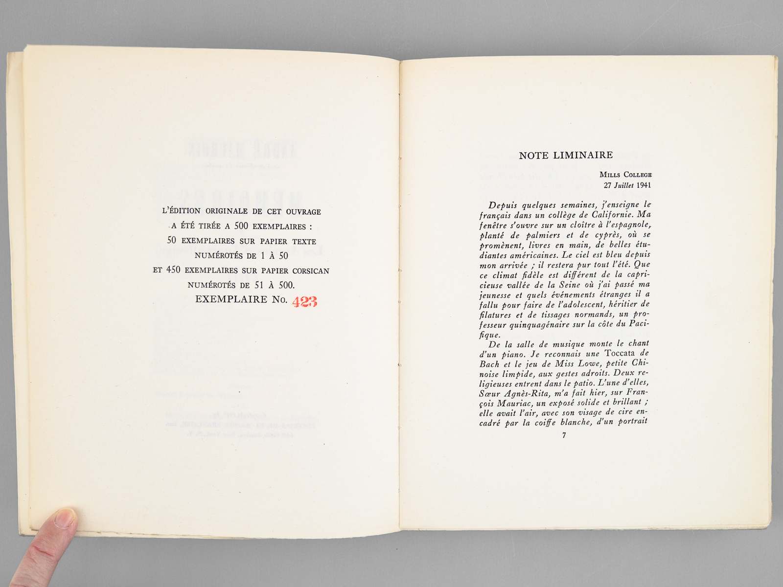 Tirage à 500 exemplaires, un des 450 sur papier Corsican (n° 423), 2 vol. grand in-8 br., EMF, Editions de la Maison Française, Inc., New York, N.Y,, 1942