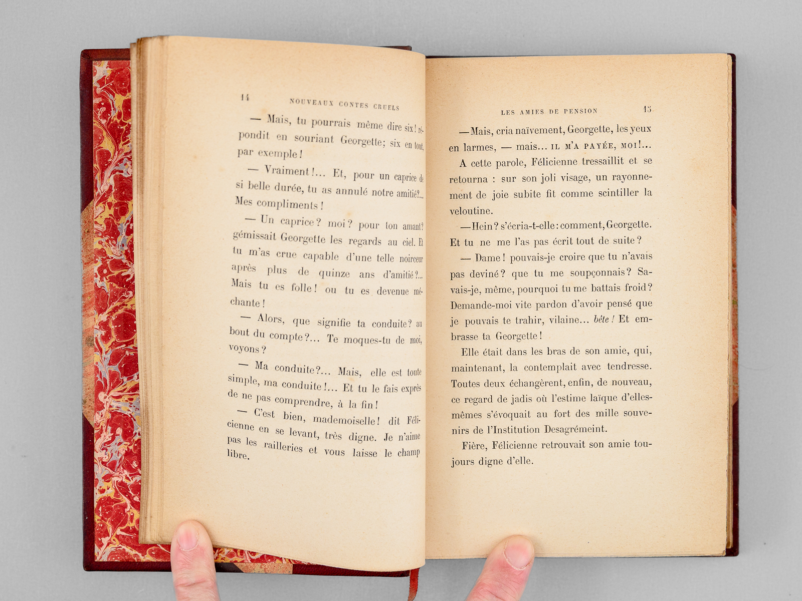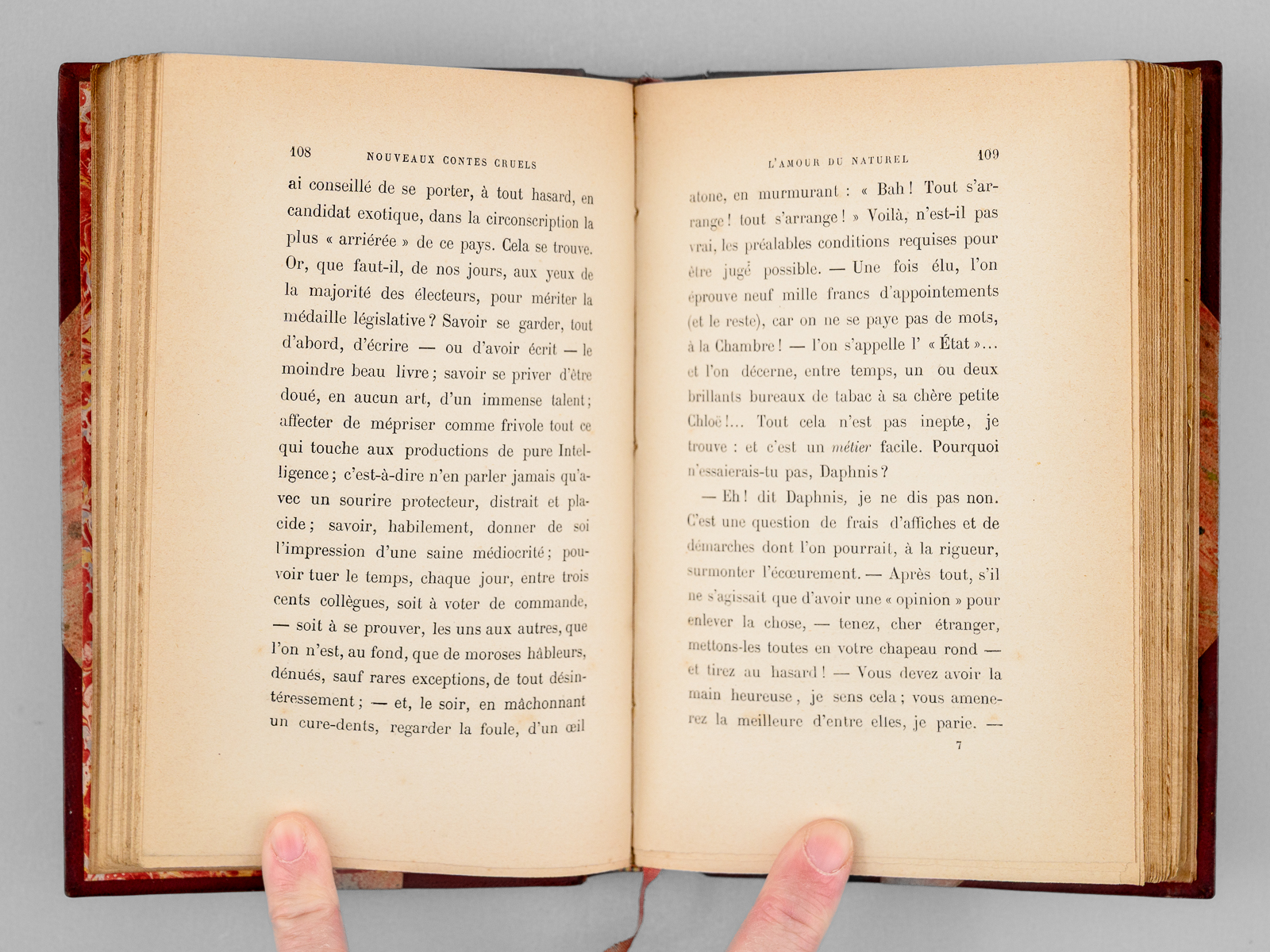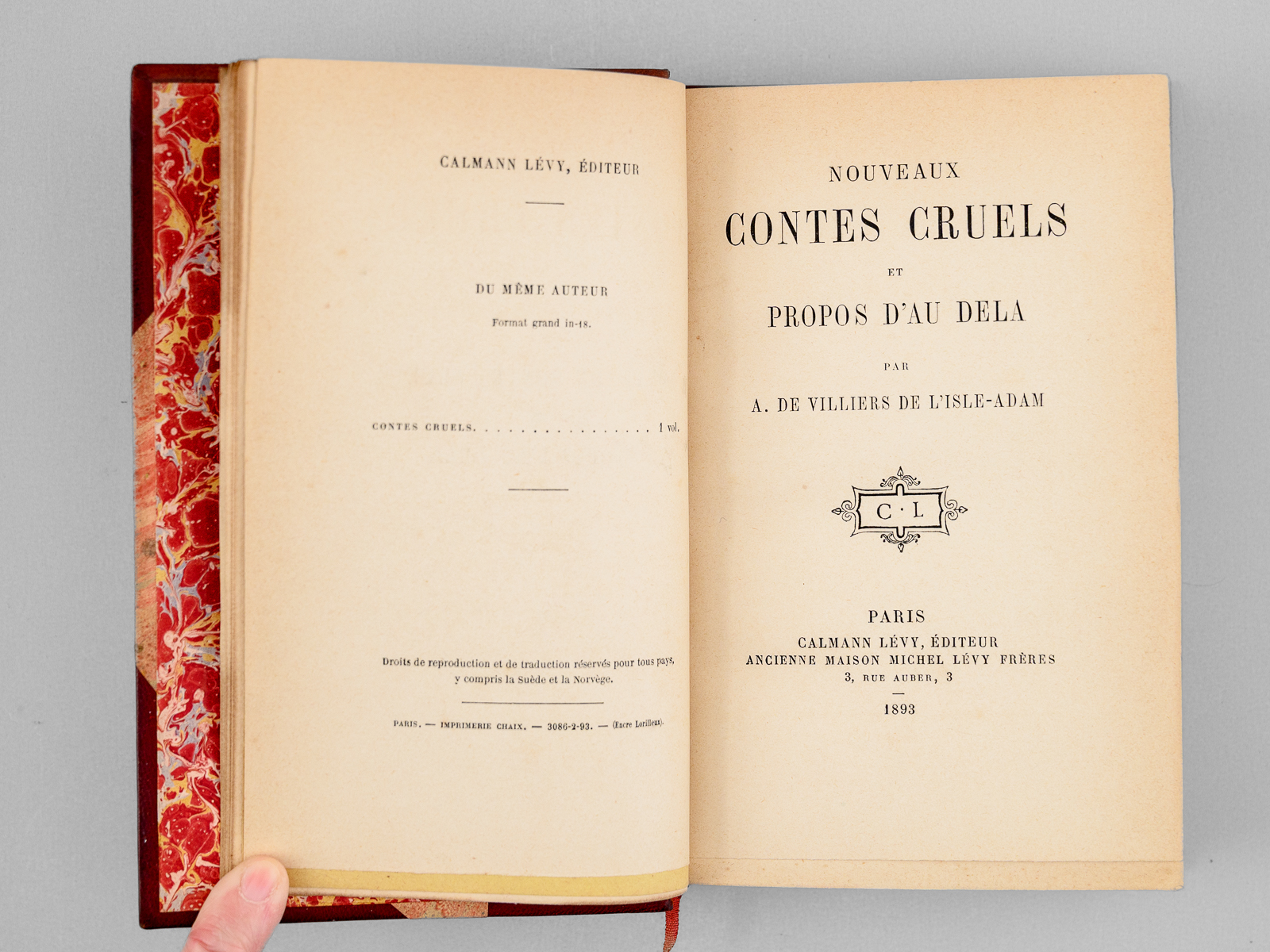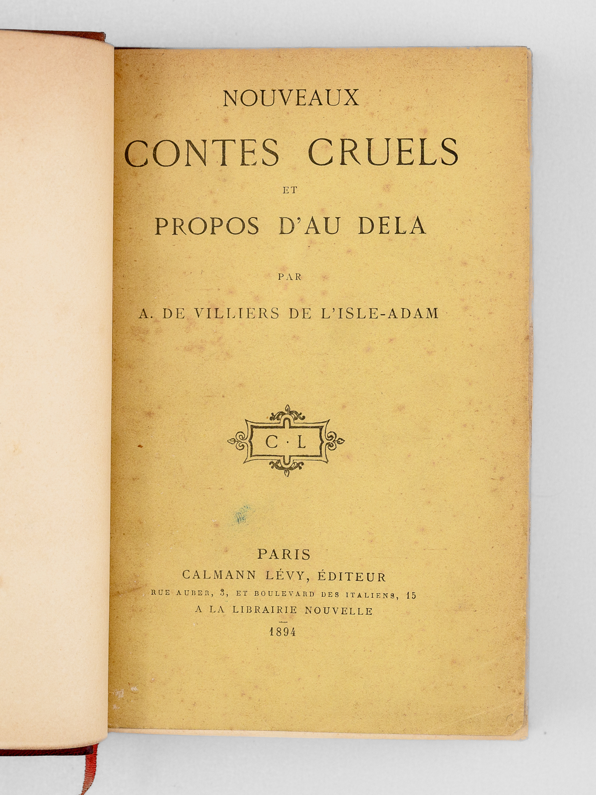 1 vol. in-8 reliure demi-basane à coins lie-de-vin, dos à 4 nerfs orné et estampé à froid, tête dorée, couvertures et dos conservés, reliure signée de Mériot Frères relieurs à Rochefort, Calmann Lévy, Éditeur, Ancienne Maison Michel Lévy Frères, Paris, 1893, 4 ff., 280 pp. Commentaire : Edition en partie originale. L'ouvrage contient les Nouveaux Contes cruels ainsi que les dernières pages écrites par le poète, jusqu'alors inédites en volumes : l'Élu des Rêves, Maître Pied, l'Amour sublime, le Meilleur Amour, les Filles de Milton, ainsi que la première lettre d'un roman épistolaire inachevé de Villiers de l'isle-adam et Judith Gautier. Bon état pour cet exemplaire bien relié.