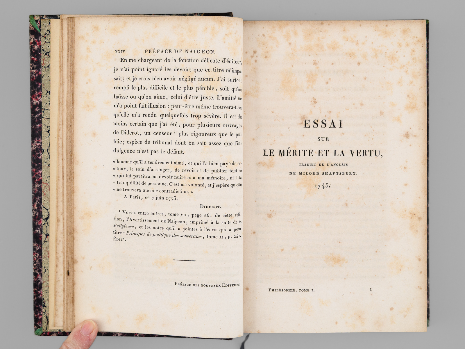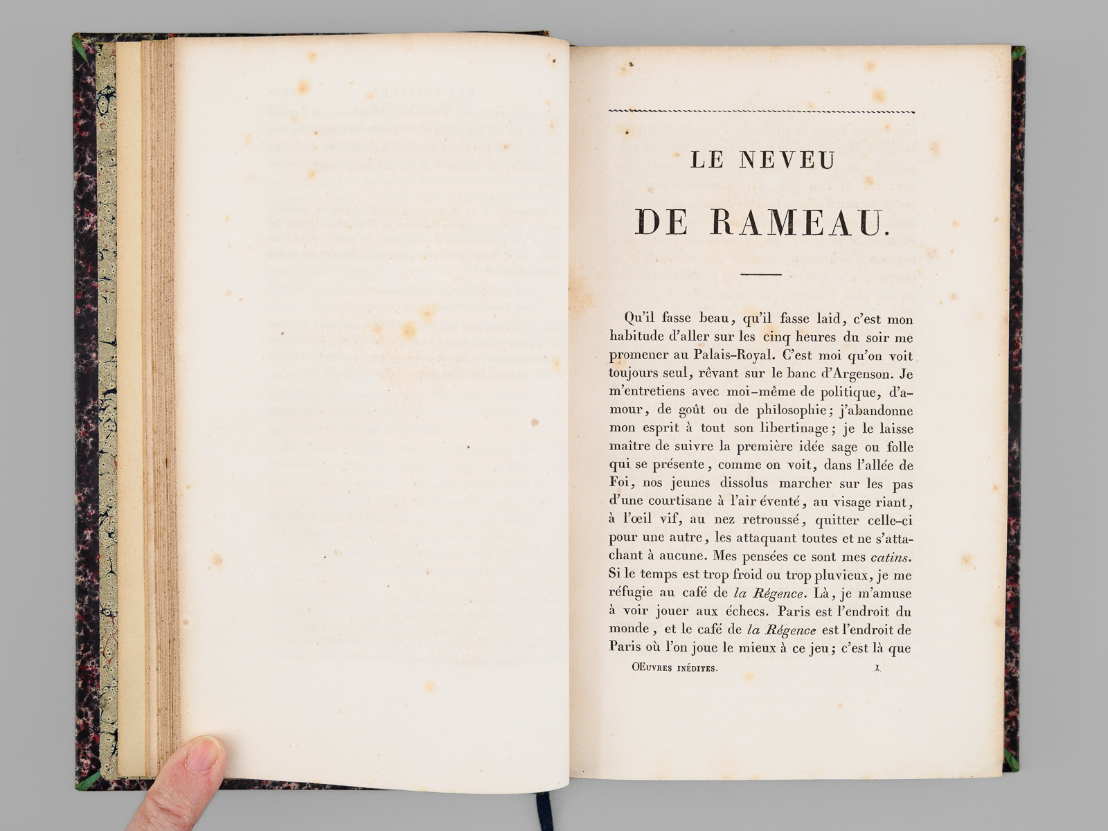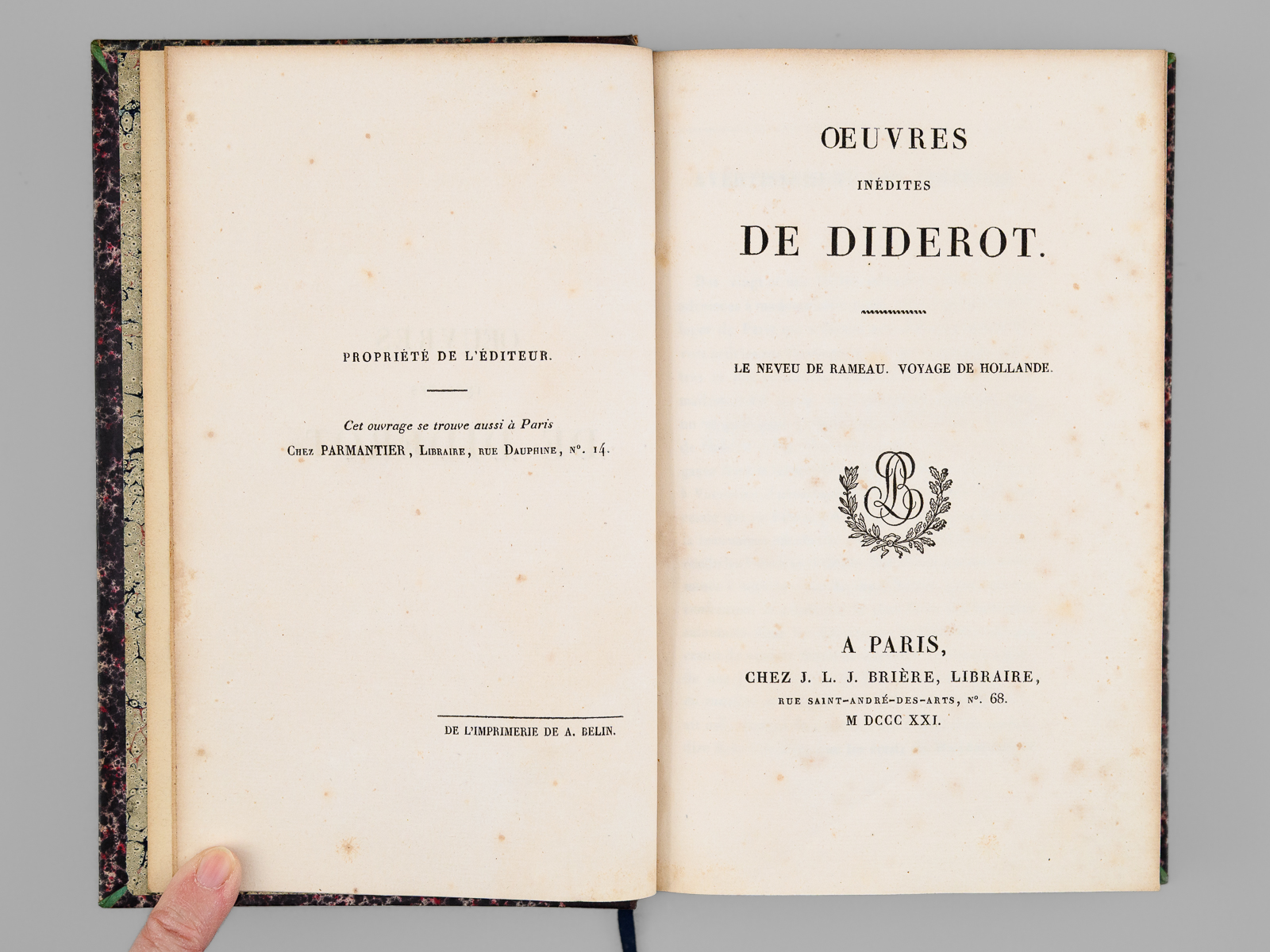 Commentaire : Bel exemplaire des Oeuvres de Diderot, bien complet de la véritable édition originale du 'Neveu de Rameau', publiée par Brière sur le manuscrit original qui lui avait été confié par la fille de Diderot. Bien que la parution n'eut lieu qu'en 1823, Brière a daté le volume, comme le reste de la série, de 1821. Le volume a été relié dans cet ensemble comme le vingt-sixième et dernier, précédé non seulement des Mémoires de Naigeon sur la Vie et les Oeuvres de Diderot, mais également des 4 tomes des 'Mémoires, Correspondance et Ouvrages inédits de Diderot de 1759 à 1780, publiés d'après les manuscrits confiés, en mourant, par l'auteur à Grimm' dans l'édition de Paulin et Mesnier de 1830-1831 (le tome 4 étant dans la deuxième édition augmentée publiée par Paulin seul en 1834). Etablie sur des manuscrits conservés dans le fond Diderot de la bibliothèque de L'Ermitage (Saint-Pétersbourg) dont la copie fut transmises à l'éditeur Jean-Baptiste Paulin, cette dernière série de 4 tomes contient notamment l'édition en partie originale des Lettres à Sophie Volland, et l'édition originale des 'Mémoires pour servir à l'histoire de la vie et des ouvrages de Diderot, par Madame de Vandeul, sa fille'. Bon exemplaire en belle reliure d'époque (un défaut dans le papier a causé un accroc en marge, n'affectant pas le texte, en début du tome 19, qq. rouss., très bon état par ailleurs). Vicaire, III, 255 ; Tchemerzine, IV, 477 (Neveu de Rameau), 478 (Oeuvres chez Brière), 480 (Mémoires chez Paulin)
