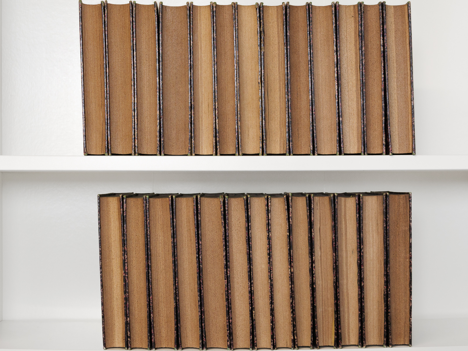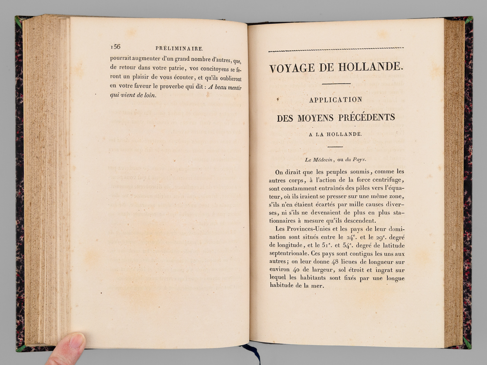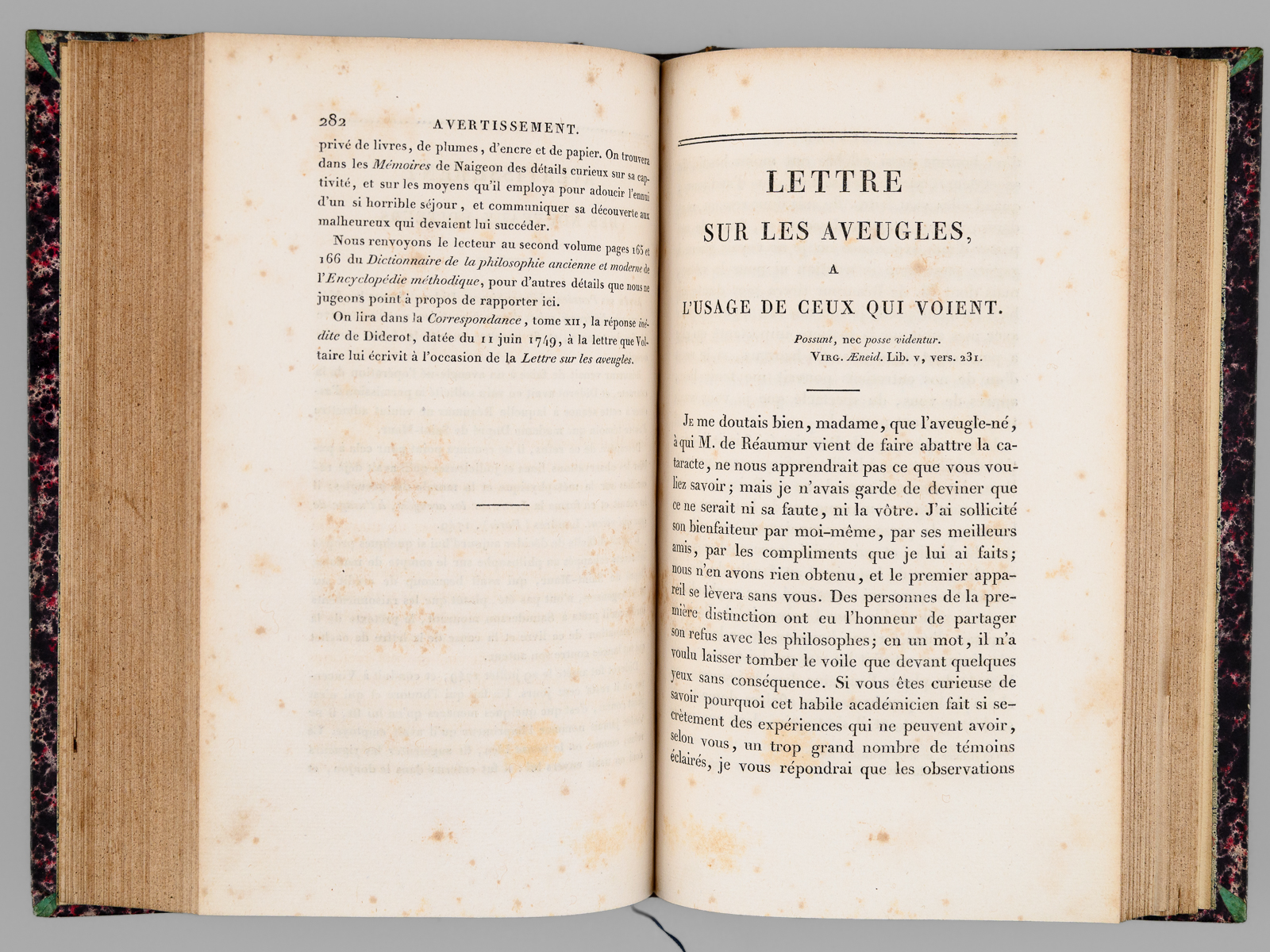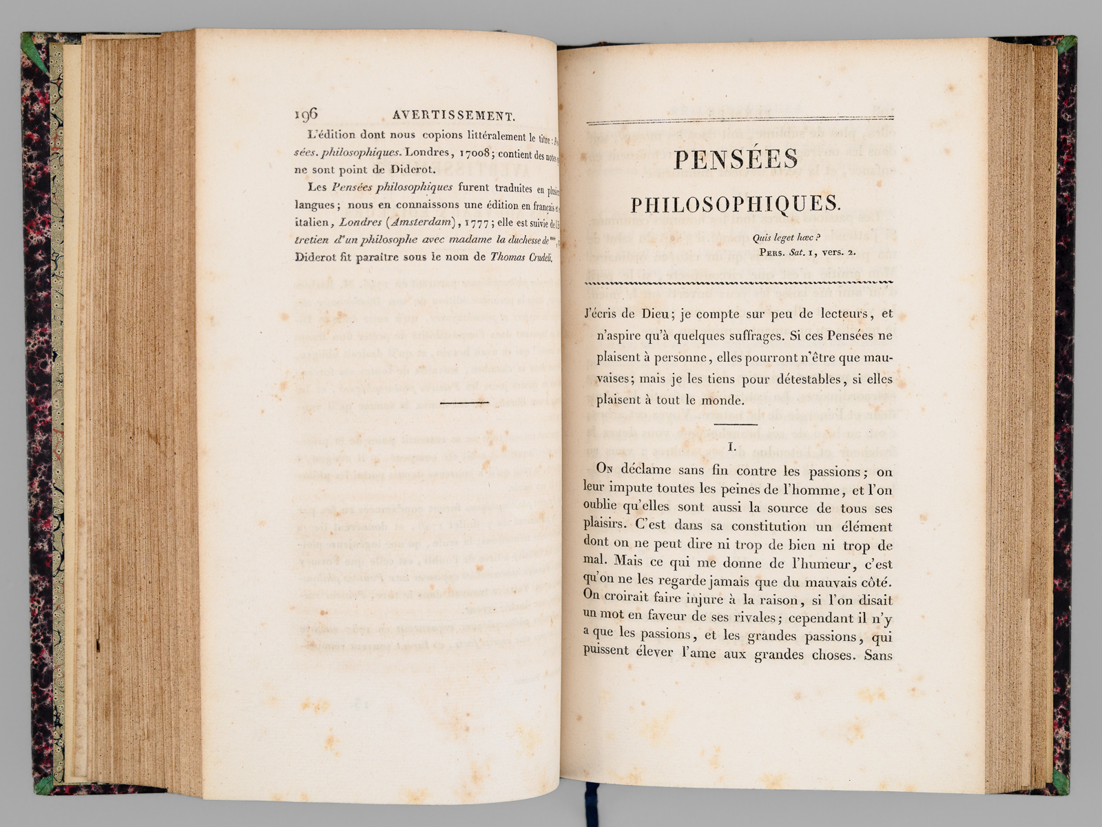 Commentaire : Bel exemplaire des Oeuvres de Diderot, bien complet de la véritable édition originale du 'Neveu de Rameau', publiée par Brière sur le manuscrit original qui lui avait été confié par la fille de Diderot. Bien que la parution n'eut lieu qu'en 1823, Brière a daté le volume, comme le reste de la série, de 1821. Le volume a été relié dans cet ensemble comme le vingt-sixième et dernier, précédé non seulement des Mémoires de Naigeon sur la Vie et les Oeuvres de Diderot, mais également des 4 tomes des 'Mémoires, Correspondance et Ouvrages inédits de Diderot de 1759 à 1780, publiés d'après les manuscrits confiés, en mourant, par l'auteur à Grimm' dans l'édition de Paulin et Mesnier de 1830-1831 (le tome 4 étant dans la deuxième édition augmentée publiée par Paulin seul en 1834). Etablie sur des manuscrits conservés dans le fond Diderot de la bibliothèque de L'Ermitage (Saint-Pétersbourg) dont la copie fut transmises à l'éditeur Jean-Baptiste Paulin, cette dernière série de 4 tomes contient notamment l'édition en partie originale des Lettres à Sophie Volland, et l'édition originale des 'Mémoires pour servir à l'histoire de la vie et des ouvrages de Diderot, par Madame de Vandeul, sa fille'. Bon exemplaire en belle reliure d'époque (un défaut dans le papier a causé un accroc en marge, n'affectant pas le texte, en début du tome 19, qq. rouss., très bon état par ailleurs). Vicaire, III, 255 ; Tchemerzine, IV, 477 (Neveu de Rameau), 478 (Oeuvres chez Brière), 480 (Mémoires chez Paulin)