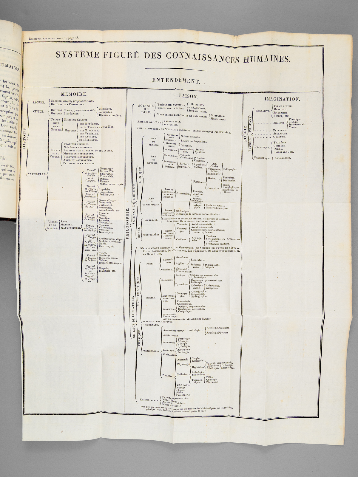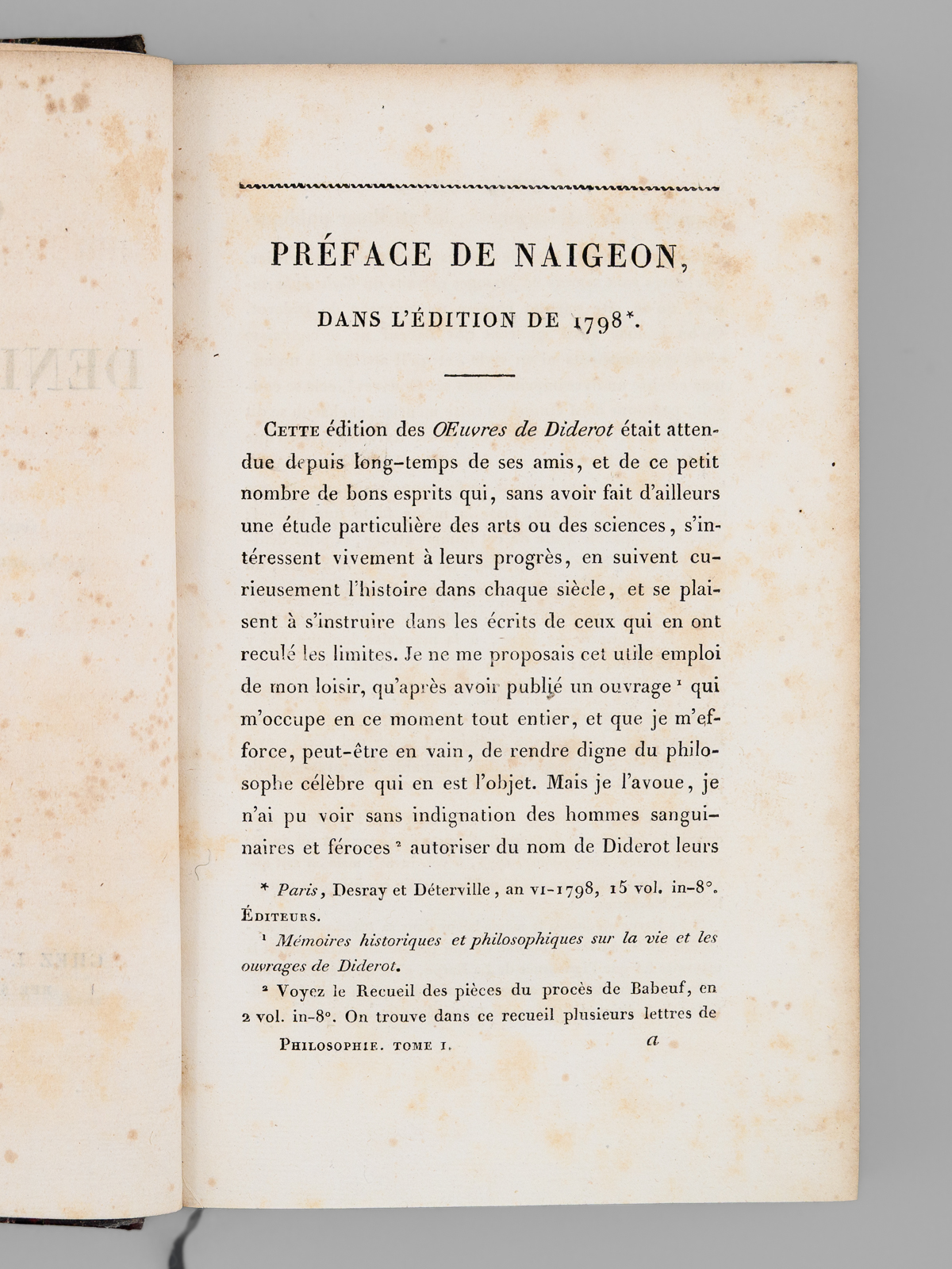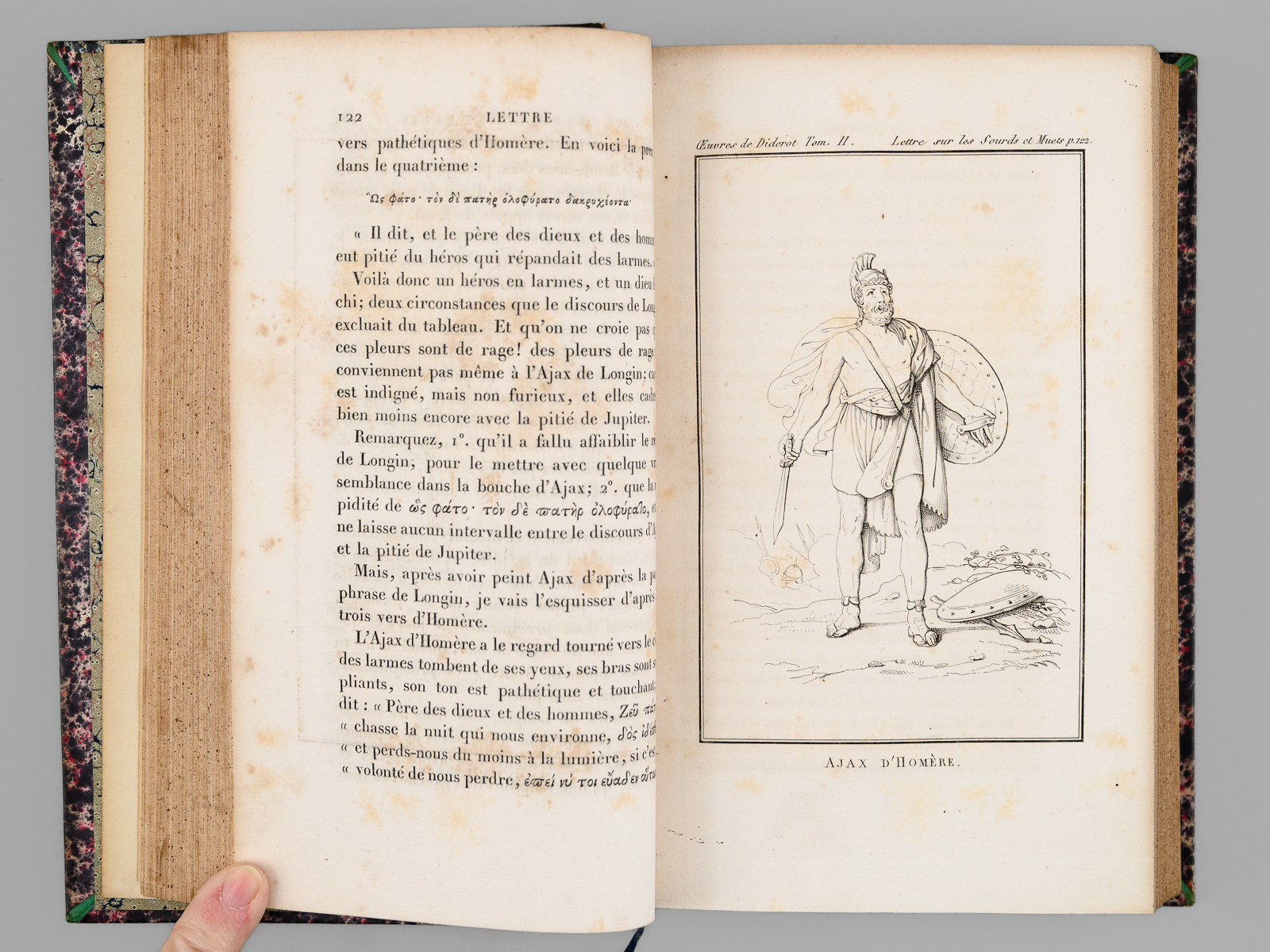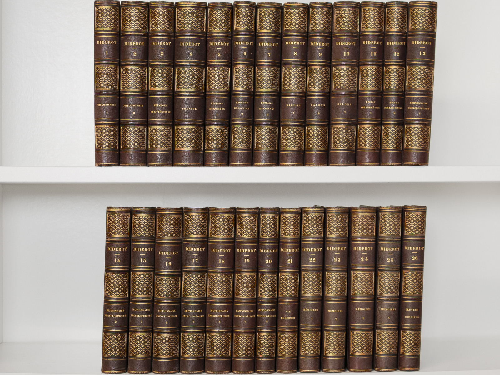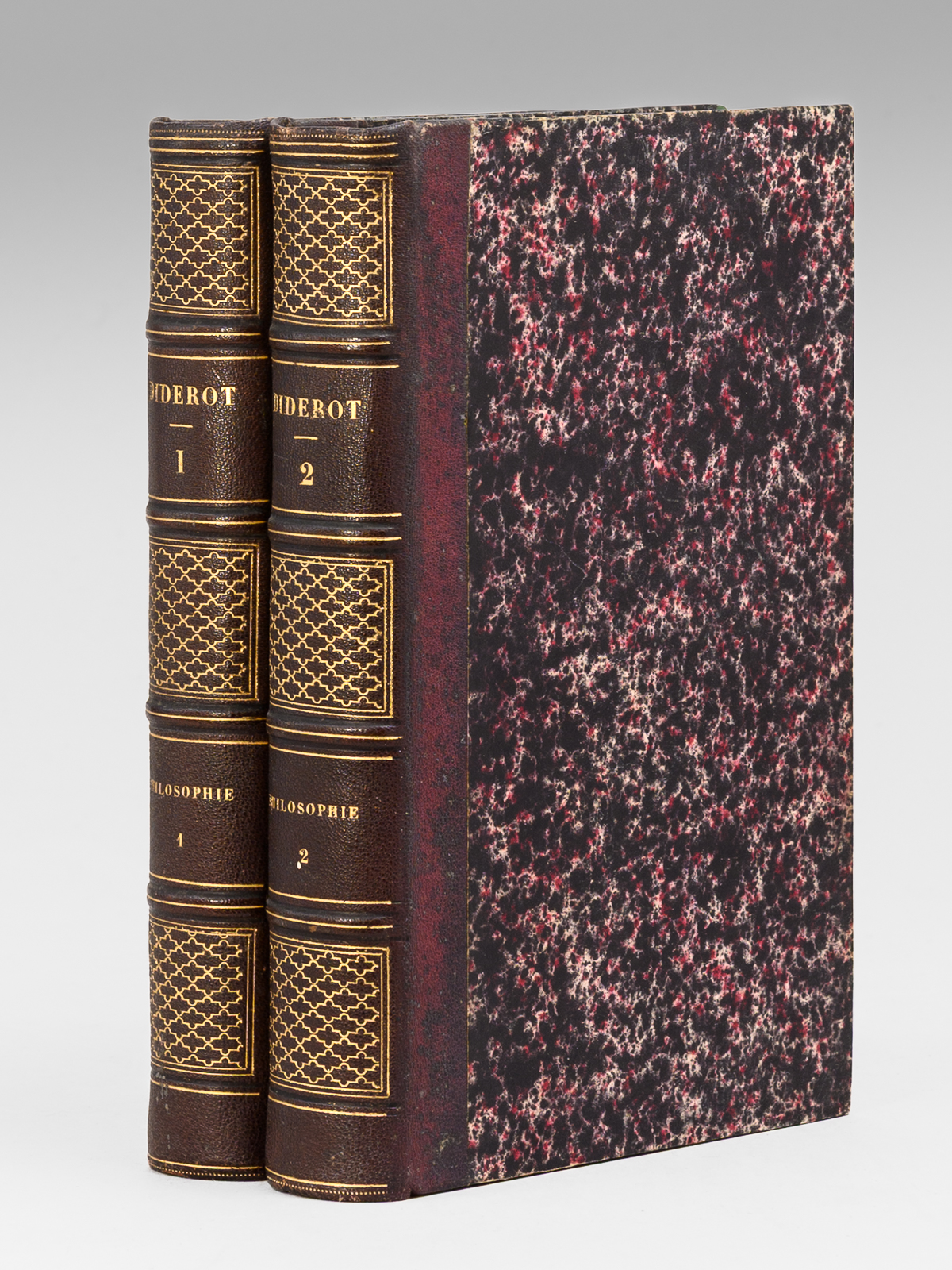 26 vol. in-8 reliure de l'époque demi-chagrin noir, dos à 4 nerfs dorés richement orné, Chez J. L. J. Brière, Paris, 1821 [ Tomes 1 à 21 et 26 ], Paulin, Alexandre Mesnier, Paris, 1831-1831 [ Tomes 22, 23, 24 ], Paulin, Paris, 1834 [Tome 25 : Deuxième édition augmentée ]. Rappel du titre complet et détail des planches : Oeuvres de Denis Diderot (22 Tomes - Complet) [ Avec : ] Mémoires, Correspondance et Ouvrages inédits de Diderot de 1759 à 178, publiés d'après les manuscrits confiés, en mourant, par l'auteur à Grimm (4 Tomes - Complet) [ Ensemble : 26 Volumes ] Tomes 1 et 2 : Philosophie (Tome 1 : Planche I et II dépliante (Système de Saunderson pour les aveugles) ; Tome 2 ; Une planche hors texte) ; Tome 3 : Mélanges de littérature et de philosophie. ; Tome 4 : Théâtre ; Tomes 5, 6, 7 : Romans et Contes ; Tomes 8, 9, 10 : Salons ; Mathématiques (Tome 10 : 3 planches dont une dépliante) ; Tomes 11 et 12 : Essai sur les règnes de Claude et de Néron ; Essai sur les études en Russie ; Plan d'une université pour le gouvernement de Russie ; Correspondance ; Tomes 13 à 20 : Dictionnaire encyclopédique (Tome 13 : Tableau dépliant du Système figuré des connaissances humaines ) ; Tome 21 : Mémoires historiques et philosophiques sur la Vie et les Ouvrages de D. Diderot par J. A. Naigeon (Tome 21 : Portrait de Denis Diderot par Mme Therbouche 1823, gravé par Bertonnier ) ; Tomes 22 à 25 : Mémoires, Correspondance et Ouvrages inédits de Diderot de 1759 à 1780, publiés d'après les manuscrits confiés, en mourant, par l'auteur à Grimm ; Tome 26 : Oeuvres inédites de Diderot : Le Neveu de Rameau. Voyage de Hollande. Correspondance. Table générale et analytique des matières contenues dans les Oeuvres de Diderot.