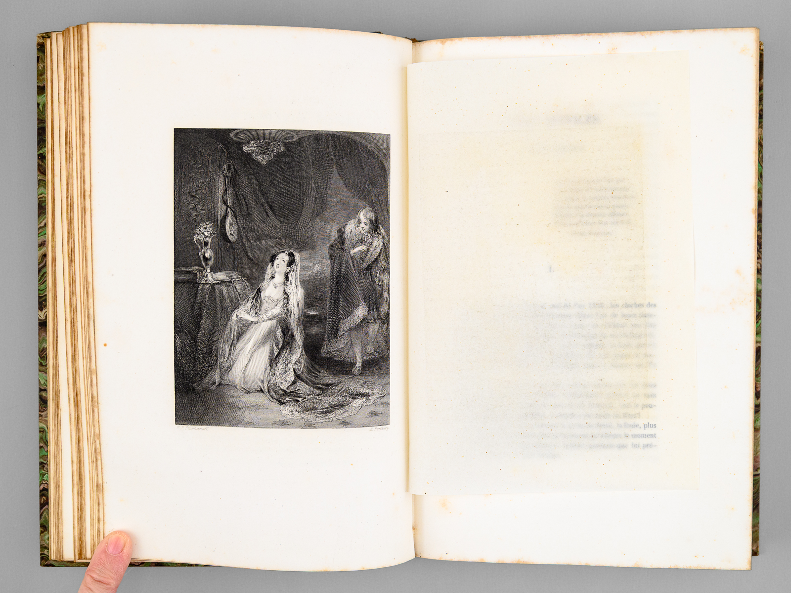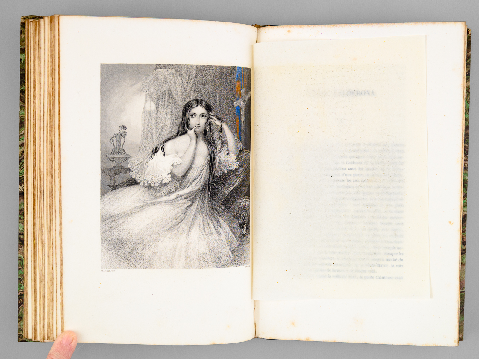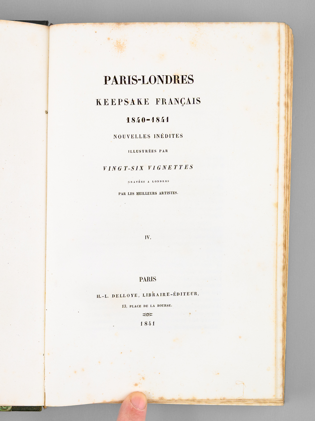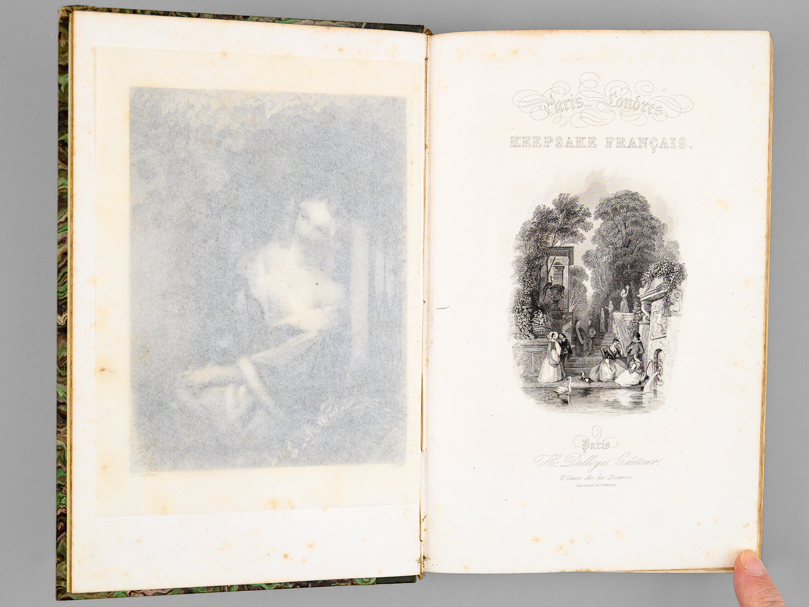 1 vol. in-8 reliure de l'époque demi-chagrin vert, dos lisse orné en long, toutes tranches dorées, triple filet doré en mors, reliure signée de Boutigny, H.-L. Delloye, Paris, s.d. [ 1841 ], 2 ff., 236 pp. avec 26 planches hors texte (y compris le titre gravé) Commentaire : Charmant keepsake relié par Boutigny. Actif de 1830 à 1865, Boutigny fut notamment le relieur habituel d'Honoré de Balzac, et contribua au succès des belles reliures de keepsake. Bon état (petites usures en coins, coiffe sup. très lég. frottée, bon exemplaire par ailleurs). Fléty, 32 ; Lachèvre, 105
