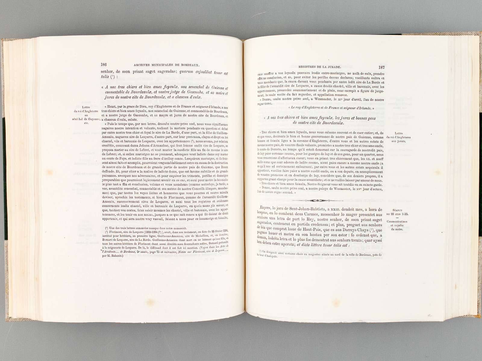 2 vol. in-4 reliure postérieure demi-toile à coins, dos muet, couvertures conservées, collection Archives Municipales de Bordeaux, Tomes 3 et 4, Imprimerie G. Gounouilhou, Bordeaux, 1873 et 1884, XXVI-534 pp. ; XXXII-773 pp. Commentaire : Bons exemplaires (dos muets, ancien cachet d'ex-libris dans le premier volume, bel exemplaire par ailleurs) très solidement établis dans des reliures permettant un maniement très aisé. Les deux volumes se font suite dans la collection des 'Archives Municipales de Bordeaux', et sont les seuls relatifs aux Registres de la Jurade pour les délibérations antérieures au XVIe siècle. Voir également dans notre catalogue la rare série des 8 volumes de 'l'Inventaire Sommaire des Registres de La Jurade 1520 à 1783'.