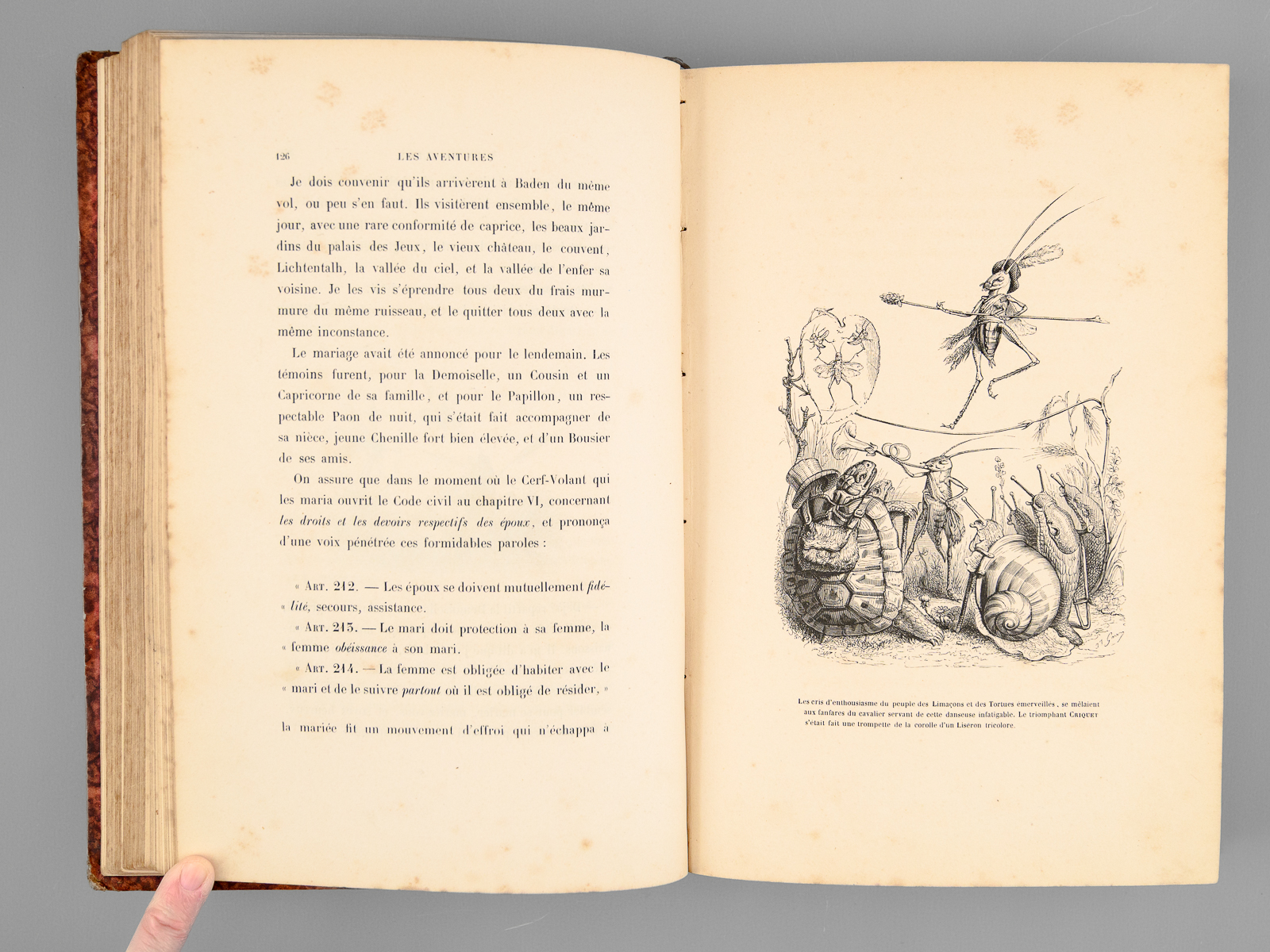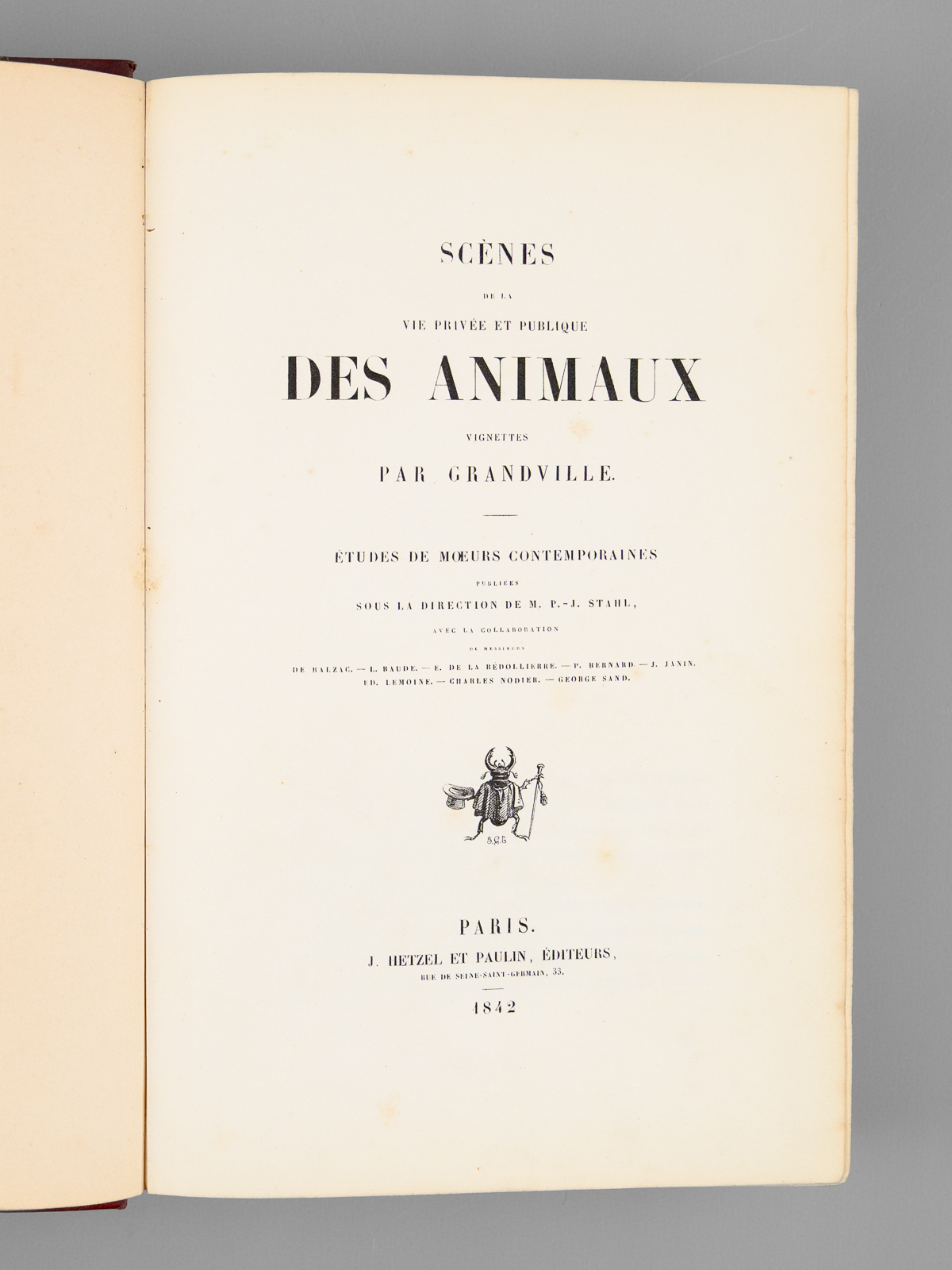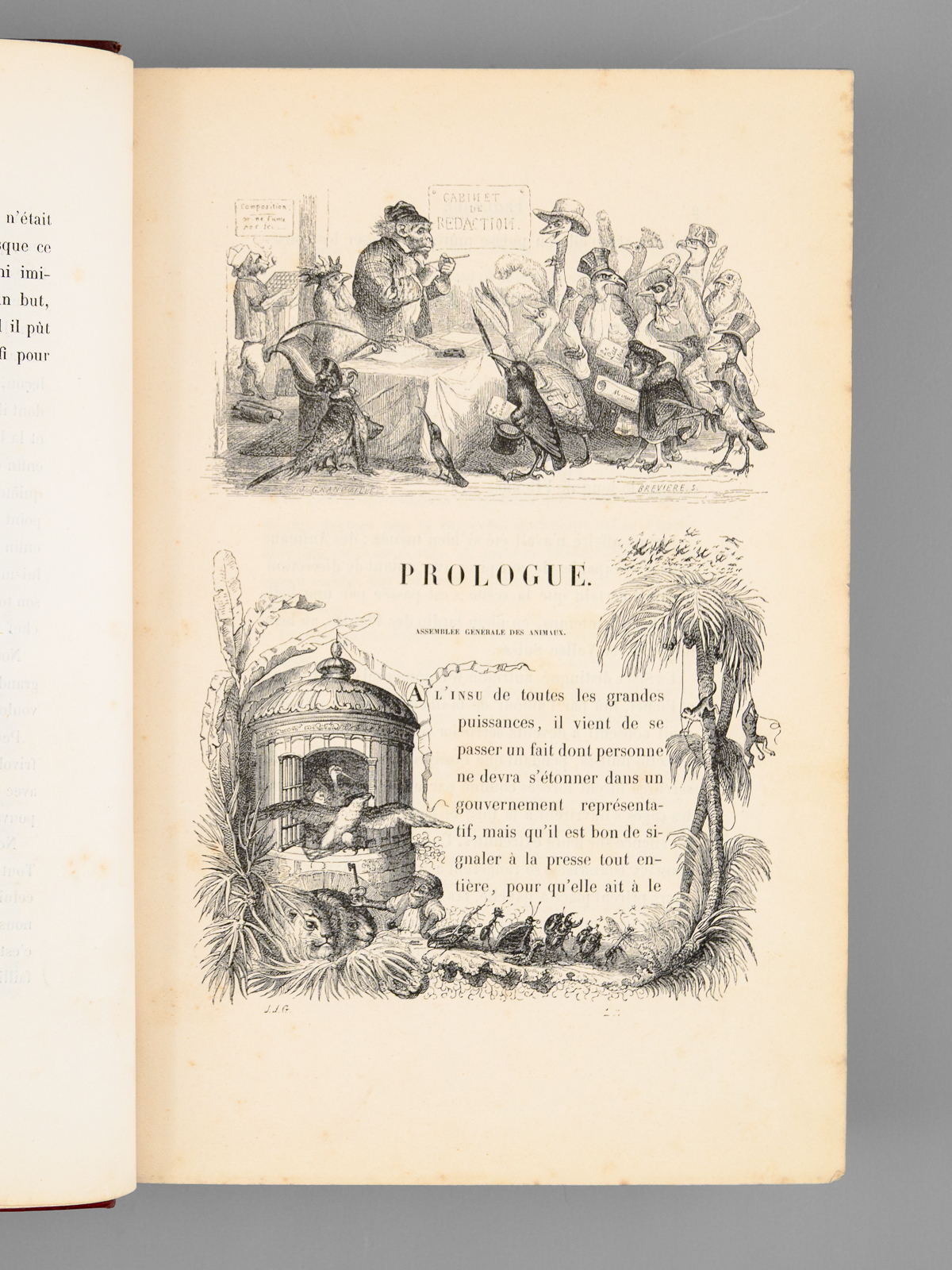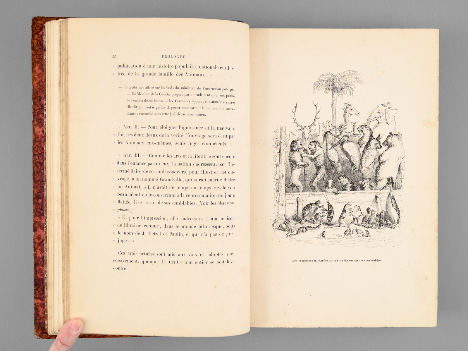 Vignettes par Grandville, 2 vol. grand in-8 reliure demi-maroquin rouge, dos à 4 nerfs, Tome I : J. Hetzel et Paulin, Paris, 1842, 4 ff., 386 pp. et 3 ff. n. ch. et 1 f. blanc, avec 96 planches hors texte, Tome II : J. Hetzel, 1842, 2 ff., 390 pp., 3 ff. n. ch. et 1 f. blanc avec 105 planches hors texte