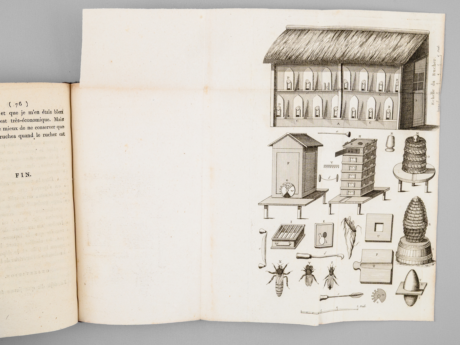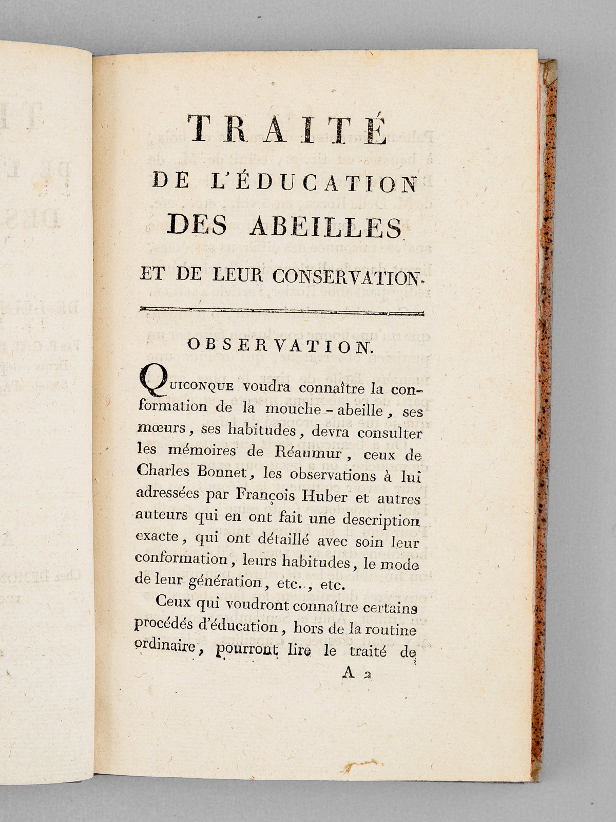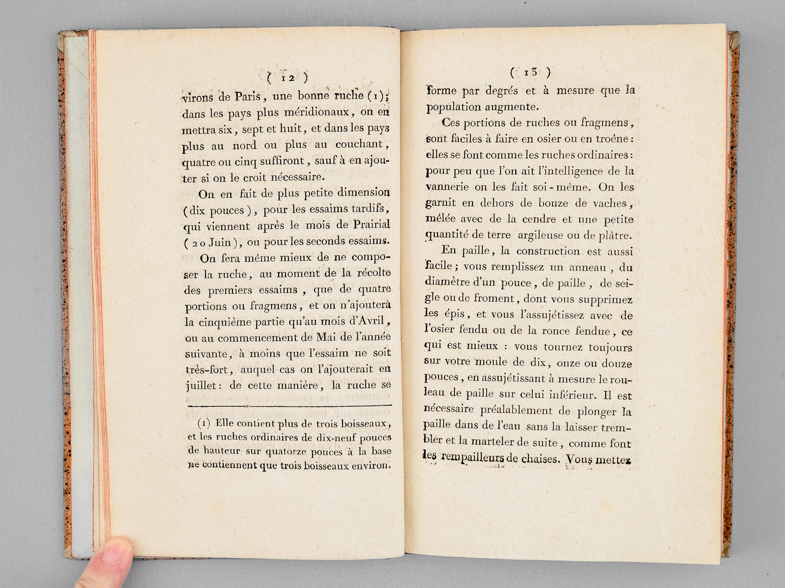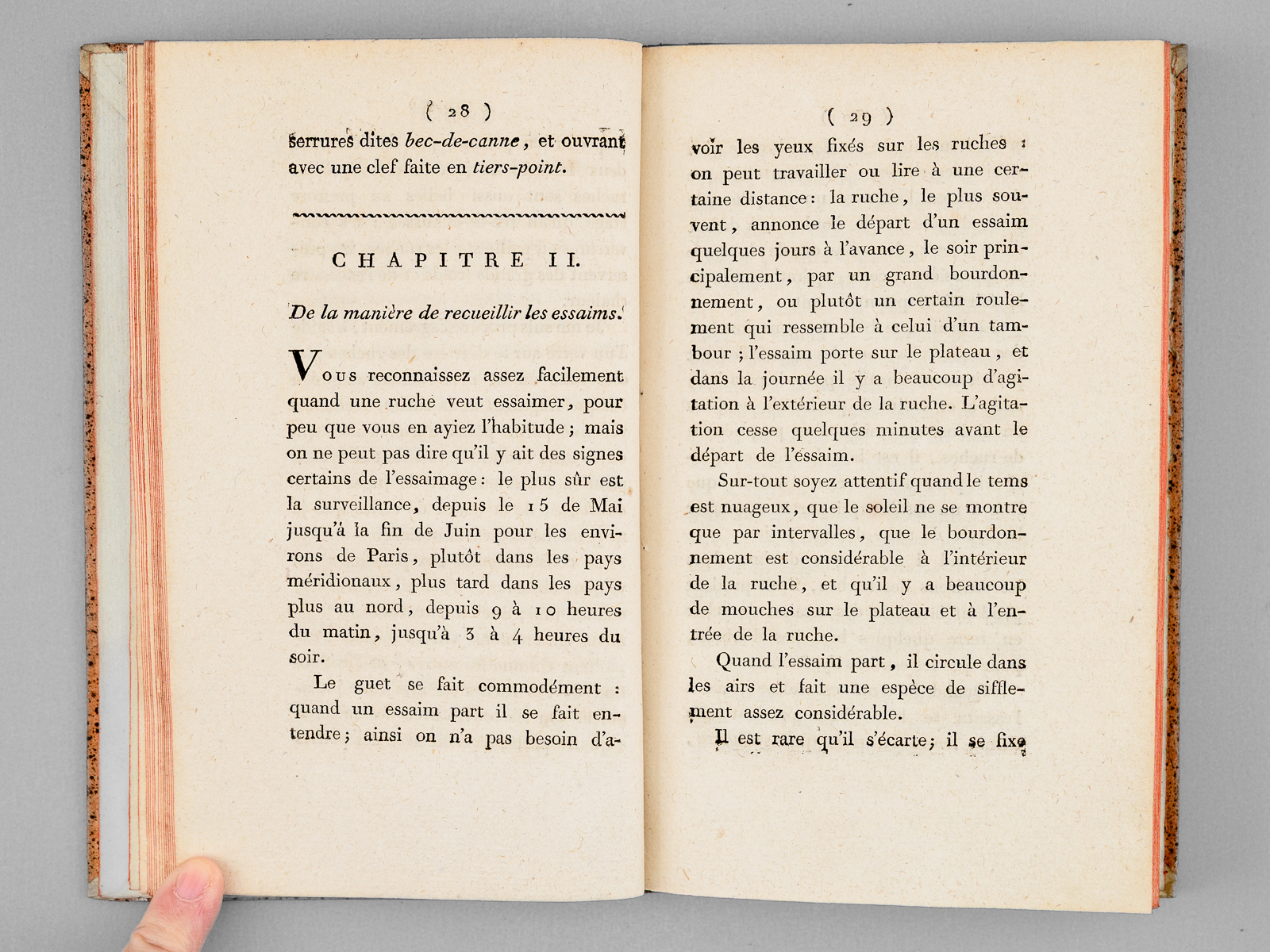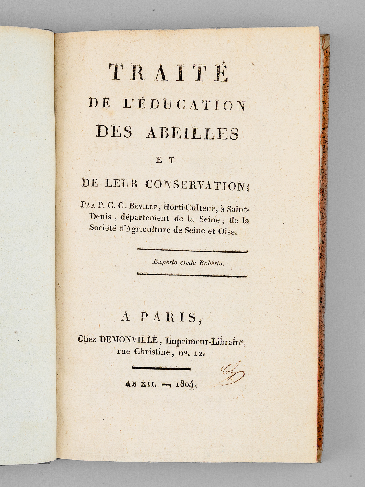 1 vol. in-8 reliure de l'époque demi-basane racinée, dos lisse orné, Chez Demonville, Paris, An XII - 1804, 76 pp. et 1 f. (explication de la planche et table) avec une planche dépliante Commentaire : Très rare exemplaire en bonne reliure d'époque de ce beau traité. L'ouvrage débute par une description détaillée de l'habitat des abeilles (nommées « Mouches-Abeilles ) : forme des ruches, couverture, plateau, entrée et exposition. L'ouvrage traite ensuite de la récolte des essaims avant de proposer des méthodes d'exploitation respectueuses permettant de récolter le miel sans détruire la colonie. Il contient également un 'manuel pratique pour chaque mois de l'année', détaille les ustensiles nécessaires et les procédés de transformation du miel et de la cire ; enfin, il propose une recette de sirop pour nourrir les insectes et se conclut par une table d'explication des illustrations techniques. Bon exemplaire (très petit accroc en coiffe sup., très bon état par ailleurs).
